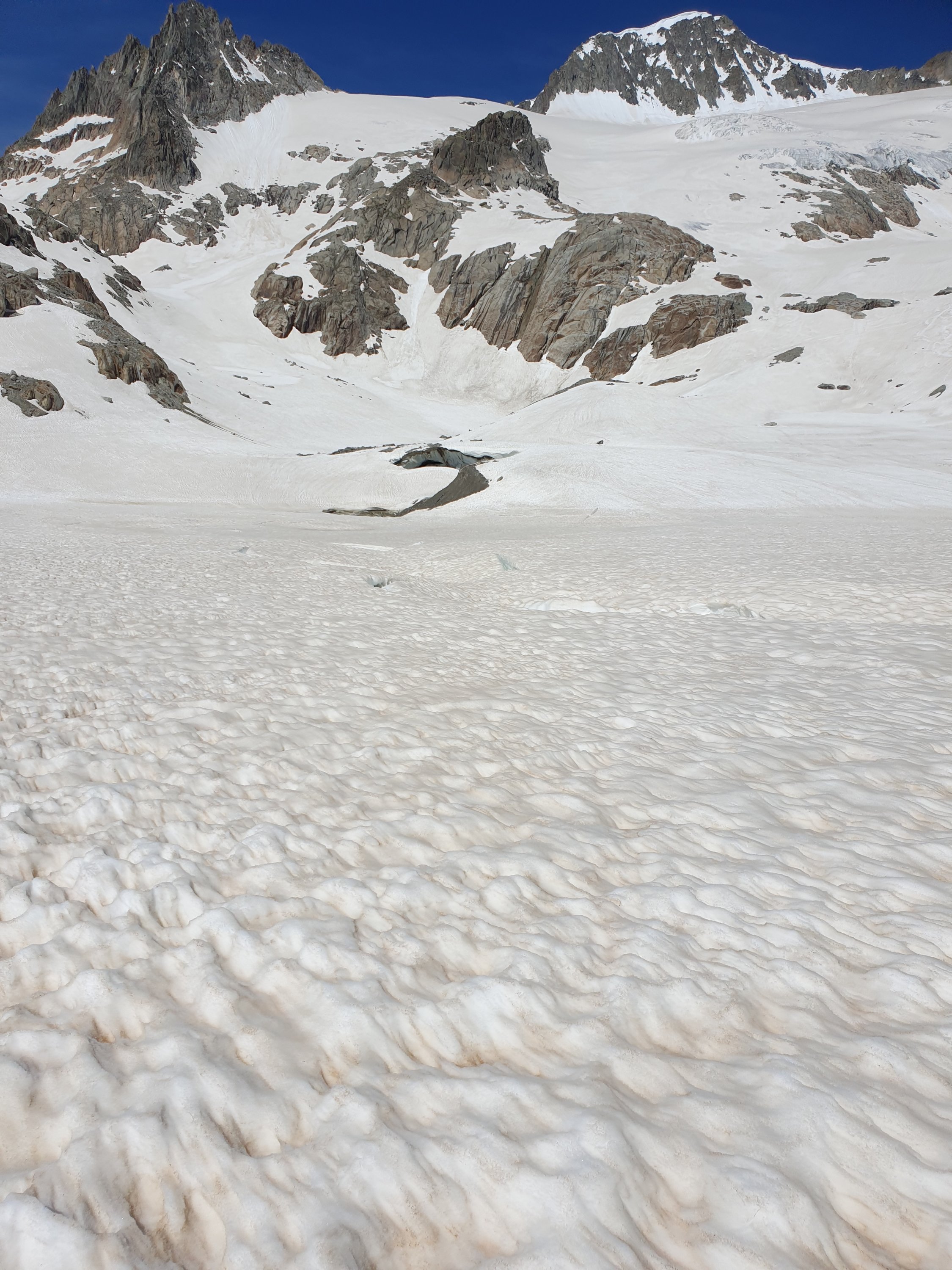Morgens war der Schnee auch für Bergschuhe noch gut tragend (meistens nur 5-10cm einsinken), ab 10 Uhr in der Sonne war er mit Schneeschuhen (oder Ski) sicher viel angenehmer (in dem Fall auch nur 5-10cm tief). Nur in der Mitte des Tiefengletschers einige Spalten offen, auf der Tour selbst keine zu spüren.