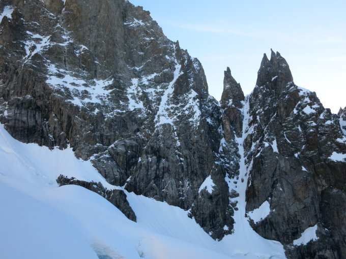 Wir sind über das Schneidercoulouir von der Monzinohütte gegangen. Es liegt noch viel Schnee. Die Stände beim Abseilen vom Col de l’innominatta waren gut zu finden. Die Querung des Gletscher war gut. Nur nicht zu früh queren. Wir sind gut 100 bis 150 hm aufgestiegen und querten dann. Das Schneidercoulouir war super eingeschneit. Bis oben Schnee. Denn in die andere Flanke eingestiegen und die dritte Rippe nach oben. Am Turm sind wir einen kleinen Riss rechts nach oben. Dann auf dem Grat in tiefem Schnee auf den Gipfel. Die nachfolgende Querung war top. Der Schnee trug bestens. Dann mit der neuen Abseilpiste (25m) ca 5 mal abseilen . Am Col de Peuterey haben wir übernachtet. Mo gegen 4:30 Uhr durch die Rinne auf den Grand Piller d'Angle. Die Rinne hatte wenig Schnee und etwas Blankeis. Der Grat dann gut gehbar aber auch tief eingesunken mit Stollen und dann wieder blank. Der Linie des Grates unbedingt folgen. Rechts davon haben wir Steinschlag gehabt. Ausstieg ist auch gut. Wir haben einen Teil der Wächte in die Tiefe geschickt. Achtung: das Eccles Biwak ist nochmal beschädigt worden. Das erzählte uns der Hüttenwart der Gonellahütte, es gibt wohl nur noch sechs Plätze. So die Info. Meinem Bergführer Michi Stacheder von Mountain Elements möchte ich mich besonders danken. Mit ihm habe ich jetzt alle 82 4000er geschafft.