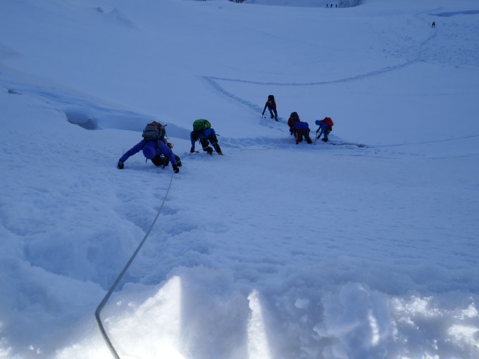 Es sieht nach mehr Schnee aus, als es ist. Steilere Partien apern aus und unter der prinzipiell noch mächtigen (und sonnig sumpfigen!) Schneedecke lauert stellenweise schon das Eis. W-Flanke Castor noch komplett im Firn möglich, aber wohl nicht mehr lange. Spur zur Ayas in der Sonne Sumpf. Verhältnisse am Pollux perfekt, noch geht das Schneecouli mit Spur.
