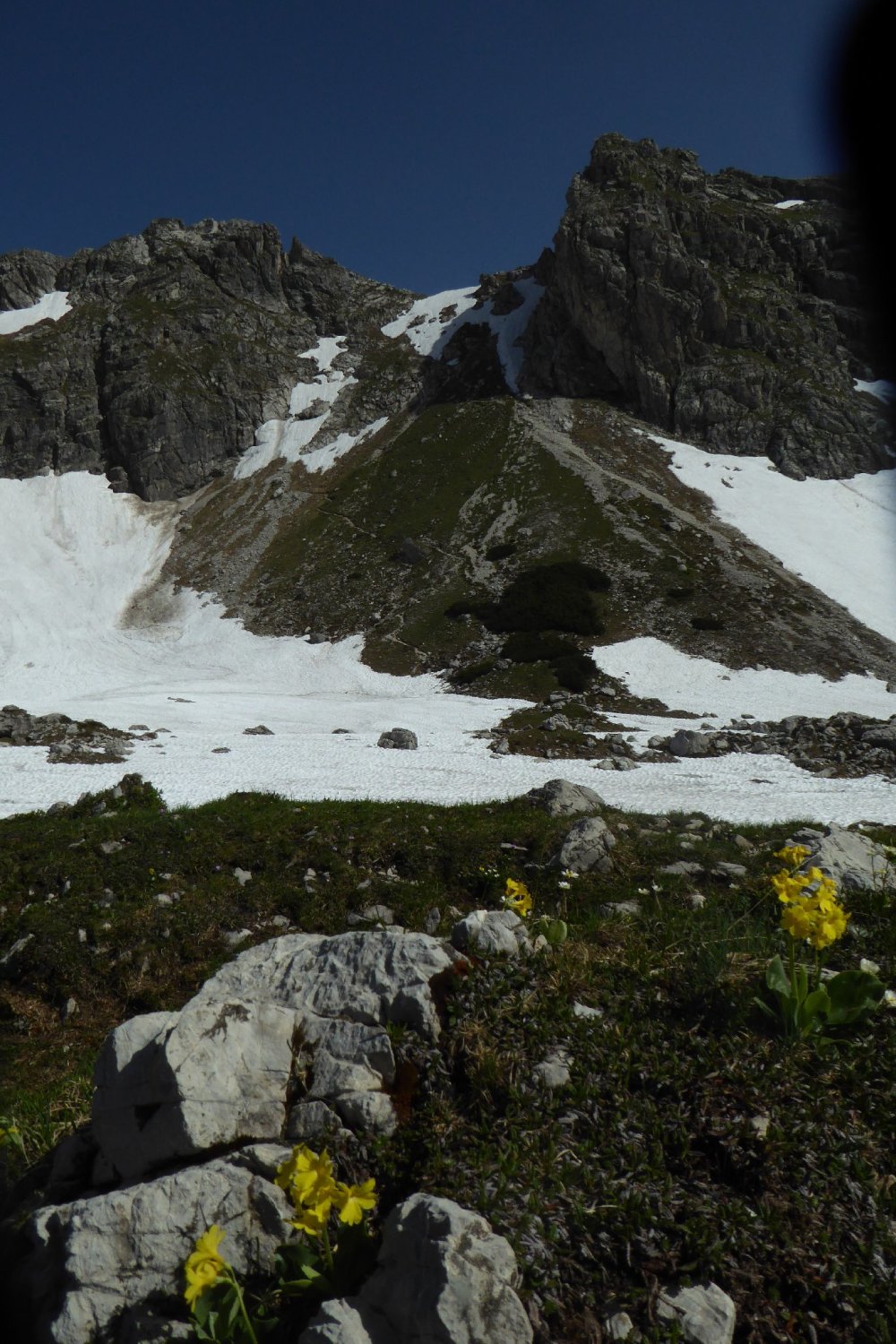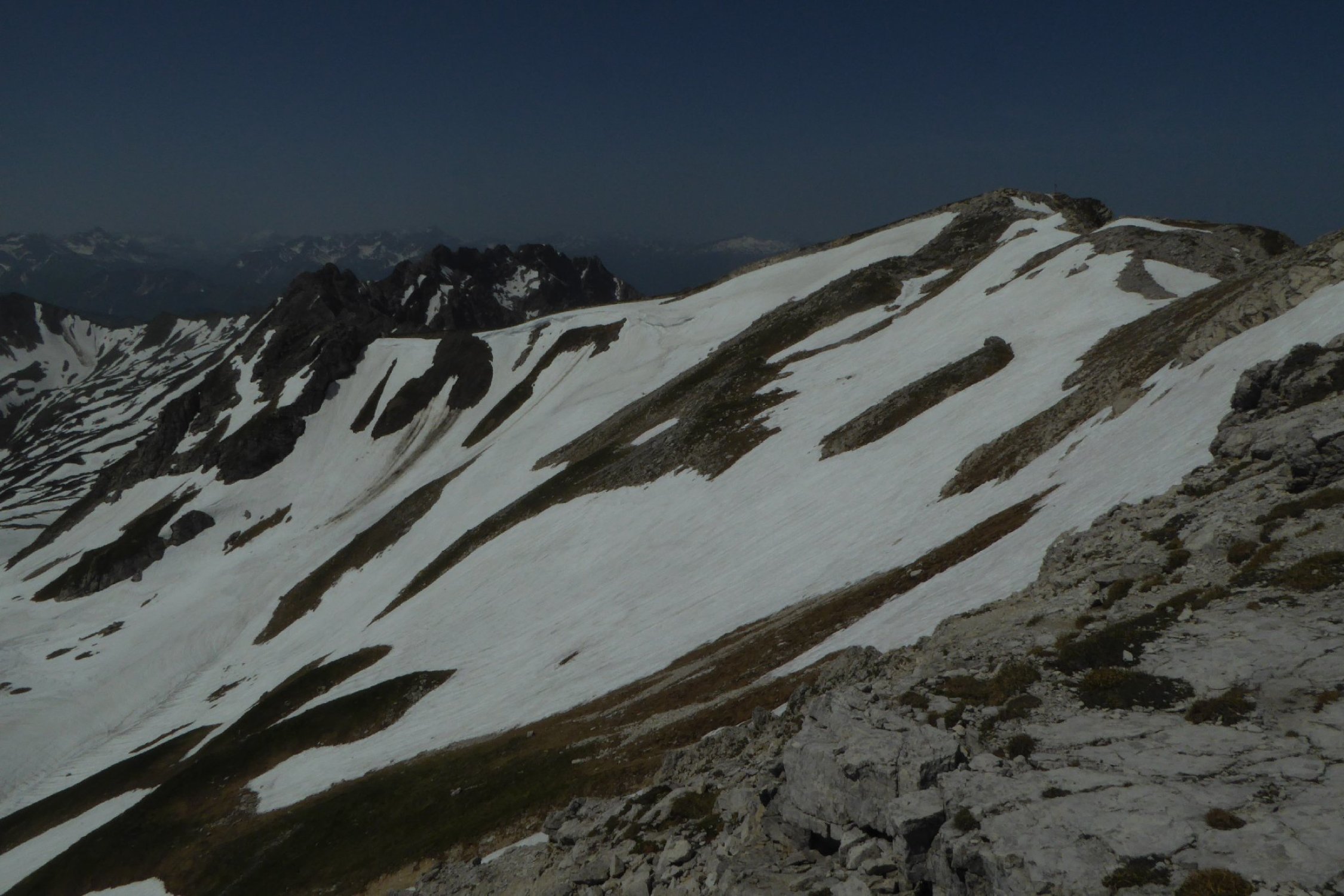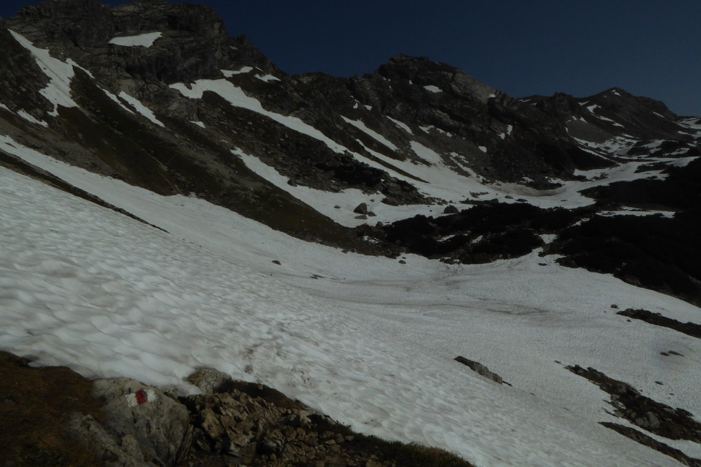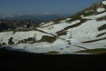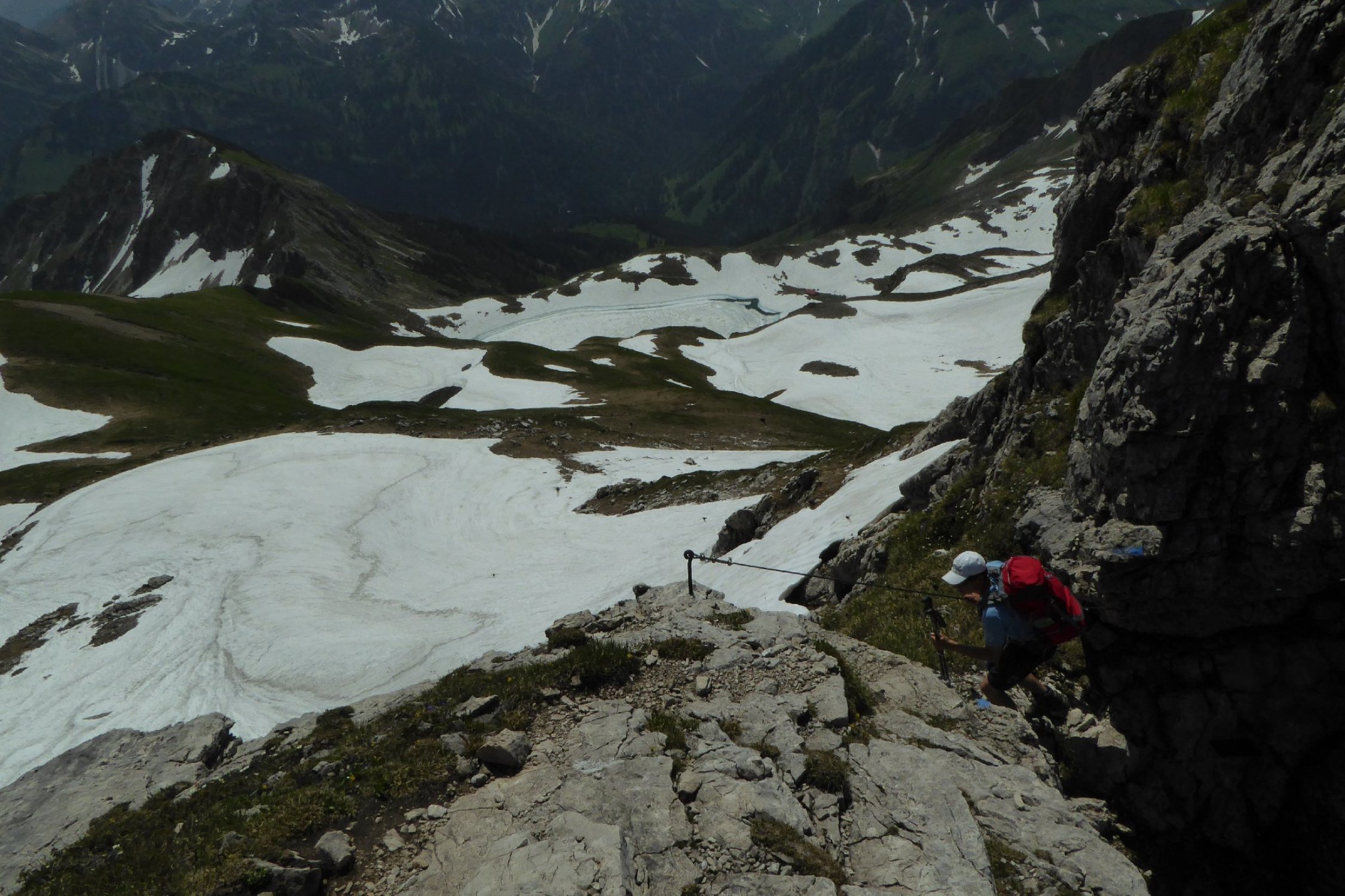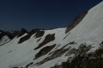 Es hat noch viel gut zu begehender welligen Altschnee. Einige Stellen wie der Einstieg auf Sommerlinie vom Hölzlesattel und der Ausstieg in Sattel am Ende des Hindelanger KS vorbei an Eindrucksvoller Wechte, erfordert doch den etwas sicheren Geher. Ansonsten viel abkürzen und abrutschen möglich, vor allem im Abstieg.
