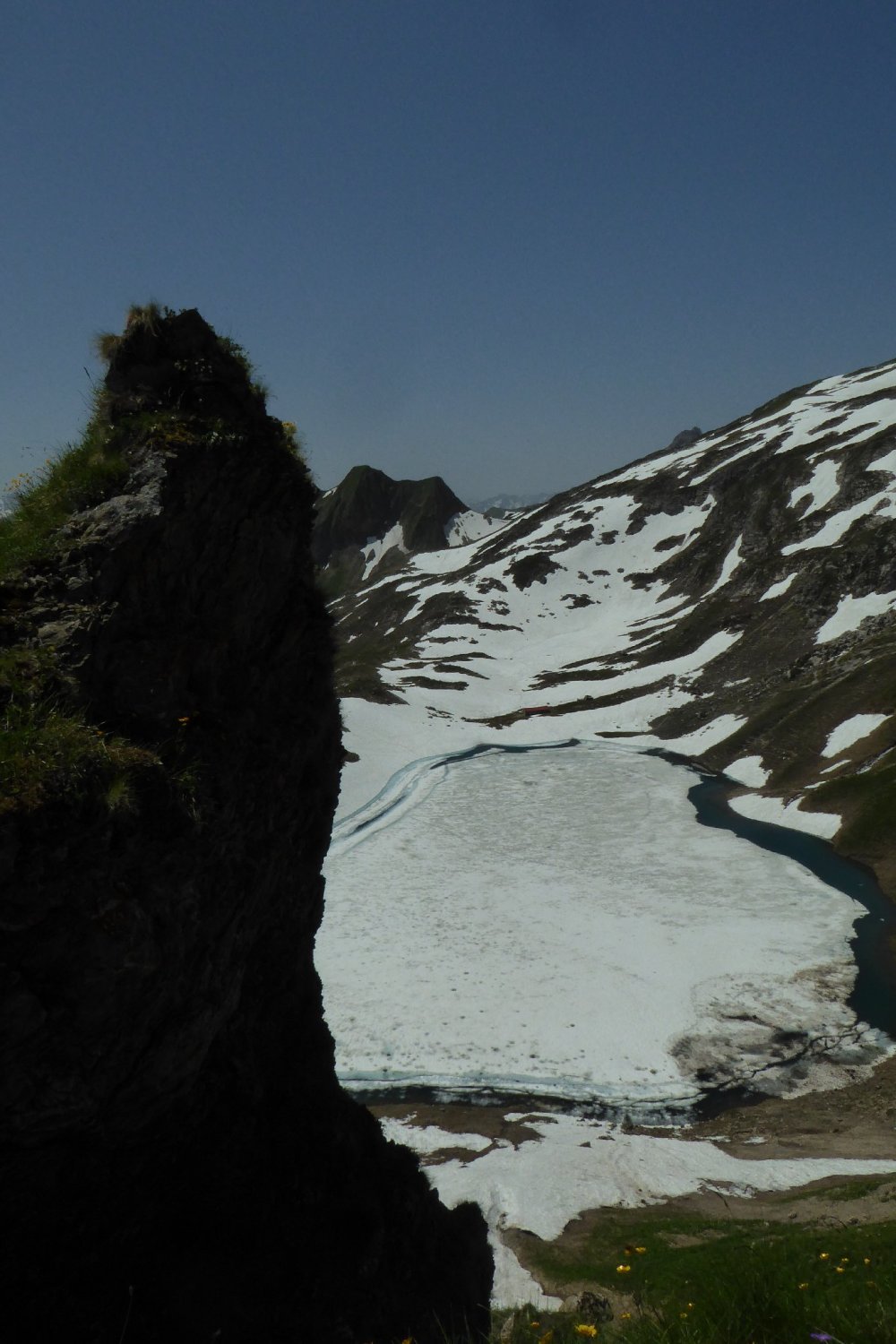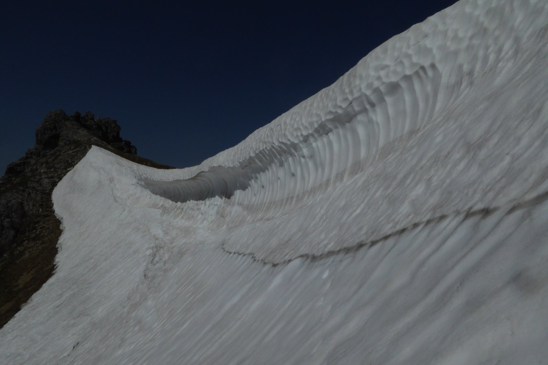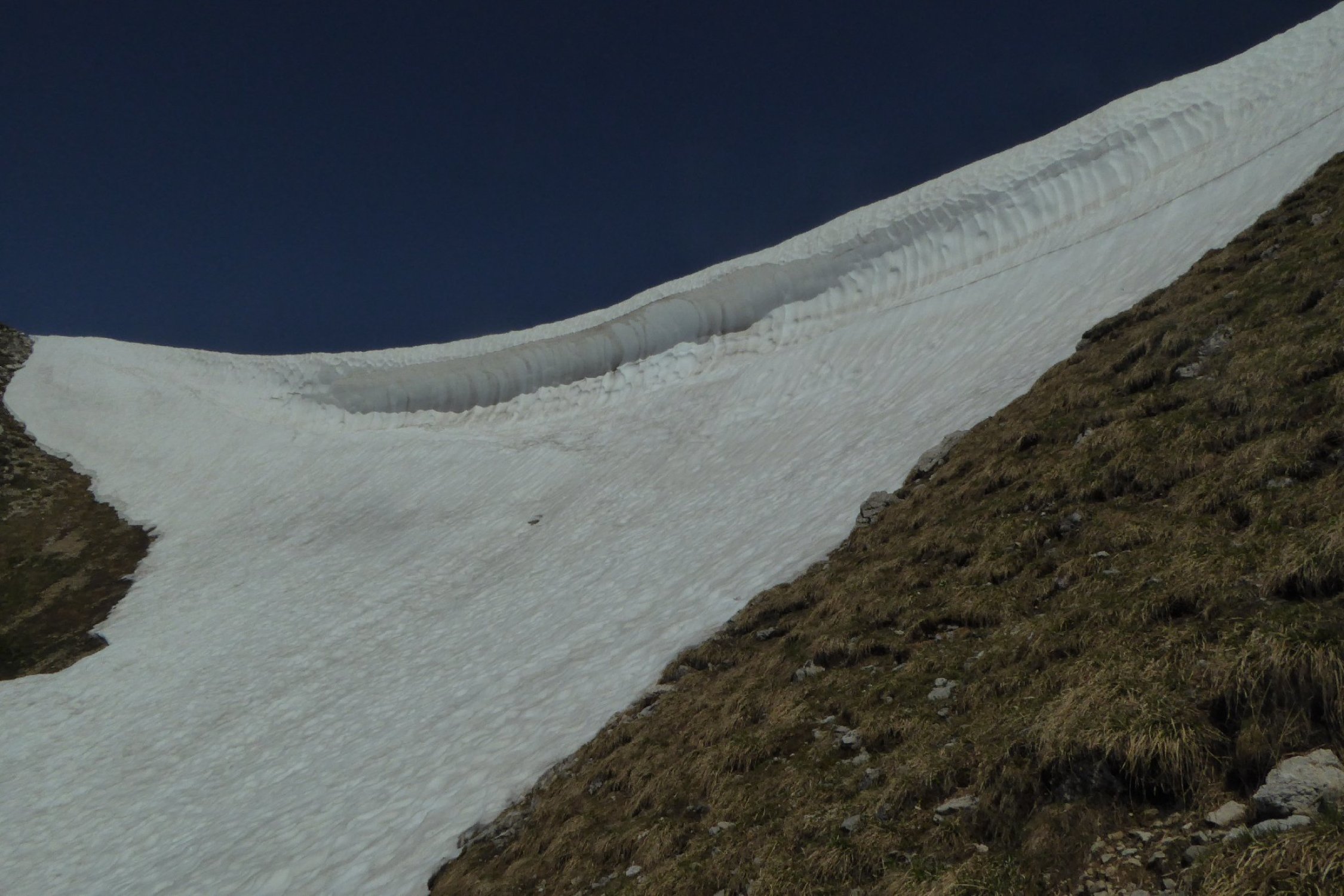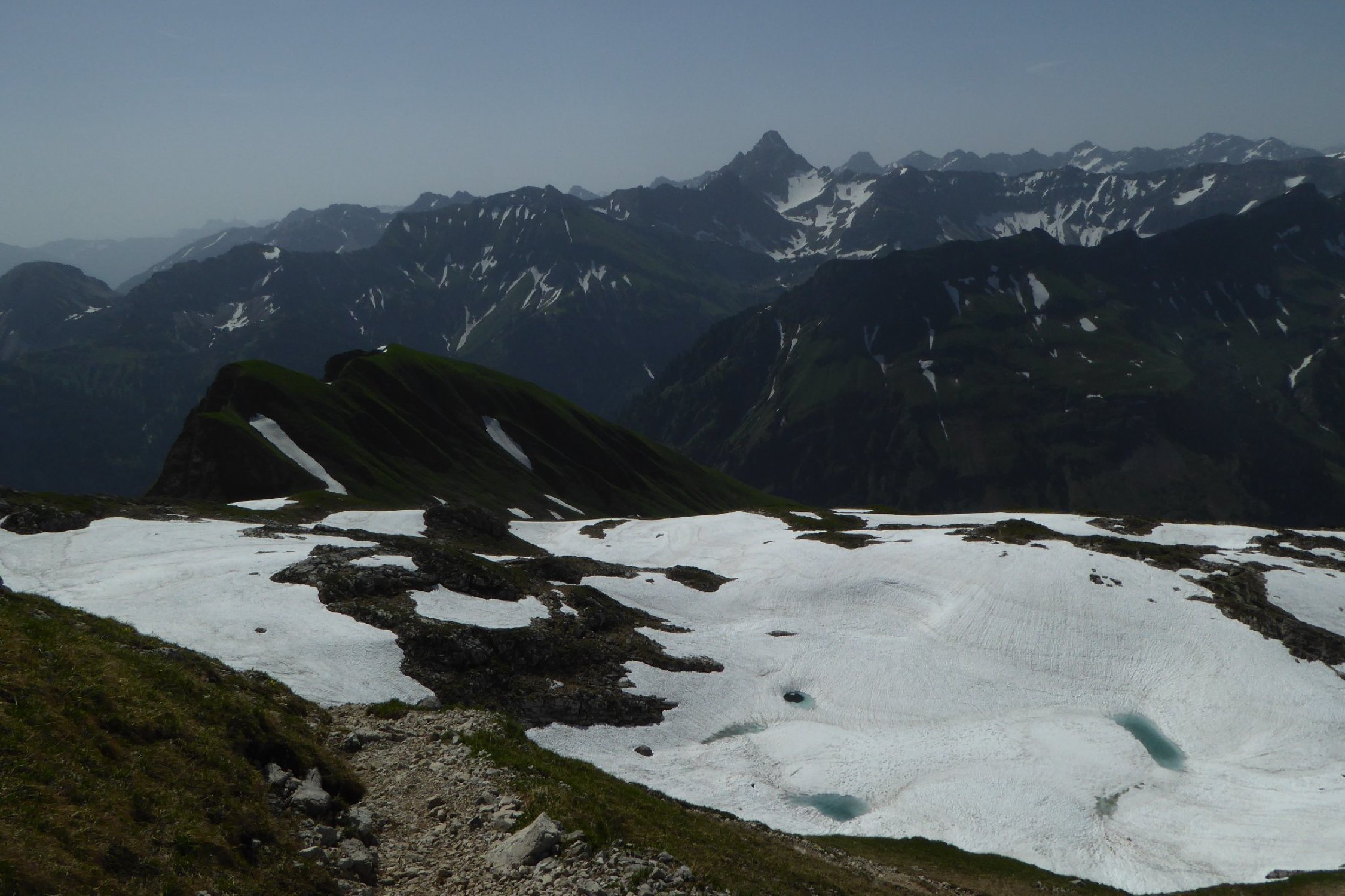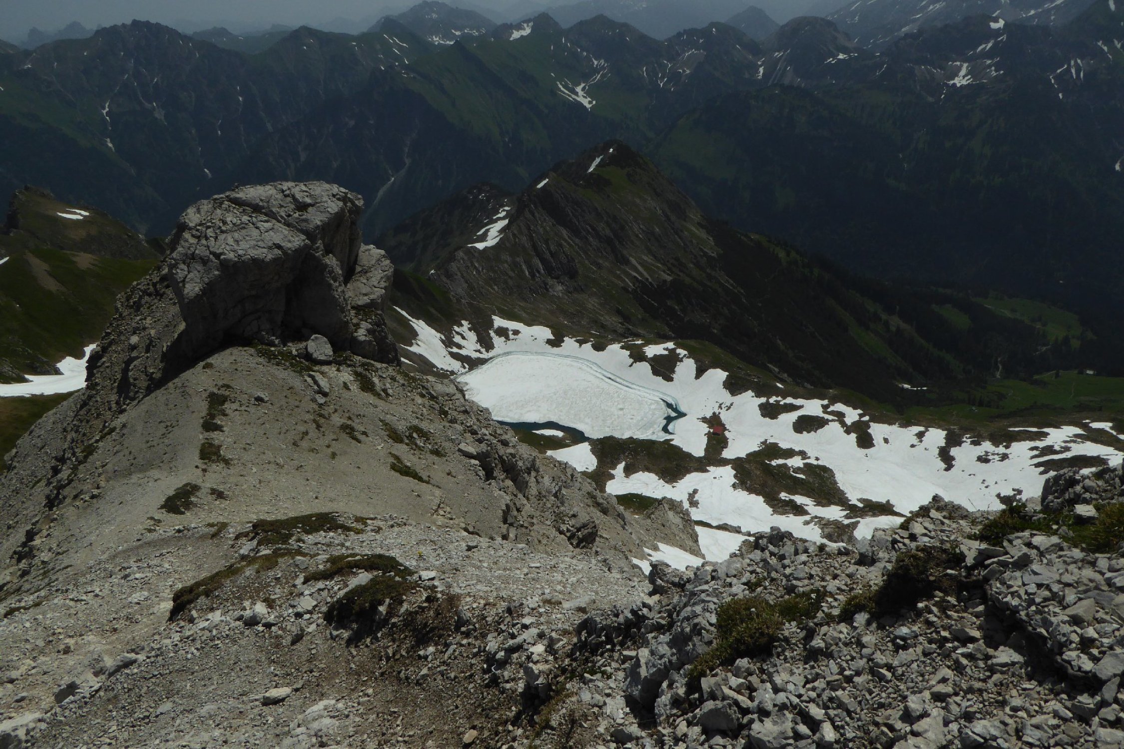 Es hat noch viel gut zu begehender welligen Altschnee. Einige Stellen wie der Einstieg auf Sommerlinie vom Hölzlesattel und der Ausstieg in Sattel am Ende des Hindelanger KS vorbei an Eindrucksvoller Wechte, erfordert doch den etwas sicheren Geher. Ansonsten viel abkürzen und abrutschen möglich, vor allem im Abstieg.