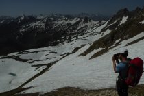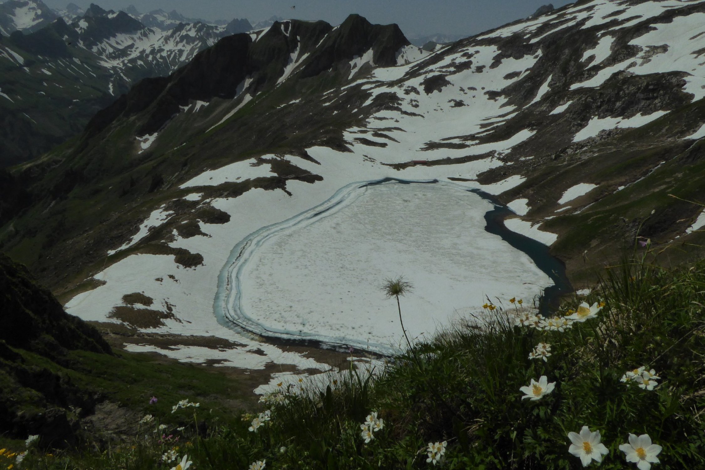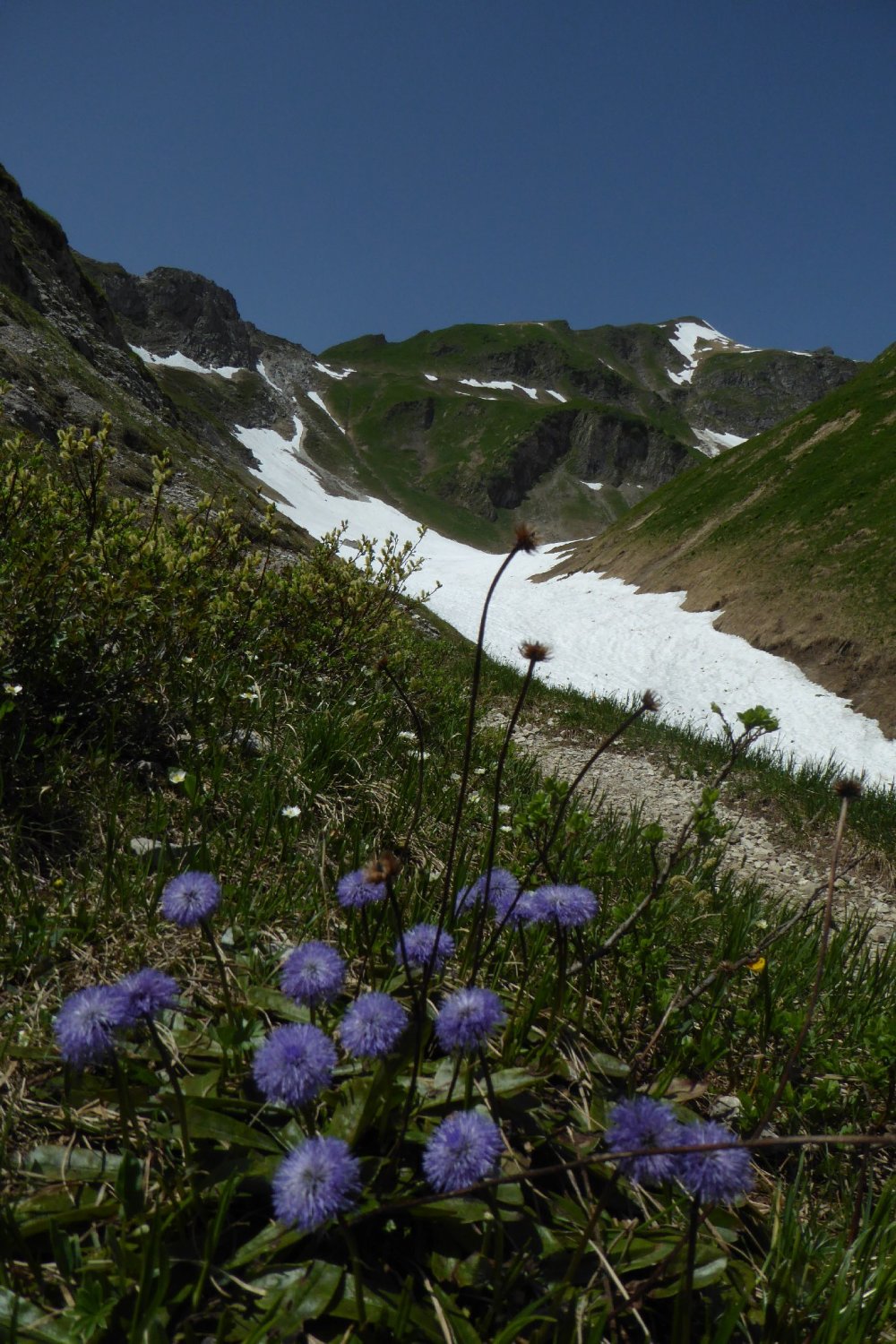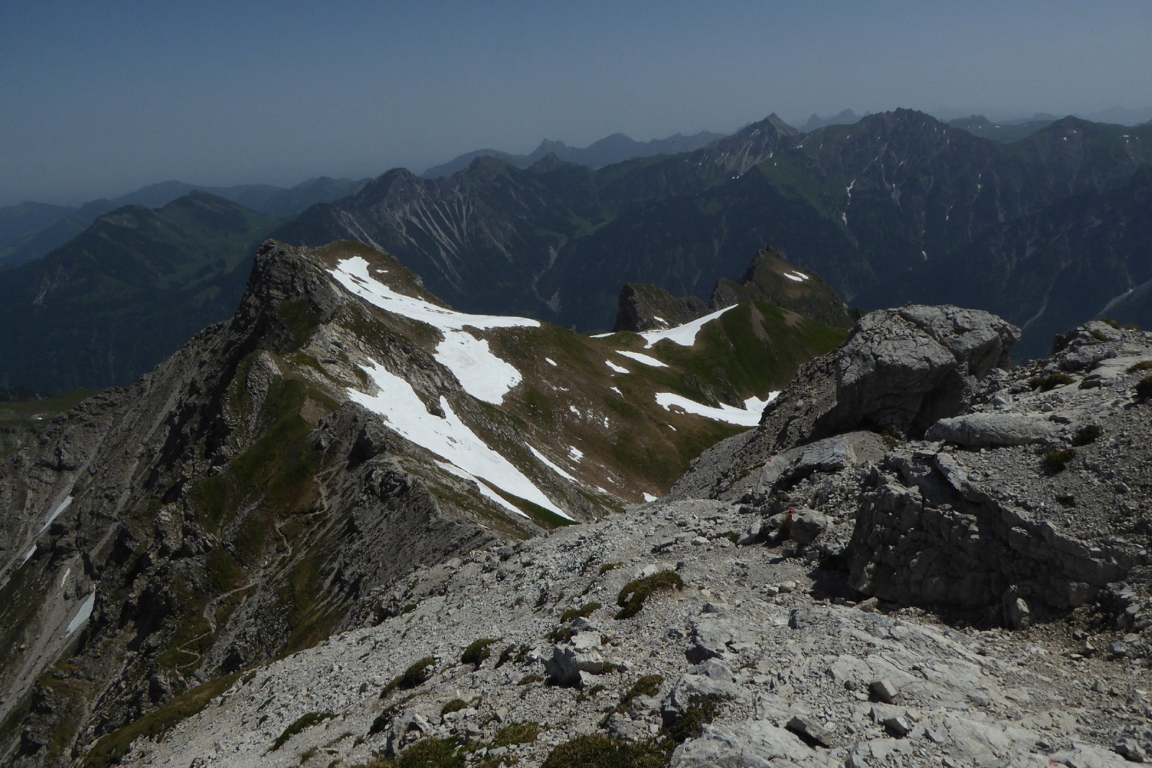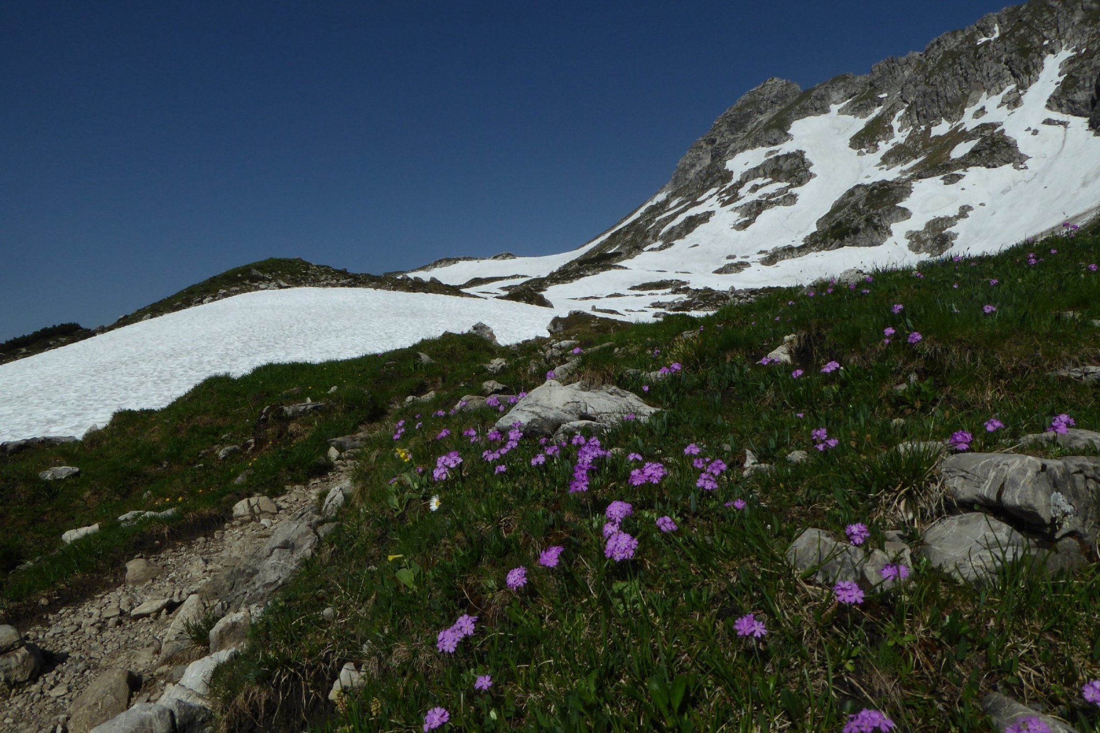 Es hat noch viel gut zu begehender welligen Altschnee. Einige Stellen wie der Einstieg auf Sommerlinie vom Hölzlesattel und der Ausstieg in Sattel am Ende des Hindelanger KS vorbei an Eindrucksvoller Wechte, erfordert doch den etwas sicheren Geher. Ansonsten viel abkürzen und abrutschen möglich, vor allem im Abstieg.