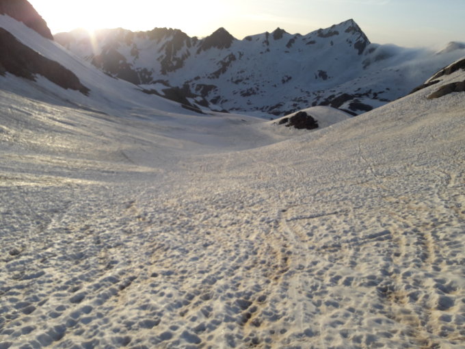 Nach 300 Meter tragen kann durchgängig auf den Gipfel geschoben werden. Teils Sommer Schnee und in der Mitte einige wenige, richtige Rillen. An und für sich für die Jahreszeit gute Bedingungen.