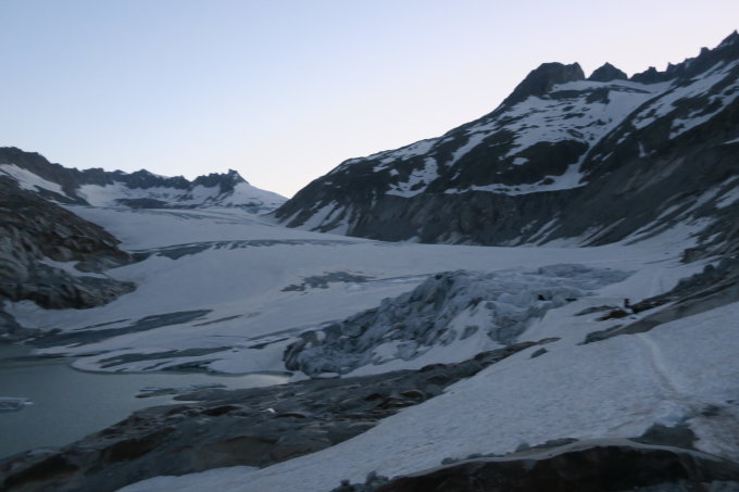 Start 5 Uhr Belvedere - Aufstieg noch durchgehend mit Ski möglich, wenn man jedoch am Rhonegletscher teils über ein paar Stellen Blankeis muss.