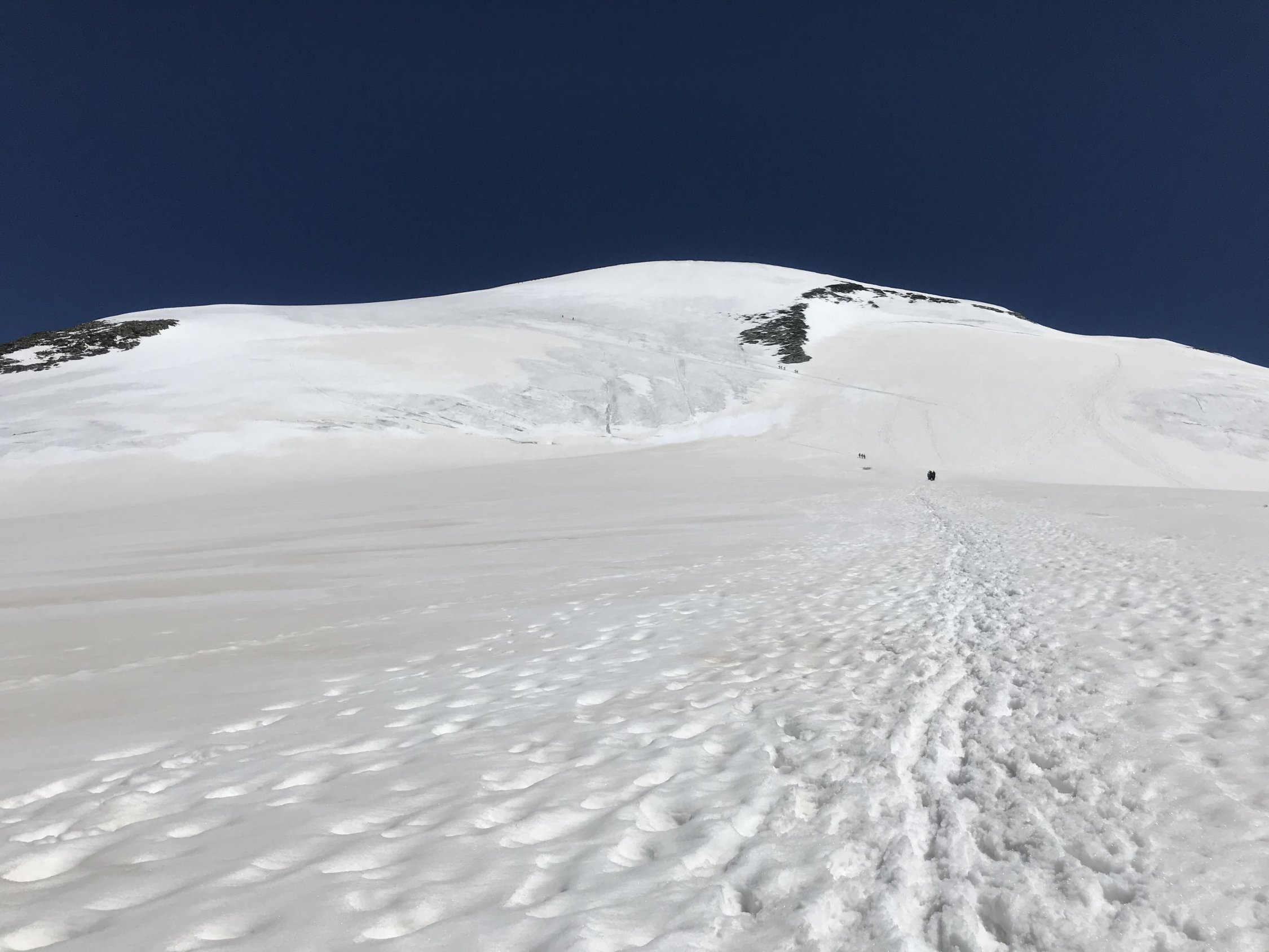 Auch bei den hohen Temperaturen und meinem späten Start (war der letzte, der zum Gipfel ging), war der Gletscher gangbar. Der Schnee war weich, aber die Spur ist hart und hält. Auf jeden Fall versinkt man nicht knietief im nassen Schnee...