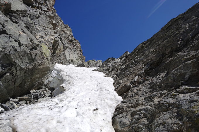 Steigeisen obligatorisch, Pickel braucht es nicht. Bei der Hitze zeitig starten, selbst bei guter nächtlicher Abstrahlung wird der Schnee in der Südwand schnell weich!