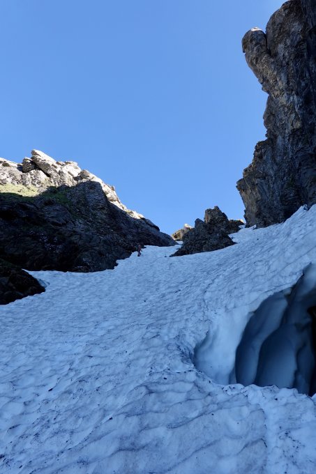 Schnee schmilzt schnell bei diesen Temperaturen. Das Couloir sollte aber noch gut bleiben für einige Zeit.