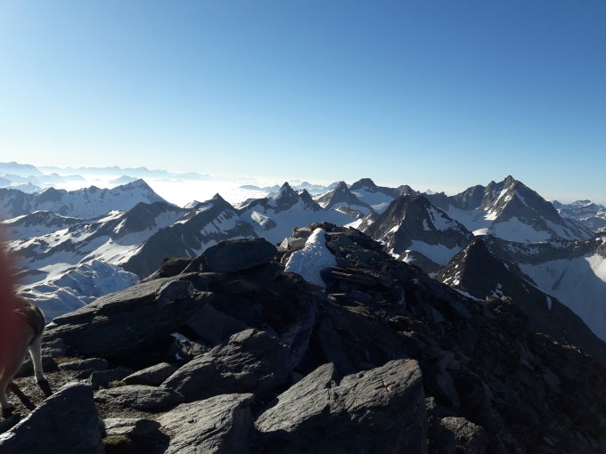 Herrliche Fernsicht und ein tolles Panorama bei leichtem Wind und angenehmen T-Shirt Temperaturen auf dem Gipfel.