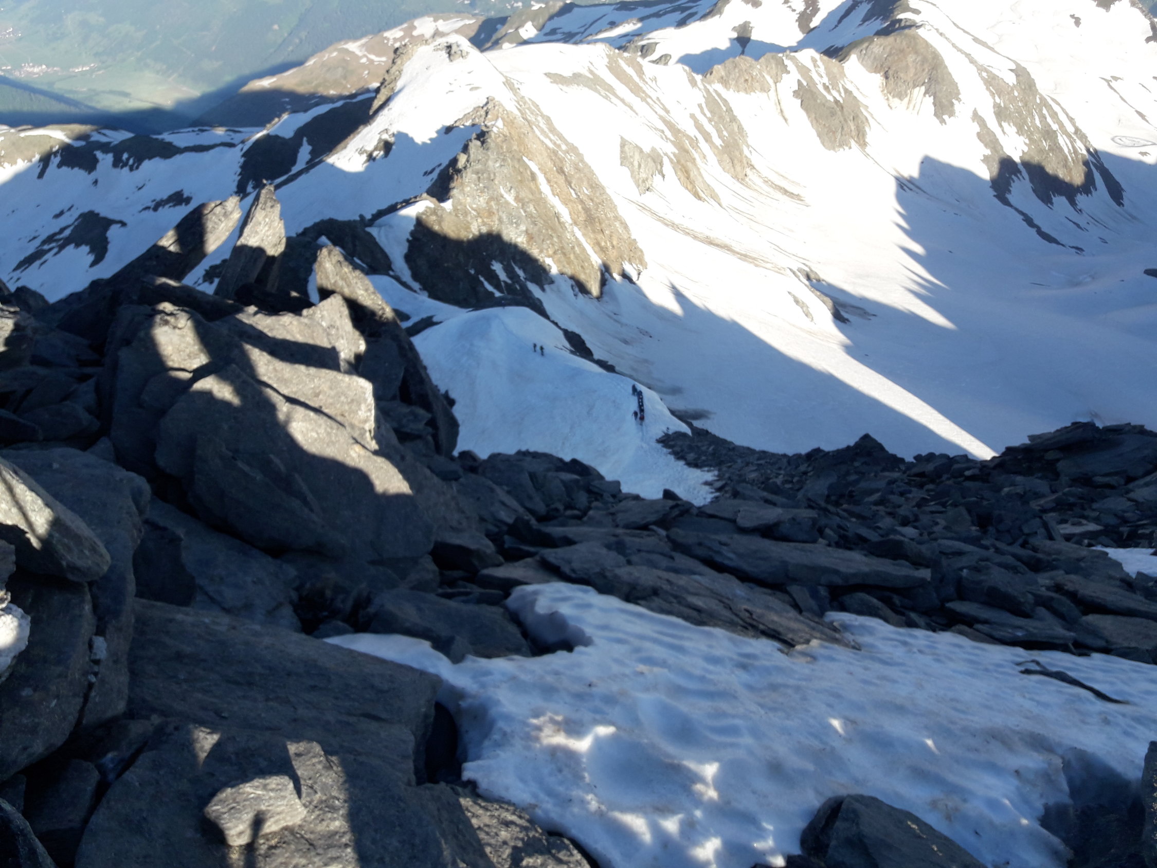 Für diese Jahrezeit noch sehr gute Verhältnisse. Militärstrasse zu 90% frei. Die ganze Route kein durchgefirnter Schnee, sondern Sommerschnee, leicht aufgeweicht und angenehm zu gehen. Das Coulouir komplett mit sehr gutem Trittschnee und ohne Steinkontakt. Der Grat anfangs schneefrei, dann ein kurzes Schneestück und ein langes Stück gut gangbar auf dem "Wanderweg" im Felsaufschwung. Oben noch ein kleines Stück im guten Trittschnee und die letzten Meter auf den Gipfel.