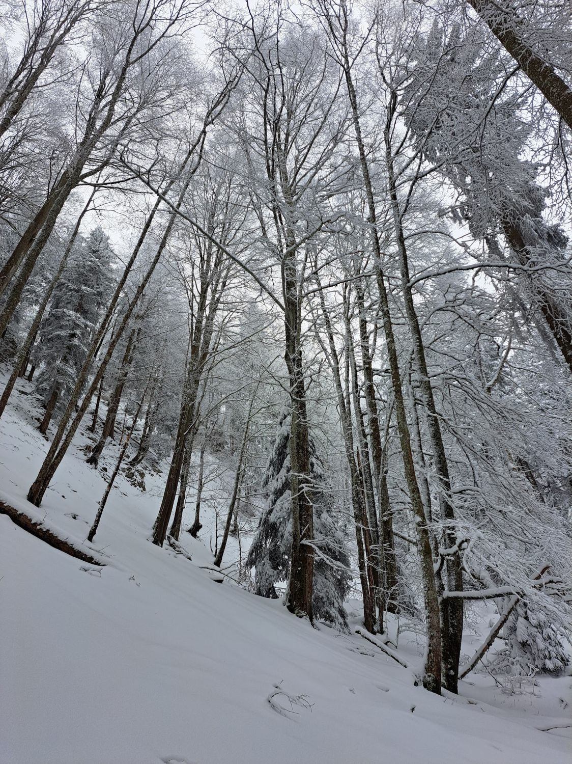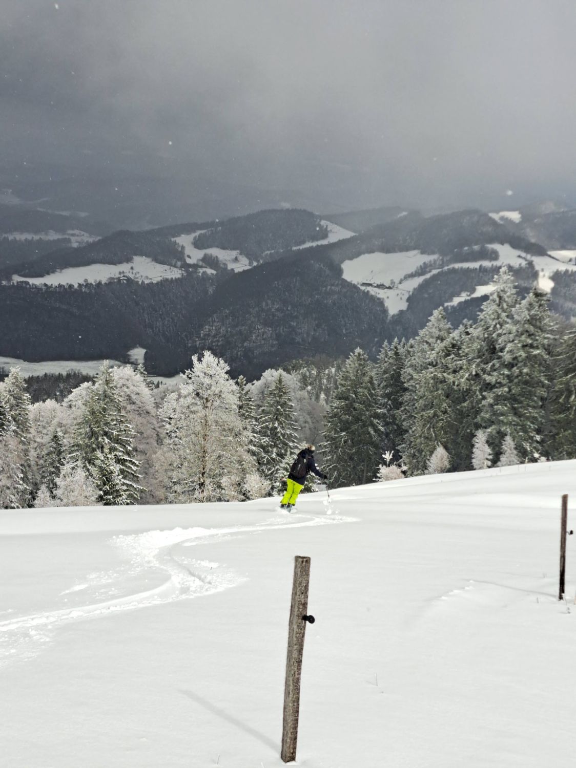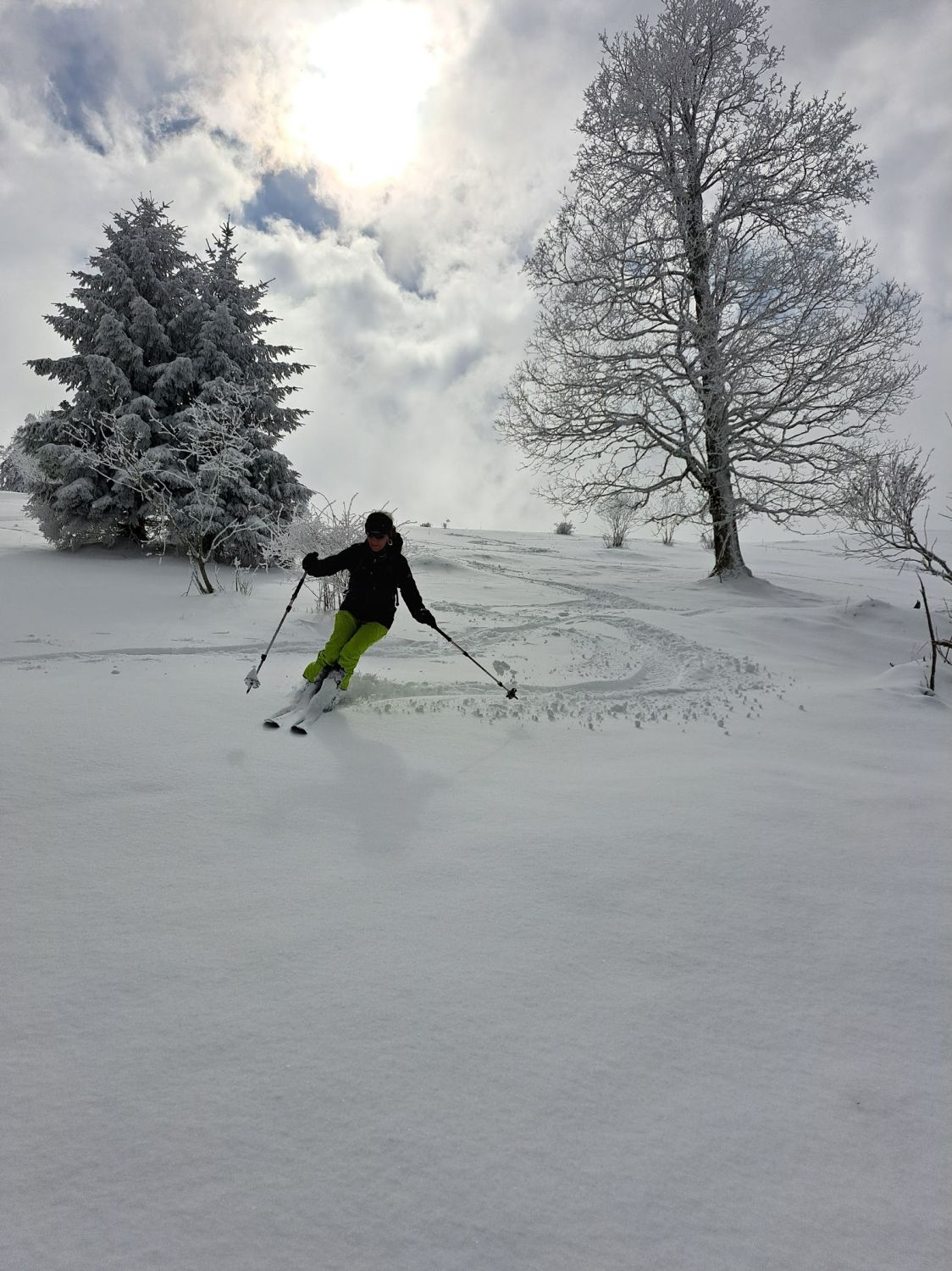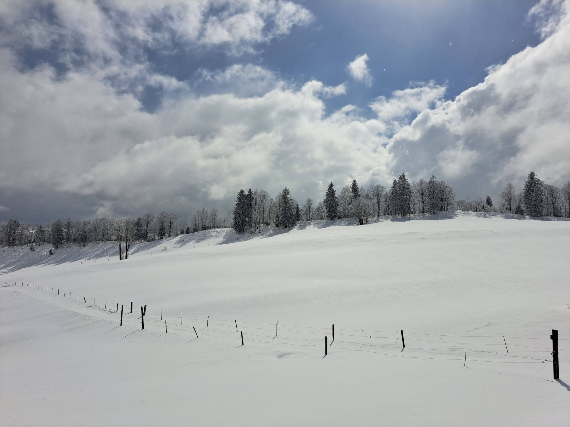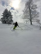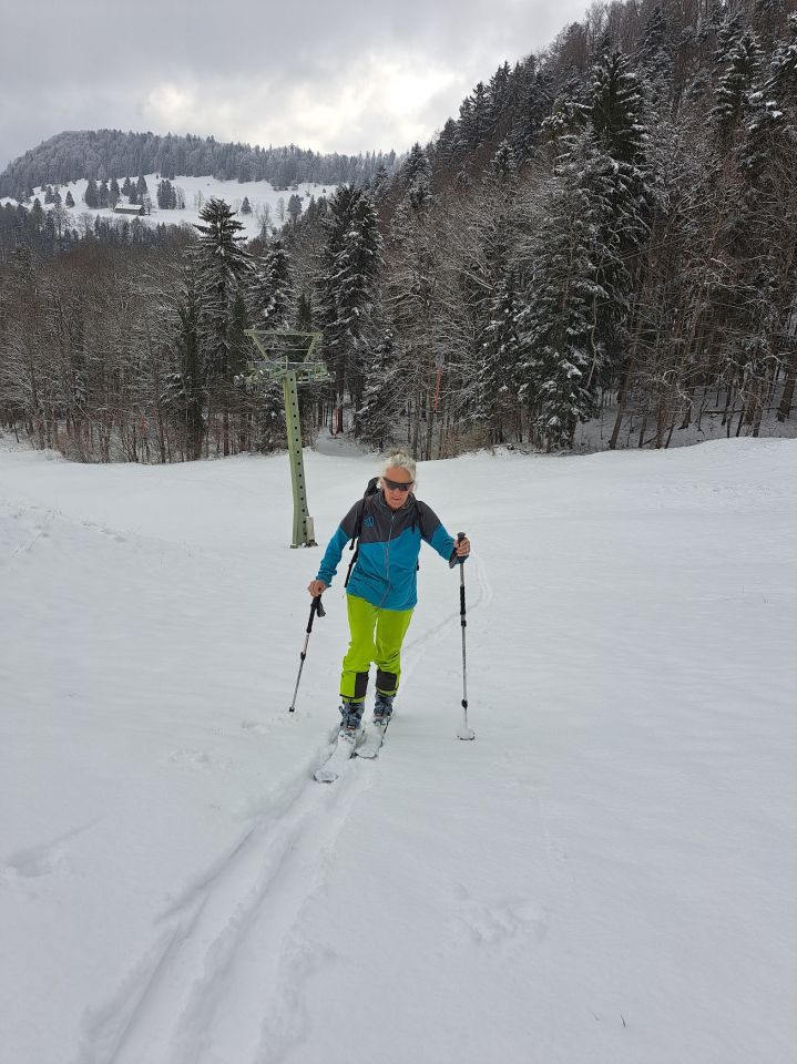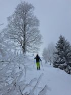 Beim Skilift ca 10 cm, auf dem Gipfel ca 20 cm Neuschnee von gestern. Bise. Einige Wolken und Nebelschwaden, mal etwas Sonne, mal mehr oder weniger Aussicht. Abfahrt nach Süden zum Hinter Erzberg 1036 müm ist machbar. Abfahrt vom Gipfel zum Skilift ist super.