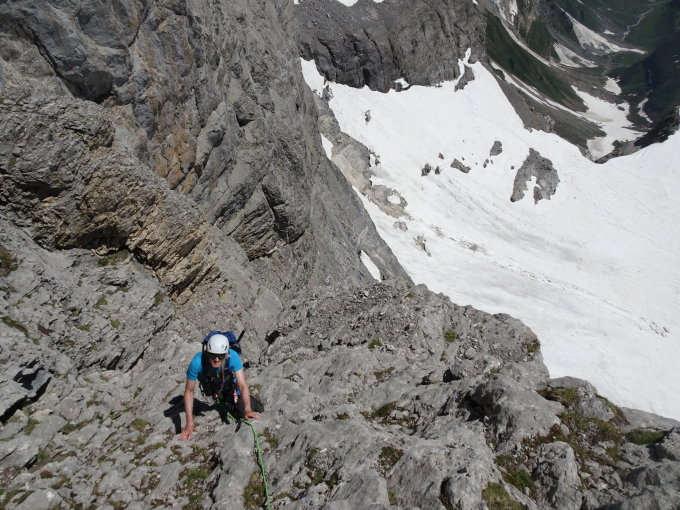 Wir haben vom oberen Ende vom Schneefeld bis zum oberen Ende vom Kamin mit Seil gesichert (ca. 2,5 Seillängen mit 40m Steil). Im Nachhinein wäre das nicht unbedingt nötig gewesen (ca. T5+/T6-).