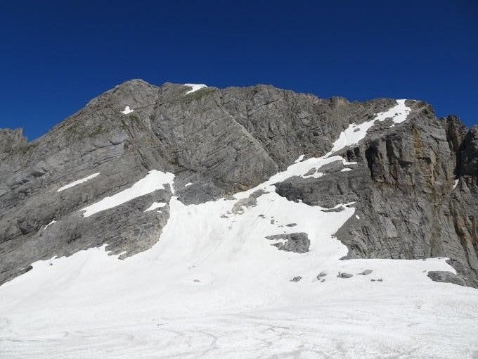 Der Schnee kommt noch bis knapp unterhalb von den gelben Felsen (Einstieg Kamin). Vorher ist aber eine kleine Randspalte zu überwinden und ca. 3m im Fels zu klettern, bevor man wieder auf ein weiteres steiles Schneefeld kommt.