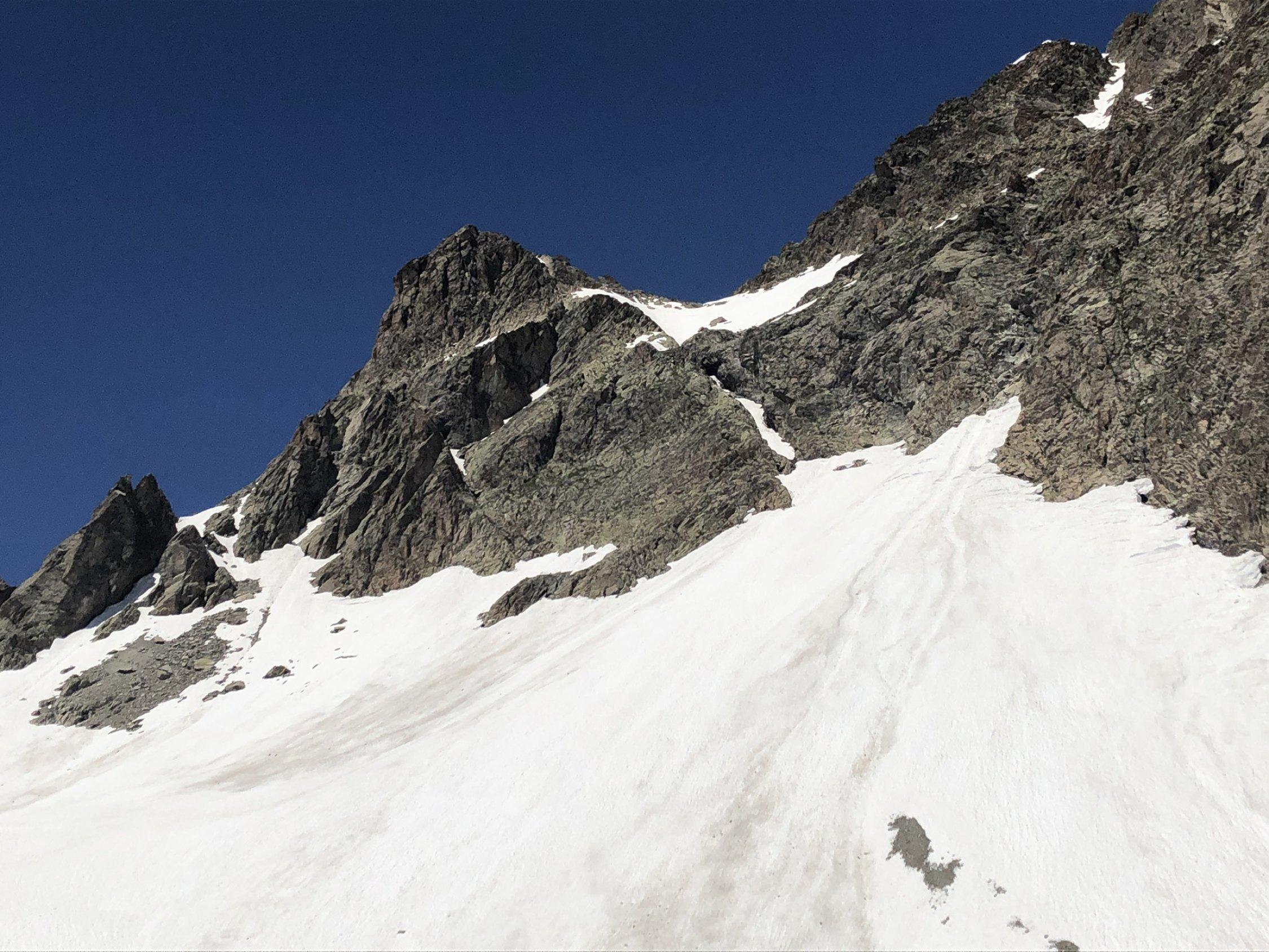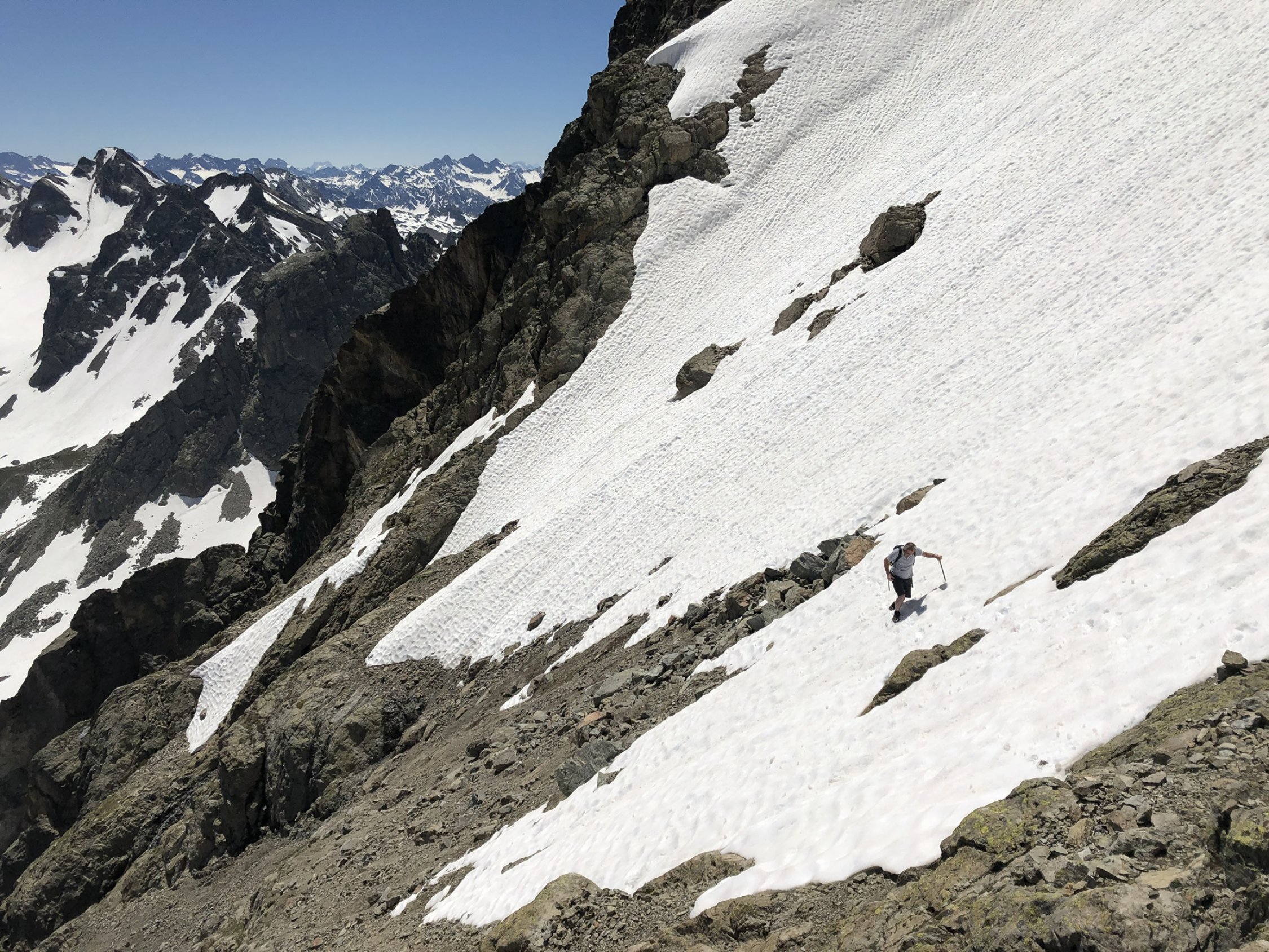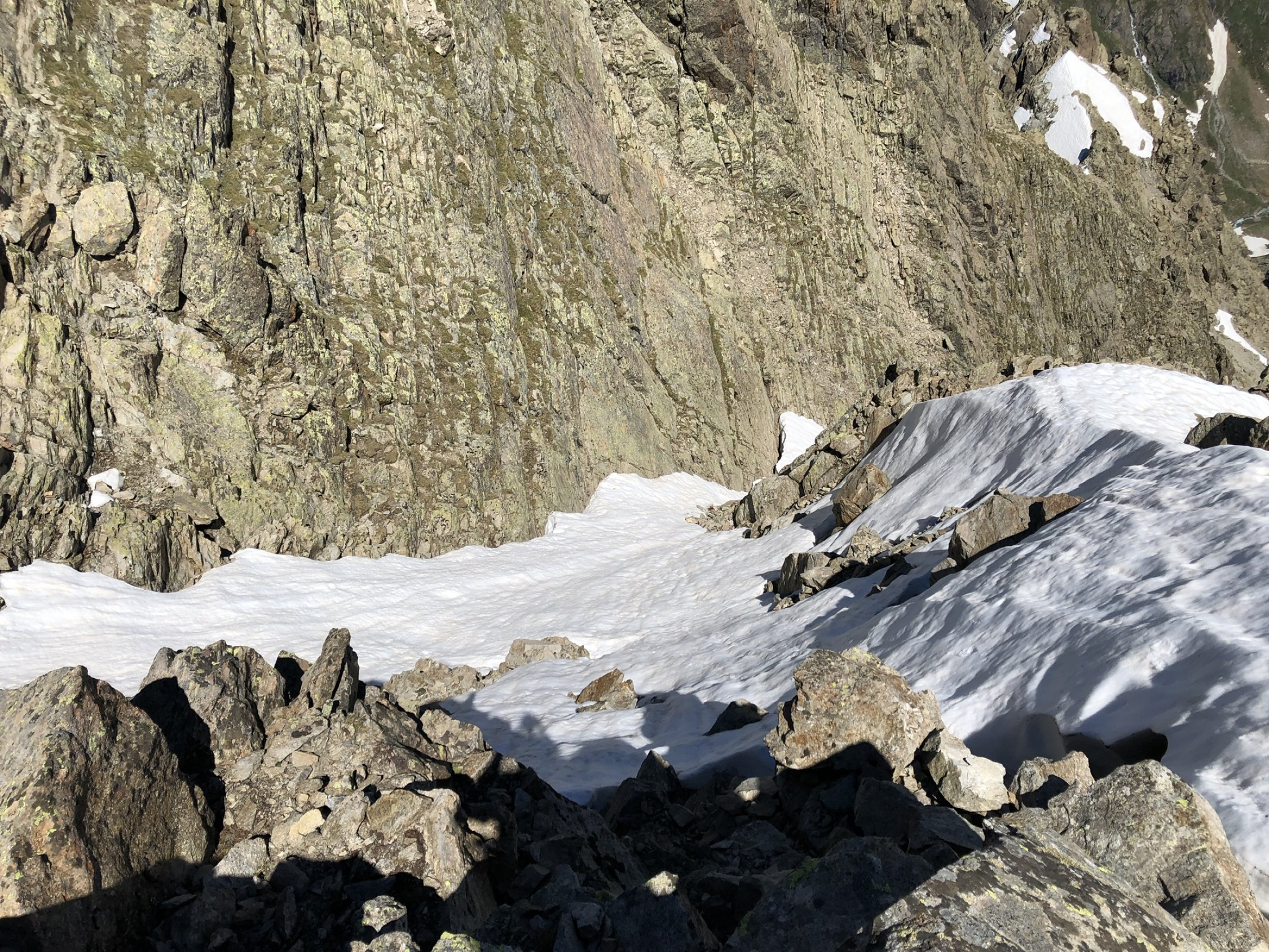 Mit dem MTB bis zum Kugelten Stein. Auf dem Wanderweg ab ca. 2400m durchgehend Schnee bis zum Einstieg in die Südflanke. Diese ist bis auf zwei Ausnahmen schneefrei und trocken. Erstens im Hochkar. Zweitens die Rinne für den Übergang auf die Nordseite am Südgipfel. Sicheres Gehen im Schnee zwingend erforderlich, und je nach Tageszeit entsprechende Ausrüstung. Steigeisen blieben bei uns im Rucksack, Schnee war weich. Pickel aber sehr hilfreich.
