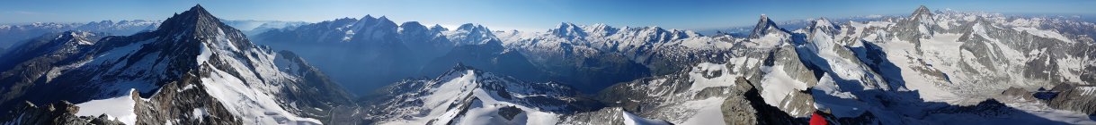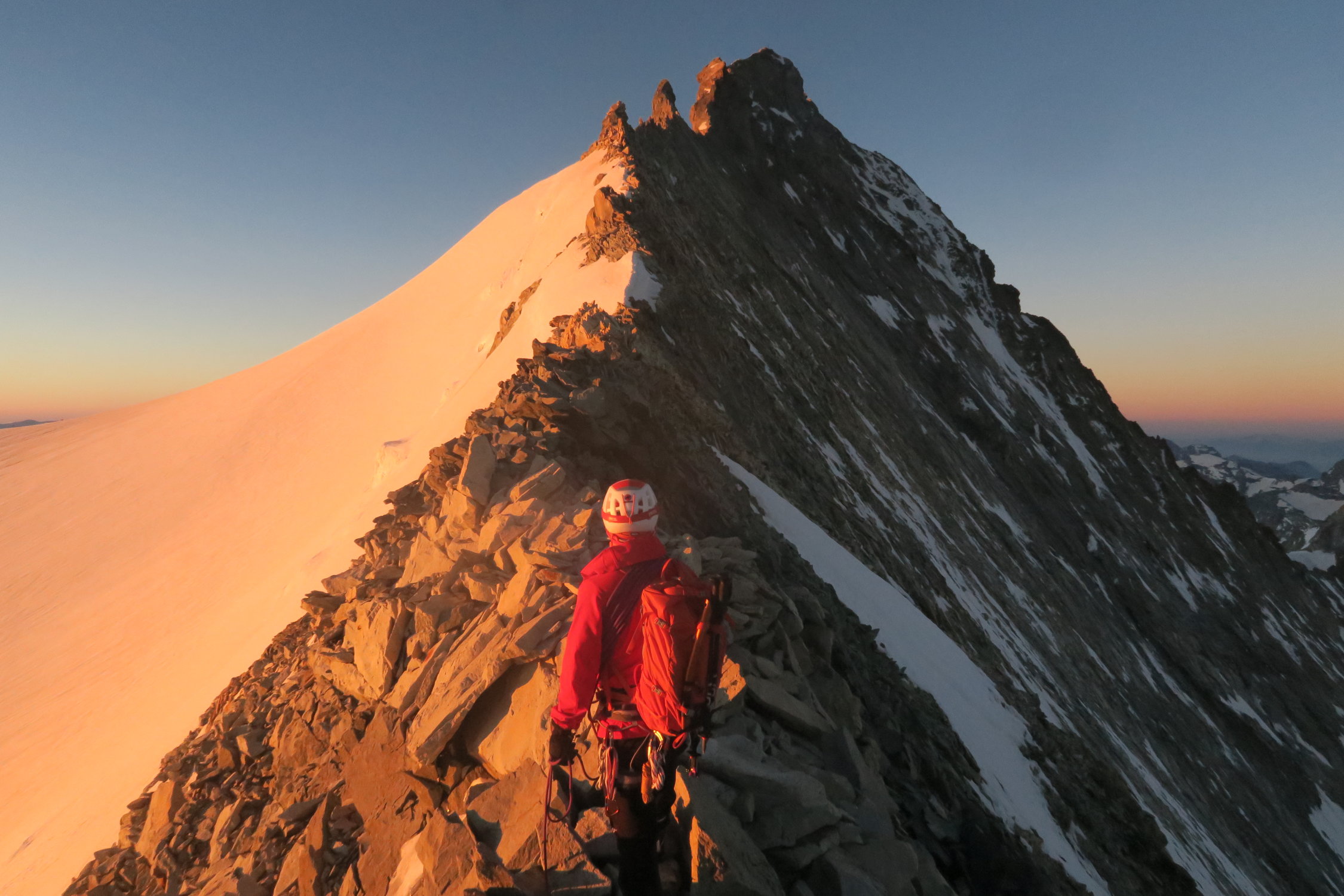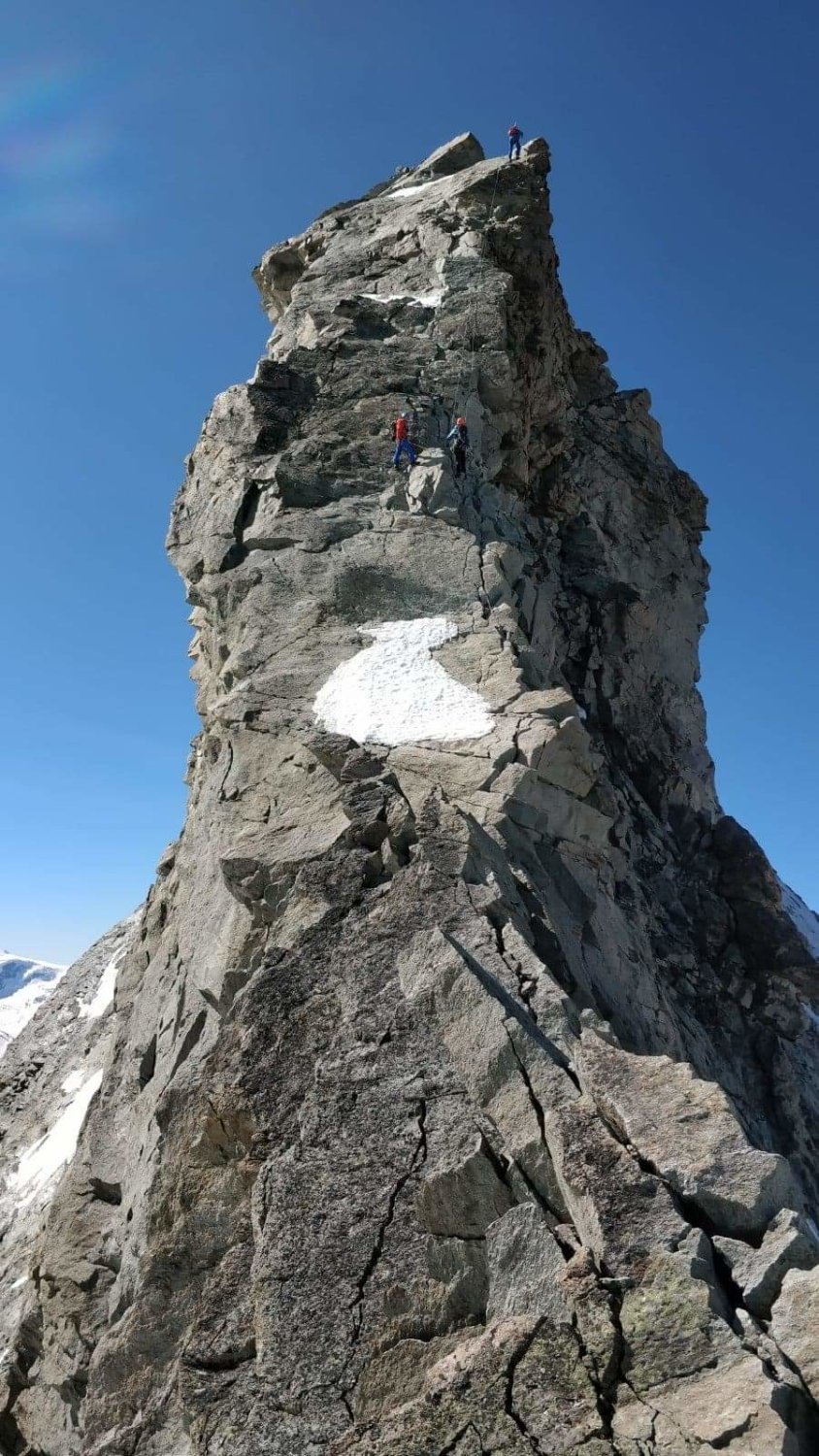 Hüttenweg zur Cabane du Grand Mountet CAS noch mit vereinzelt Schneefeldern, die jedoch gut passierbar sind. Freundliche Bewirtung auf der Hütte mit ca. 15 Gästen. Um 2:45 gingen wir los. Zuerst über Moränen bis zum Glacier du Mountet. Dieser ist noch gut eingeschneit. Trotz hoher Temperaturen war dieser dank nächtlicher Abstrahlung gut zu begehen. Nur vereinzelt knöcheltiefes Einsinken. Nach ca. 2h am Bergschrund. Grat weitgehend Schneefrei und gut begehbar mit den Highlights Rasiermesser und Bosse. Um ca. 8 Uhr auf dem Gipfel. Auf gleichem Weg zurück. Gletscher um die Mittagszeit immer noch gut begehbar.