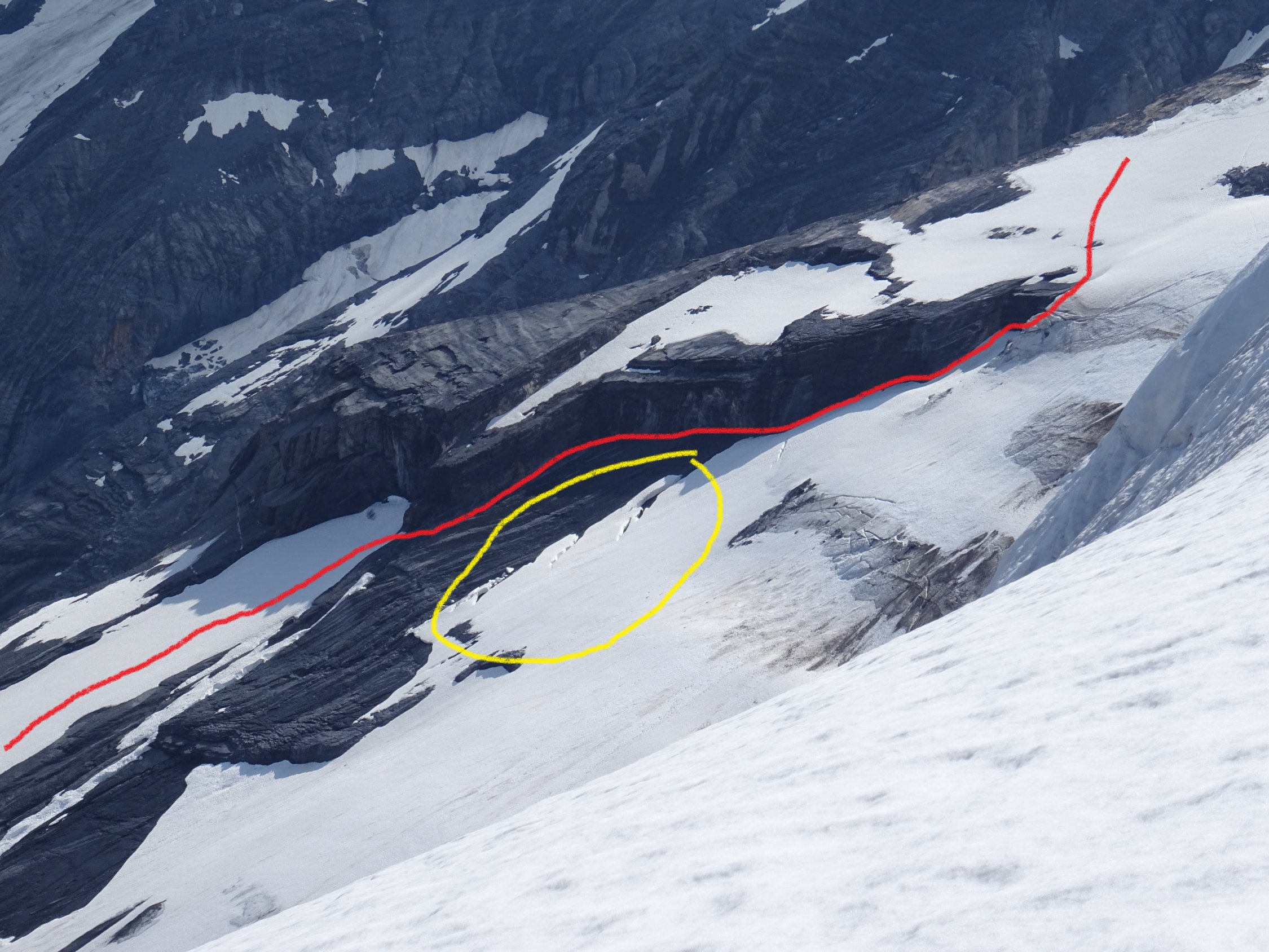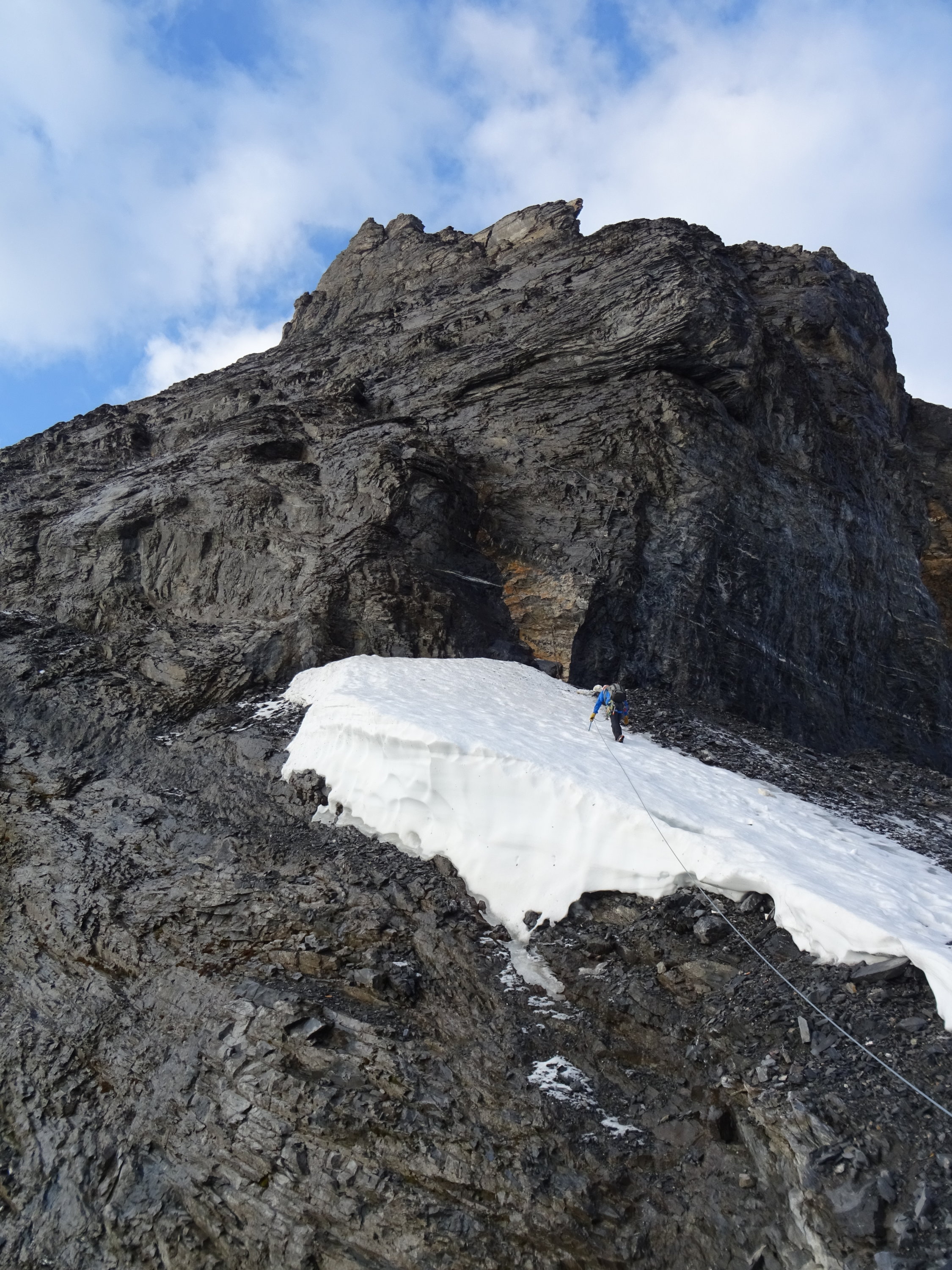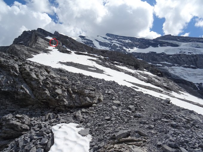 Tipp: Im SAC-Führer ist beschrieben: "Die erste plattige Felsstufe westlich umgehen". Hier muss man wirklich richtig weit nach Westen gehen (siehe auch Verhältnisbilder), bis die Felsstufe einem kleinen (noch) schneegefüllten Durchschlupf weicht. Die Stufe muss NICHT überklettert werden. Aber Achtung: Man quert unter der Felsstufe sehr plattiges Gelände. Teilweise ist daruf schon die gesamte, noch ca. 1,5m mächtige Schneedecke abgerutsch, teils liegt sie noch auf den Platten mit Wasseerfilm drunter. Schneedecke ist mit vielen Rissen durchzogen und macht den Anschein jederzeit abzurutschen. Wir haben uns ganz dicht an der Felsstufe gehalten (zwischen Fels und Schneedecke), hier gab es zwar reichlich Dusche von oben, aber erschien uns objektiv der sicherste Weg zu sein.