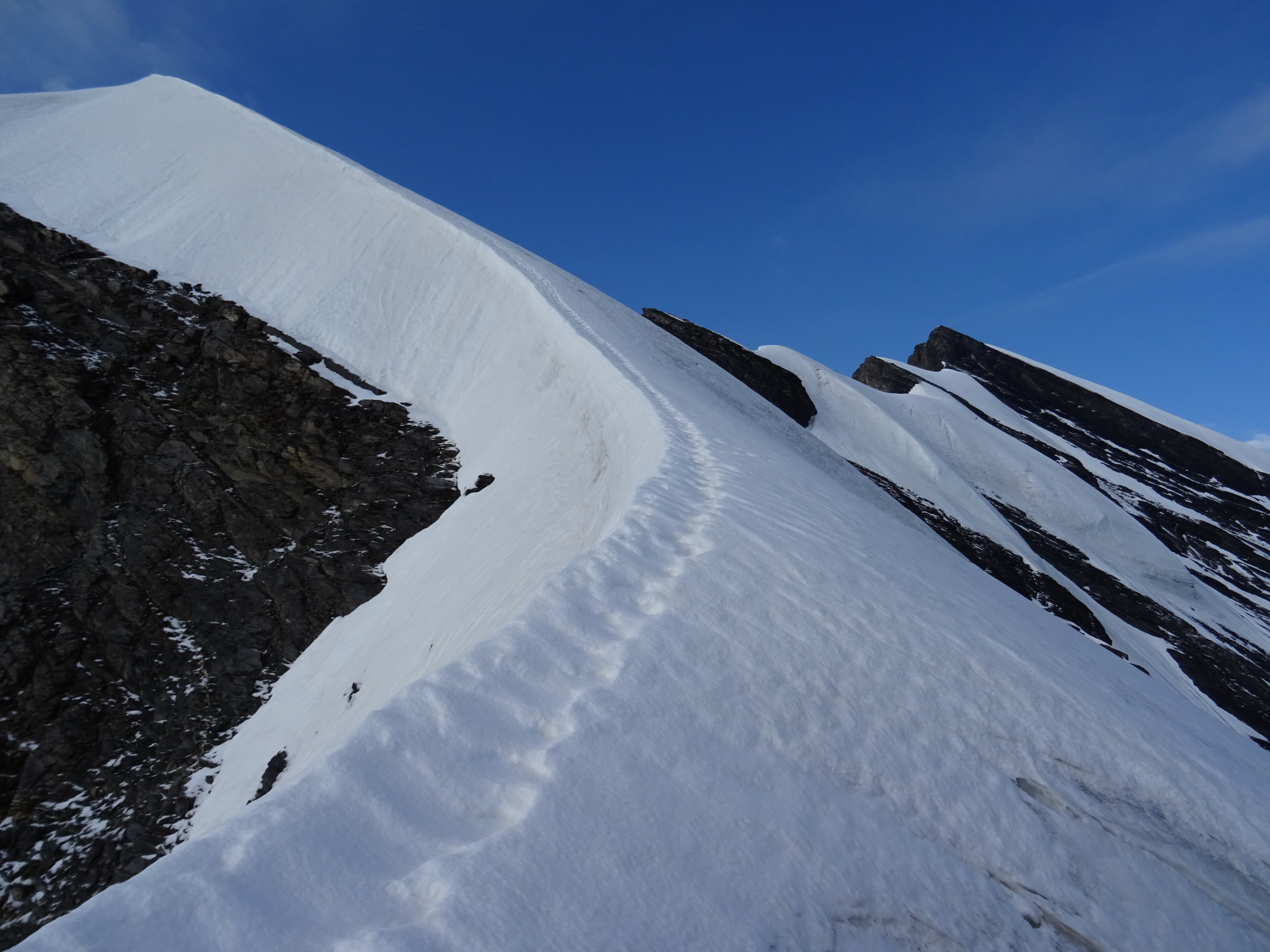 Noch keine Blankeisstellen auf der gesamten Tour, die ersten Stellen werden aber bei diesen Temperaturen sicher in wenigen Tagen auftreten, zu allererst bei der Gletscherquerung gleich nach der Hütte, noch vor dem Grat.