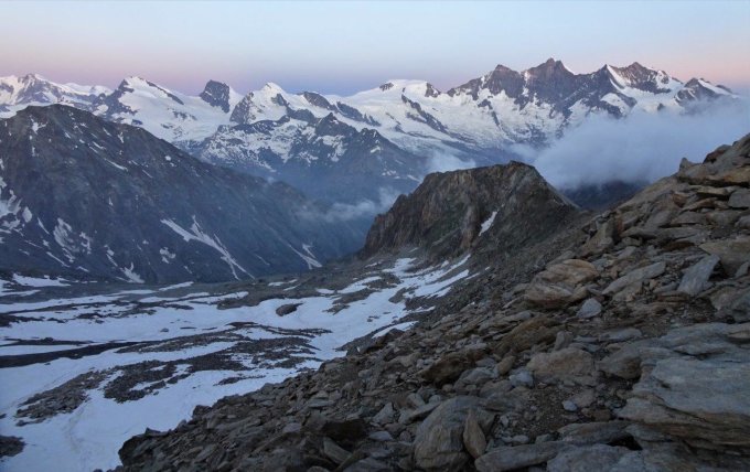 ganzer Südgrat ab Zwischbergenpass geklettert, im Abstieg dann ab etwa 3700m im Firnfeld abgestiegen. Um 10.30 immer noch hart und tragend.