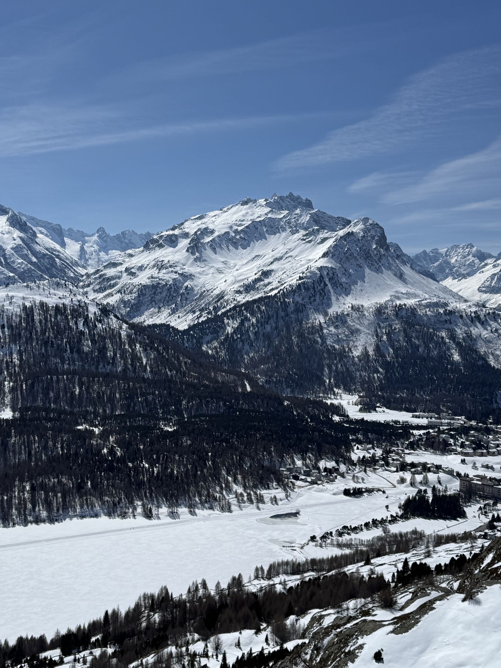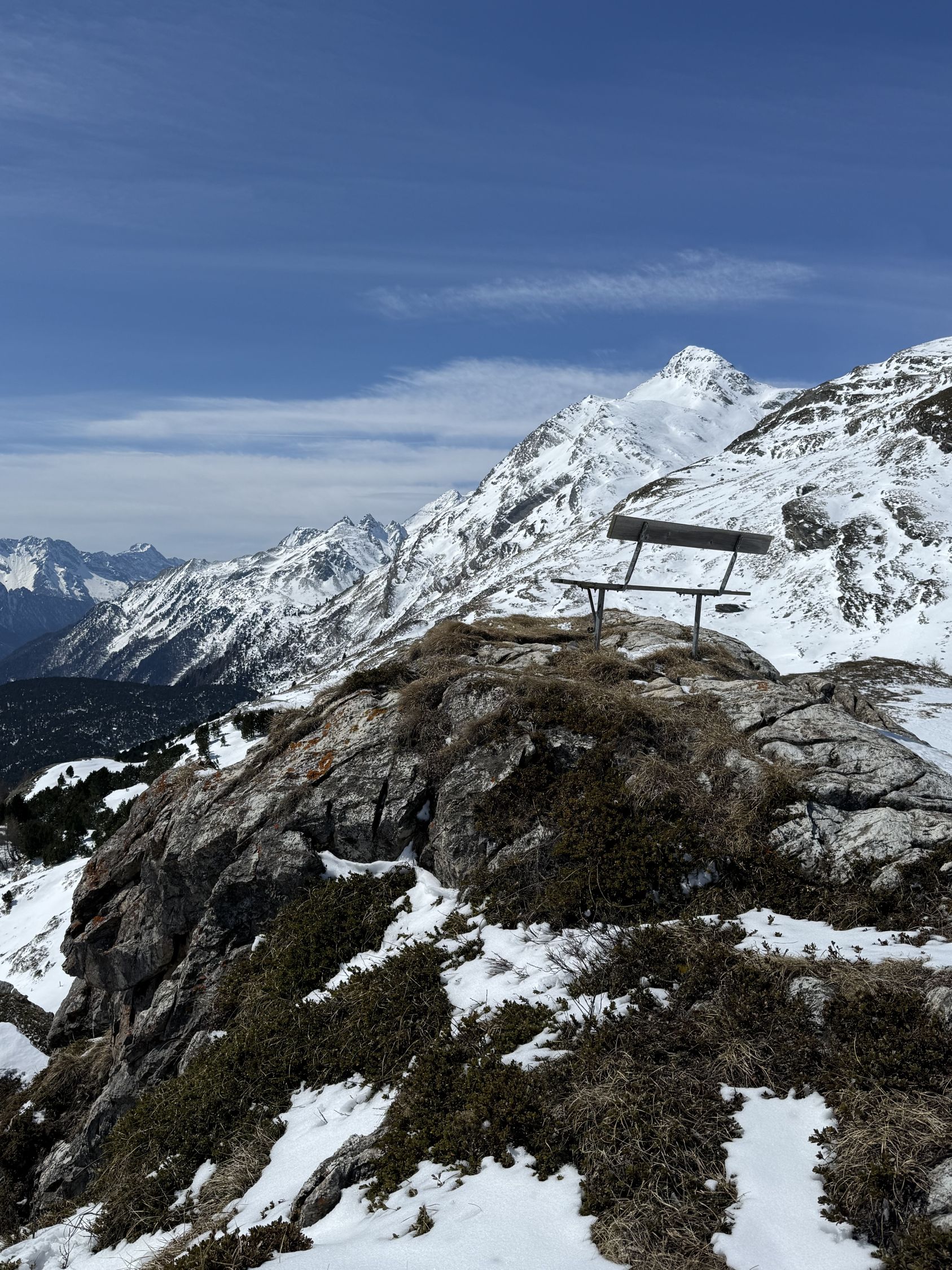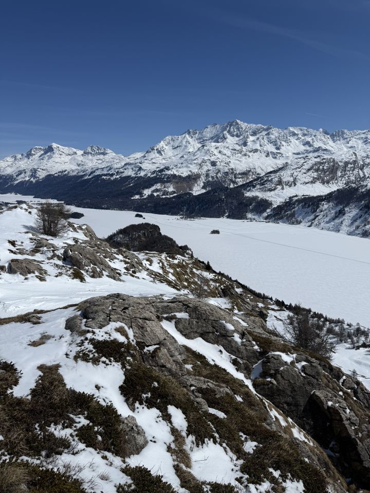 Wintertour im Schnee auf Schneeschuhspur auf den prächtigen Aussichtsgipfel, T4-, ÖV Tour. Start Plaun da Lej und auf guter Unterlage bis Blaunca (Schneeschuhspur). Nun mit Grödel die Nordflanke hoch bis zum Aussichtspunkt mit dem netten Bank. Tolle Aussicht. Abstieg wie Aufstieg.