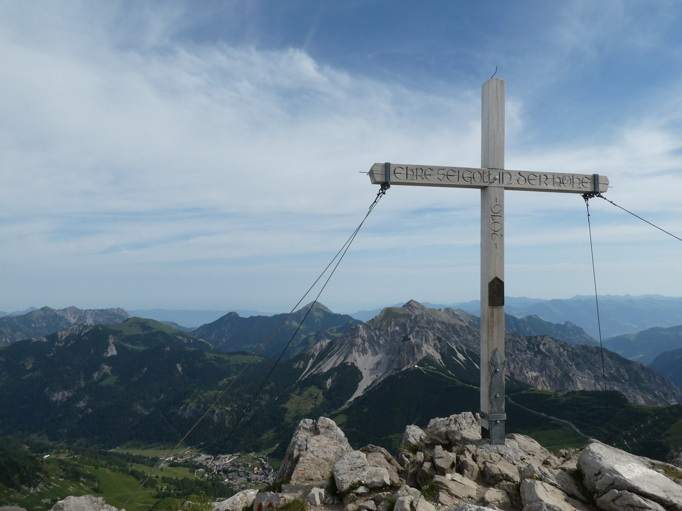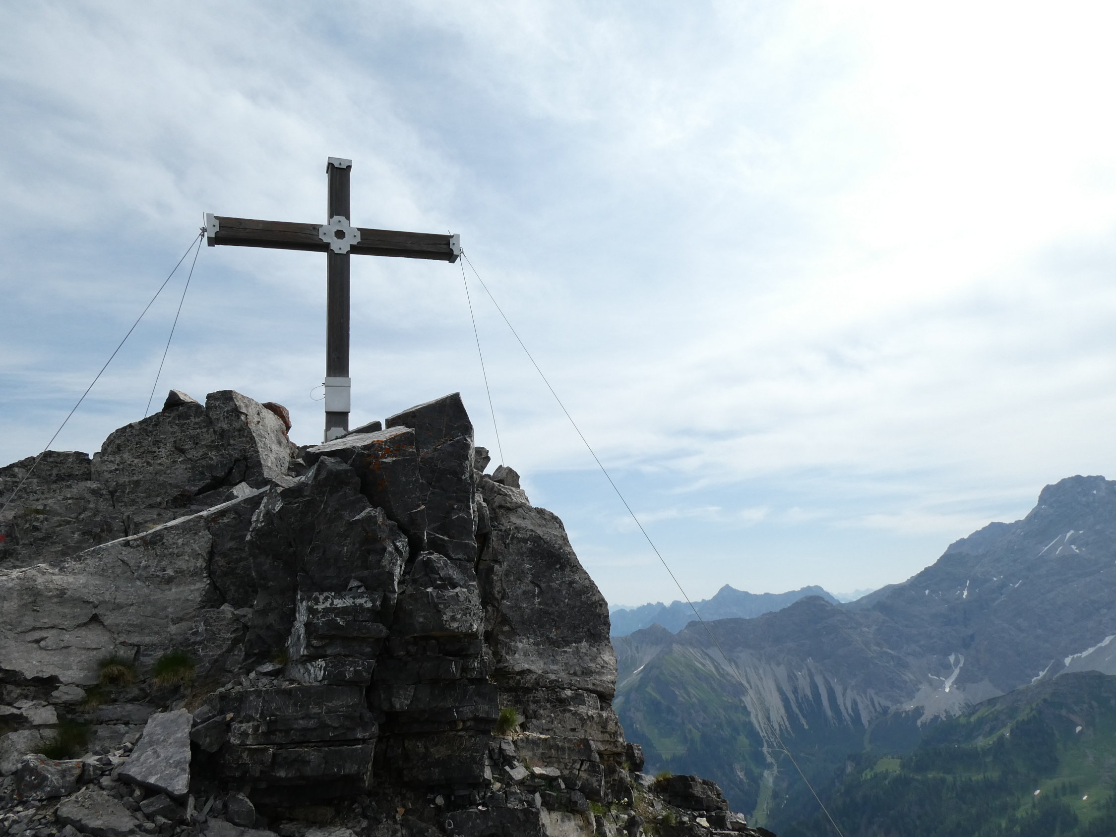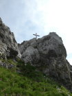 Über dem Felsband weiter durch leichte Felsen zum Gipfelkreuz. (T4)