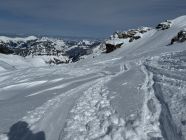 Triebschnee gut in den Hängen erkennbar - meist nur oberhalb der Waldgrenze. Die steileren Westhänge bekamen am Nachmittag einen leichten "Pulvrigen"Deckel, in den Mulden und Flachen Terrain dagegen nicht, dort hat's weiterhin Pulver.