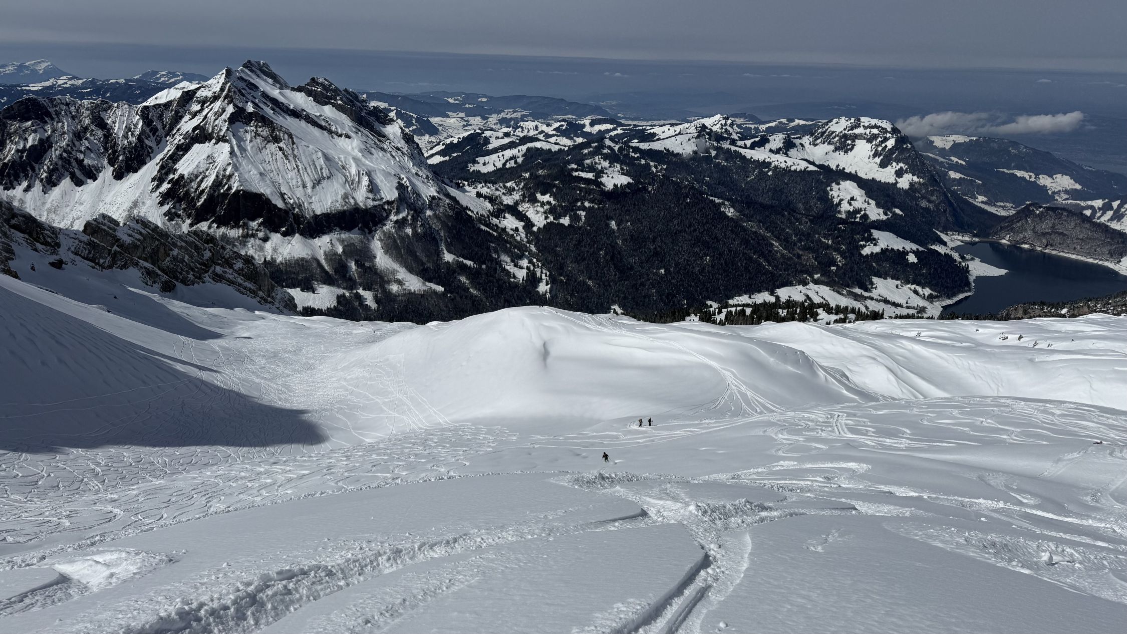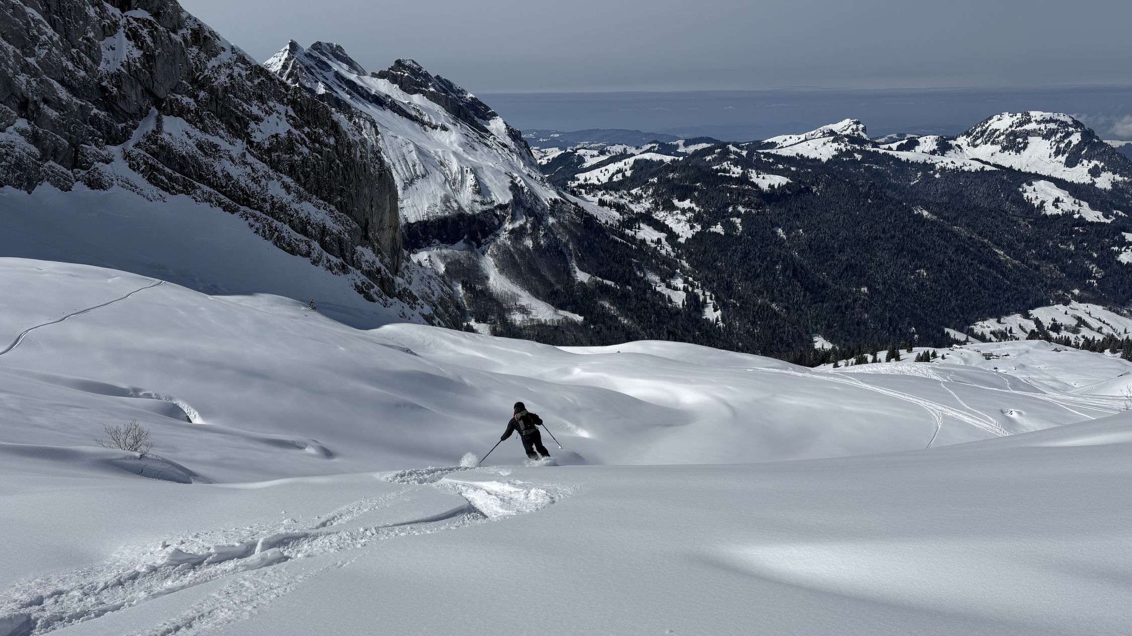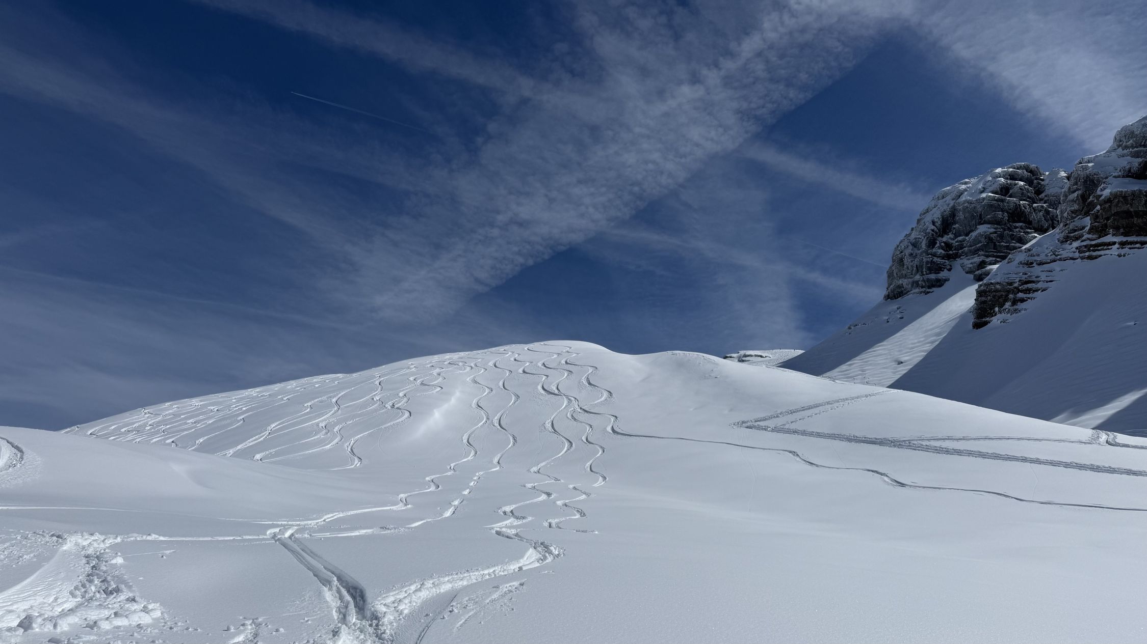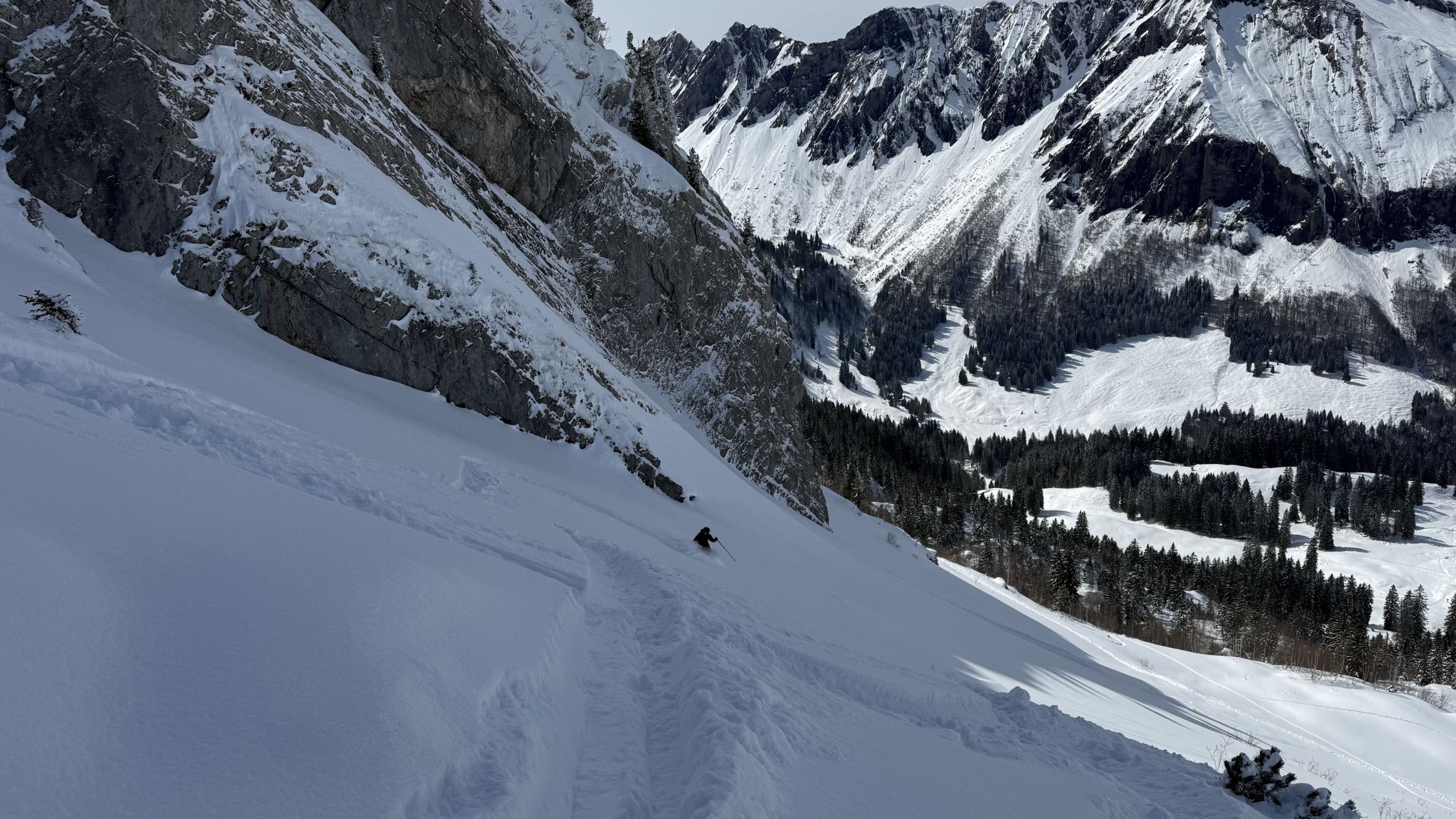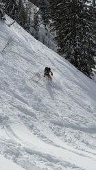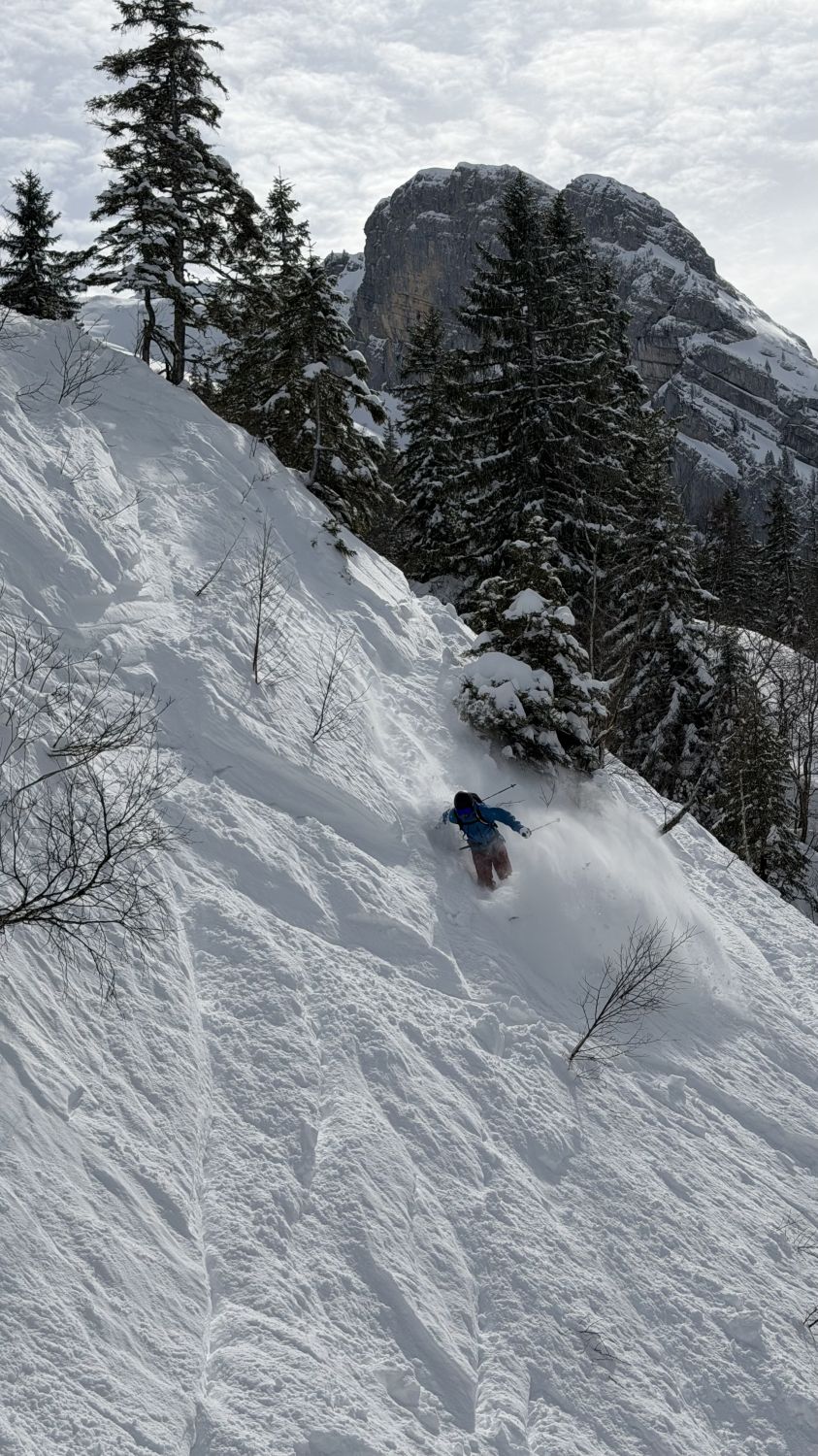 Pulver von oben bis unten. Rinderweid dann halt schwerer Schnee. PPs um 9.30 weitgehend voll. Dennoch genug Platz für eigene Spuren in noch unberührten Hängen