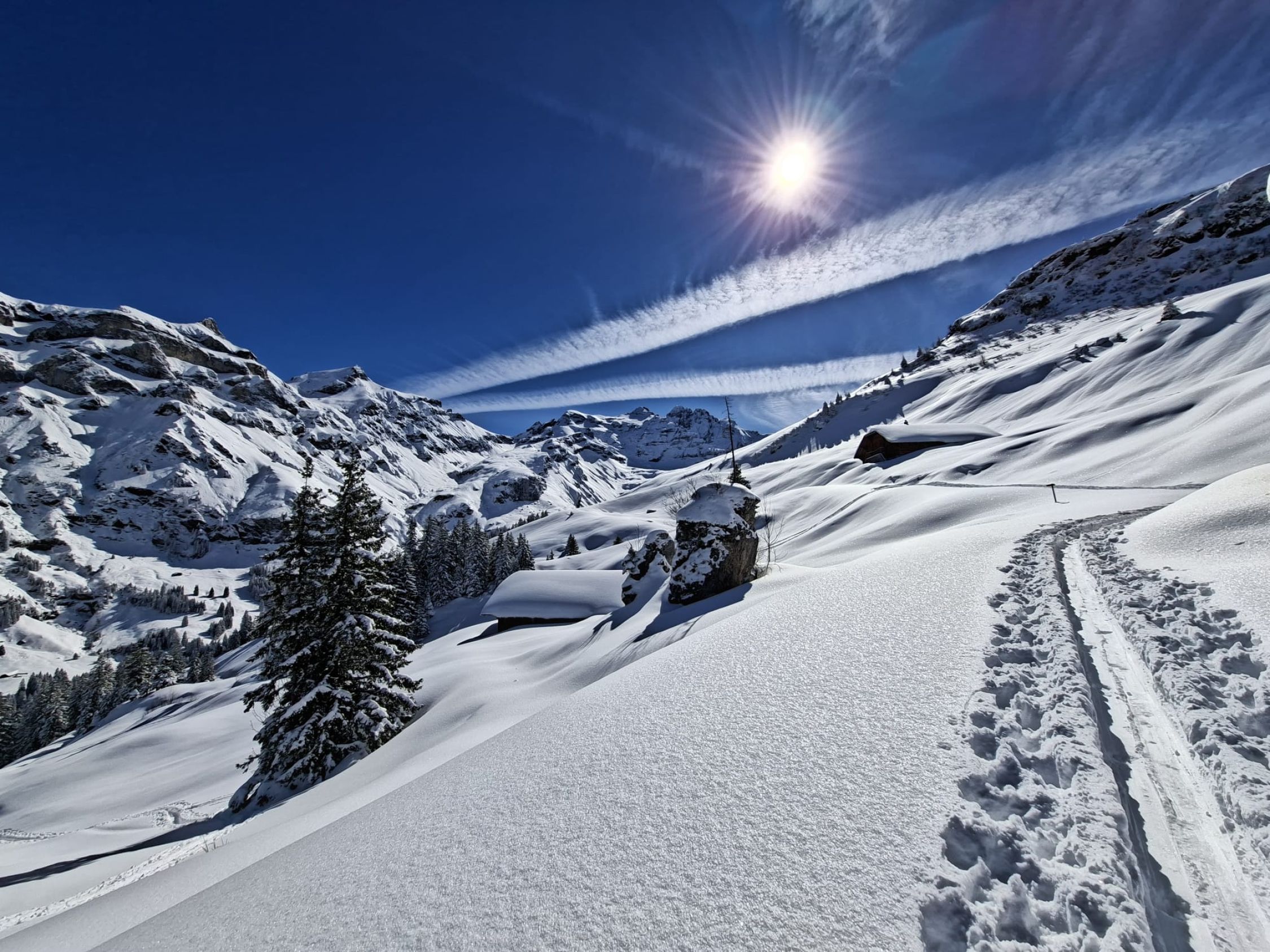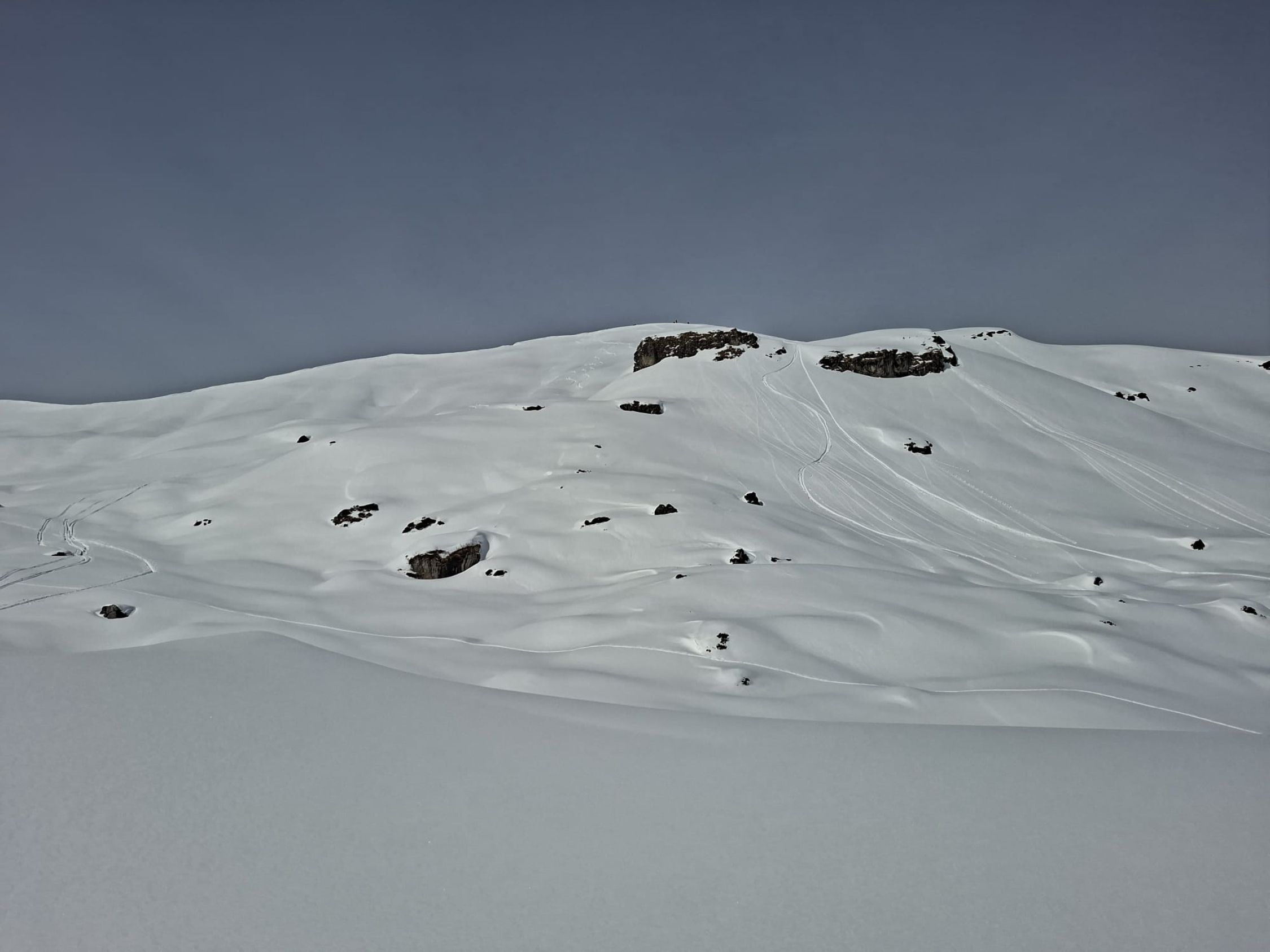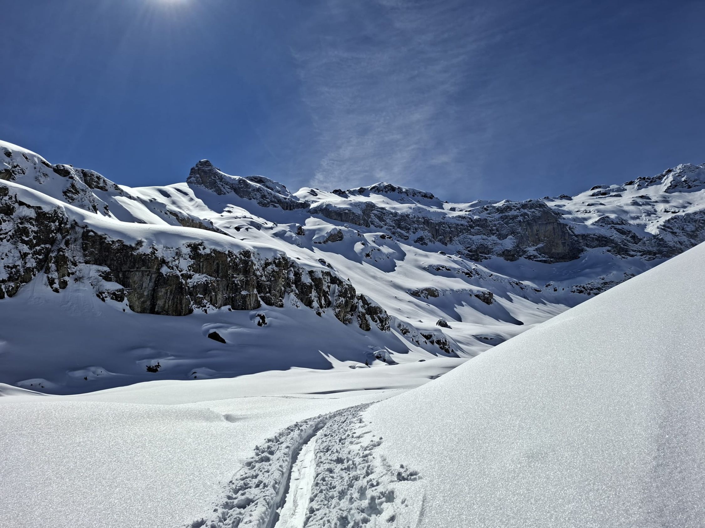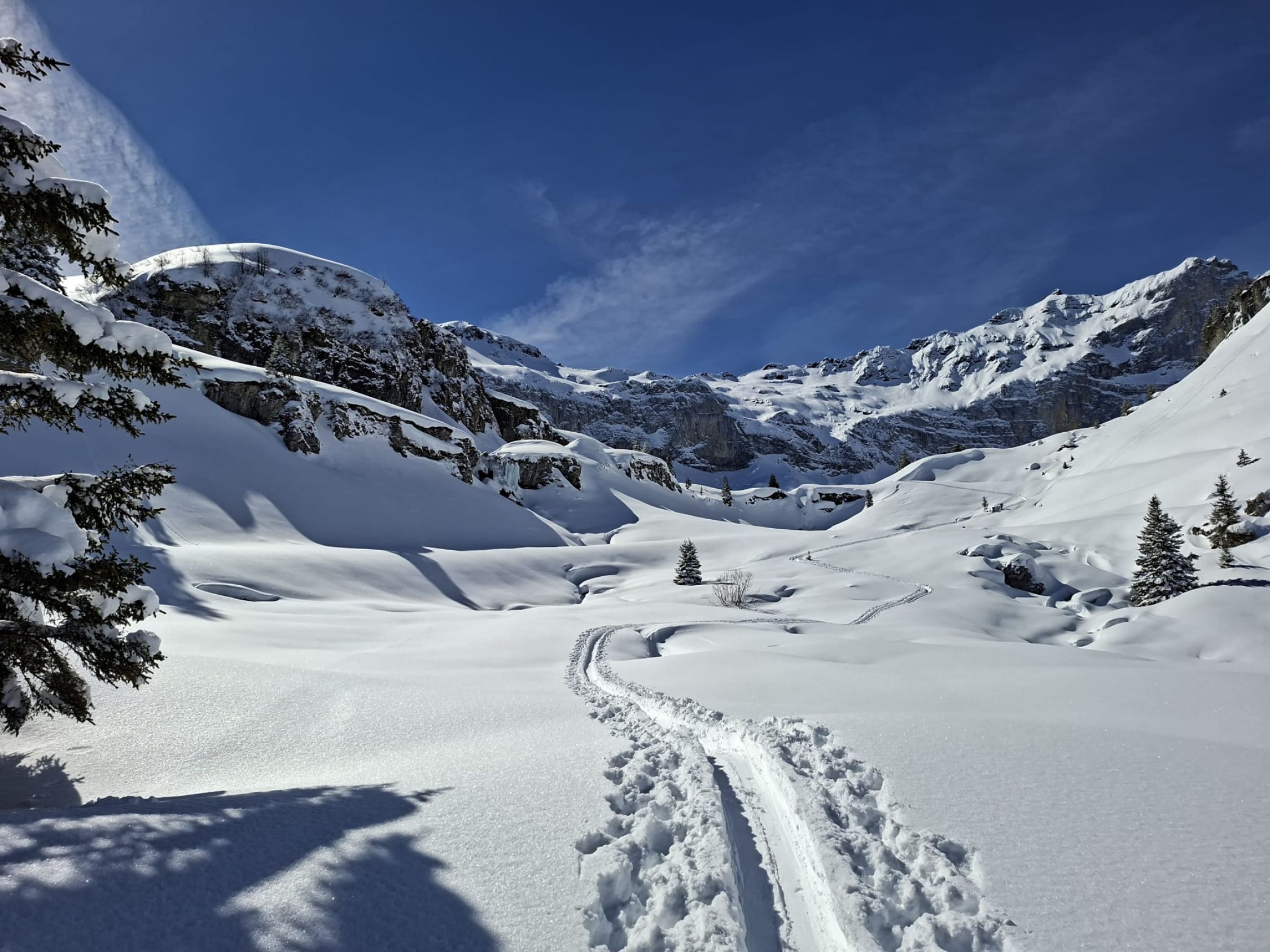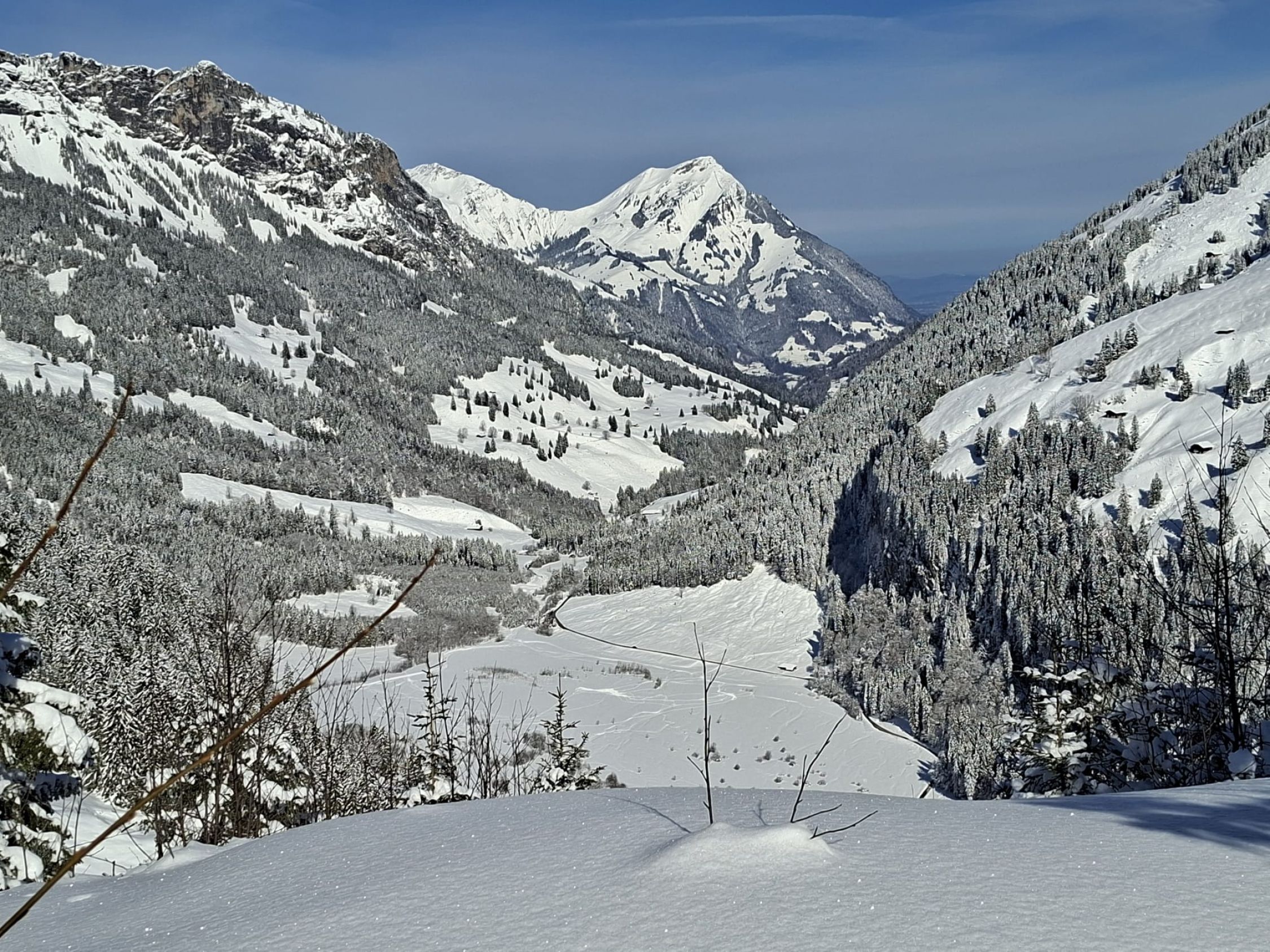 Gestern von Tschingel auf Griesalp und mit Schneeschuhen durch ca. 60cm Neuschnee über kleine Rundroute zurück zur Griesalp. Heute Normalroute auf Chistihubel. Morgens feinster Pulver der dann bei der Abfahrt vom Gipfel v.a. im oberen Teil schon schwer wurde. Abfahrt im Wald hat Spass gemacht v.a. in den schattigen Passagen. War huete einiziges machbares Gipfelziel (vielleicht noch Abeberg). Viele kleine Lawinen auf de anderen Talseite da starke Erwärmung tagsüber. Strasse nach Tschingel gut zu fahren mit wenigen dünnen Stellen. Kann sich aber schnell ändern da dünne Auflage.