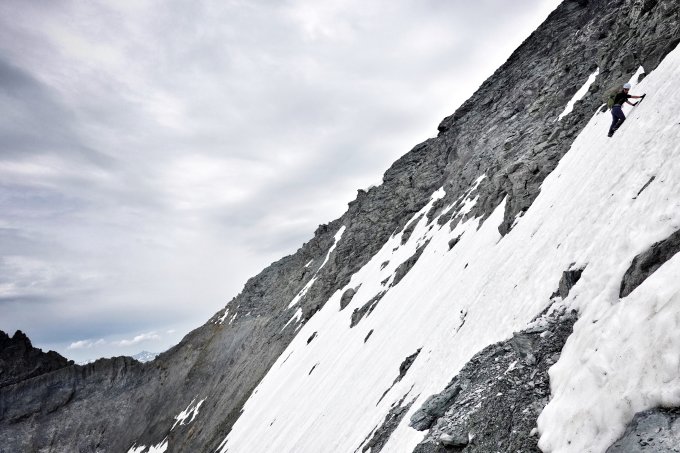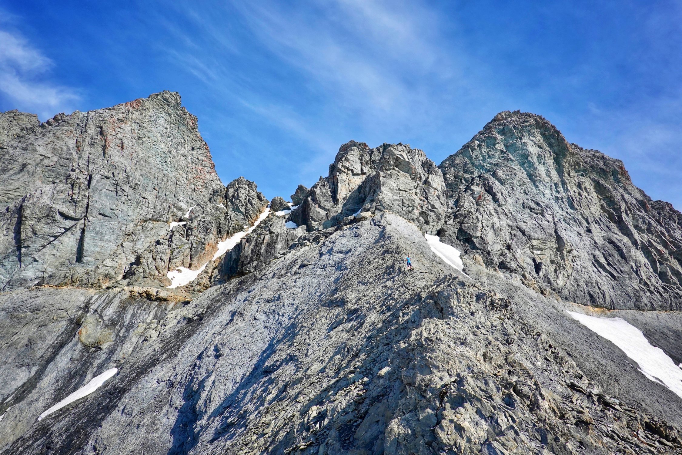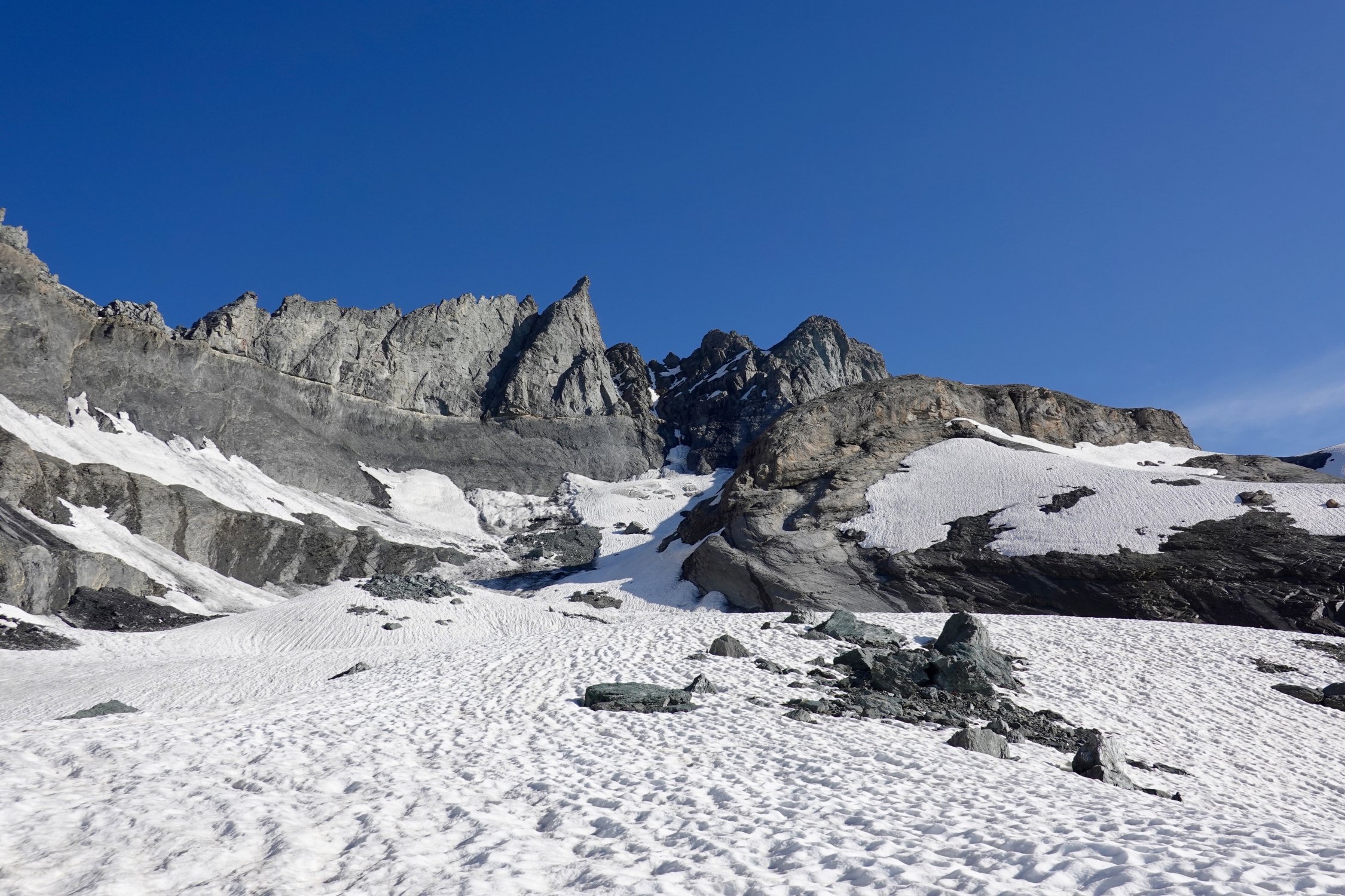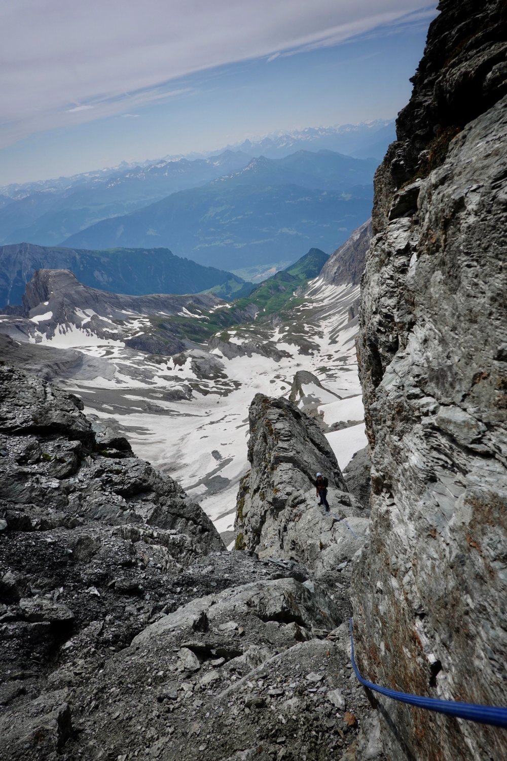 Für den Abstieg ist Abseilen über den Mittelgrat empfehlenswert. Wir nahmen das Tschepband, aber da noch zahlreiche, exponierte Schneefelder vorhanden sind, dürfte die Schwierigkeit im Moment sicher T6 betragen (sonst T5). Pickel notwendig. Ausserdem zeitaufwendig.