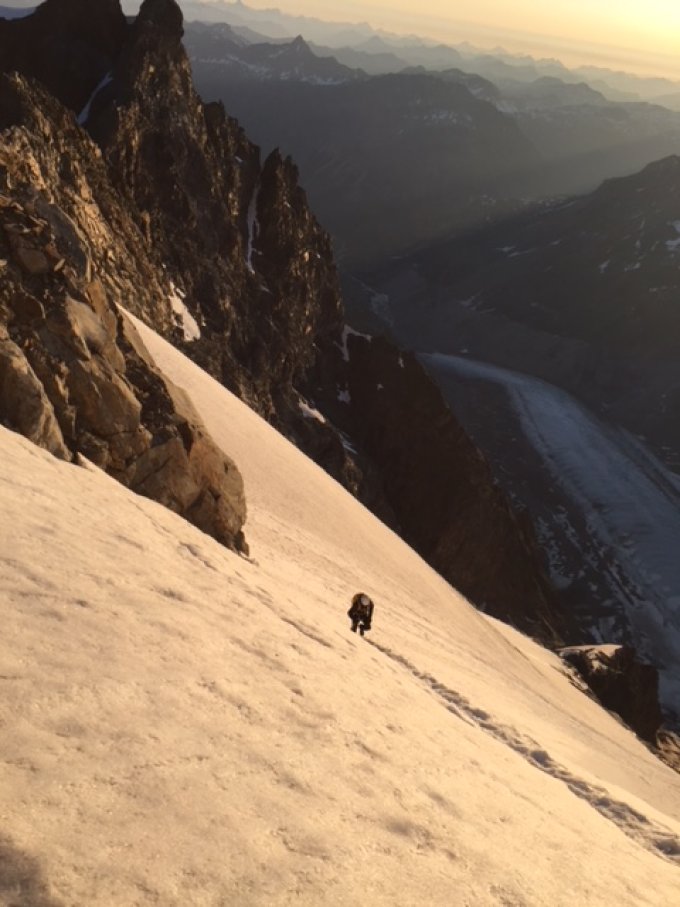 Bei der Steilstufe am Biancograt kommt langsam das Eis durch. Der Verbindungsgrat zum Piz Bernina, sowie der Spallagrat sind komplett schneefrei.