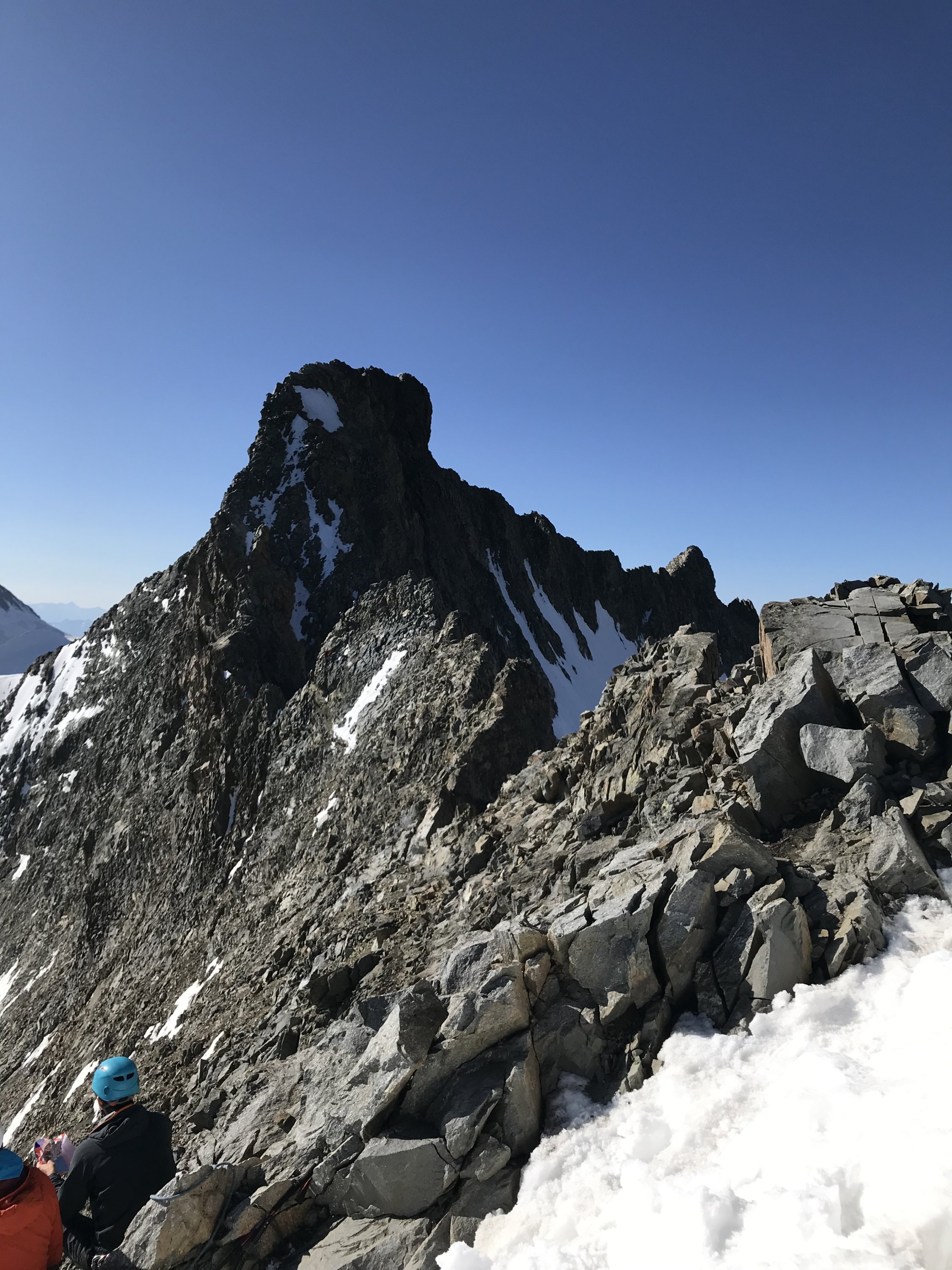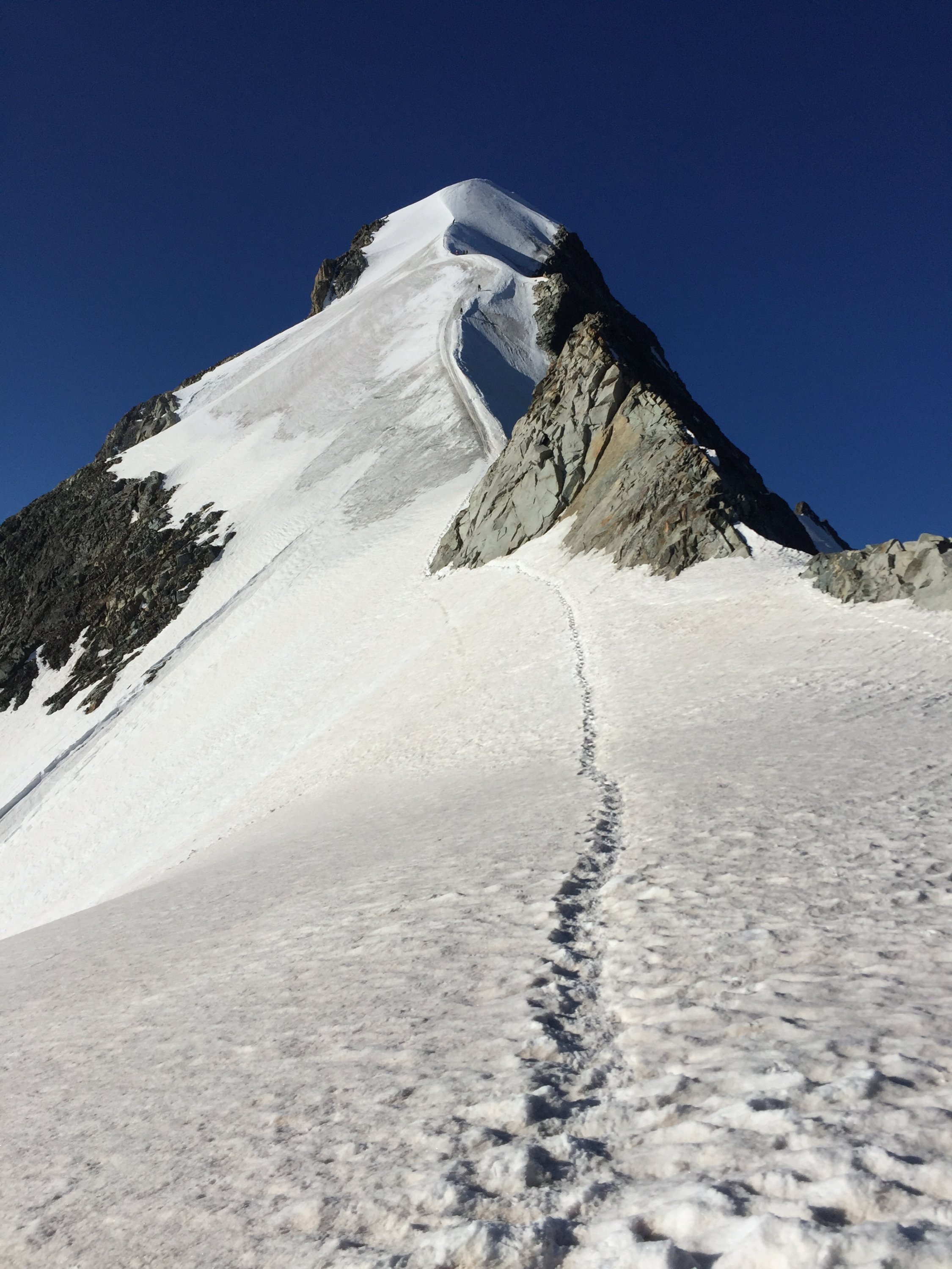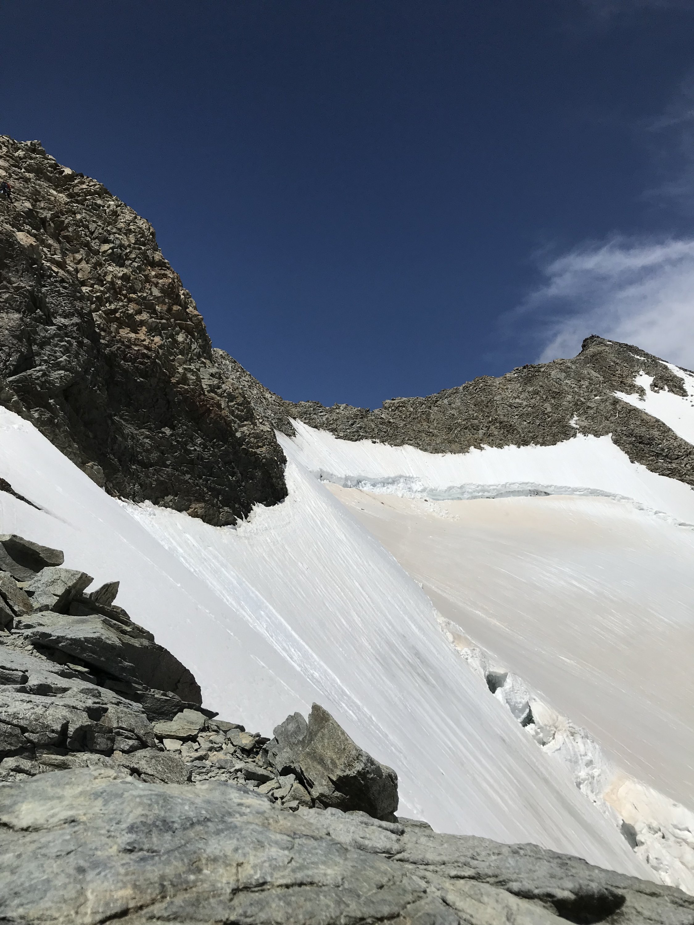 Bei der Steilstufe am Biancograt und der Haifischflosse kommt langsam das Blankeis durch. Die Haifischlosse konnte aber noch ohne Probleme im Schnee umgangen werden. Der Verbindungsgrat vom Piz Piz Alv zum Piz Bernina, sowie der Spallagrat sind schneefrei und gut zu gehen. Vom Rifugio Marco e Rosa auf guter Spur über die Bellavistaterasse zur Fortezza. Abstieg Fortezzagrat ist auch schneefrei und gut zum abseilen eingerichtet.