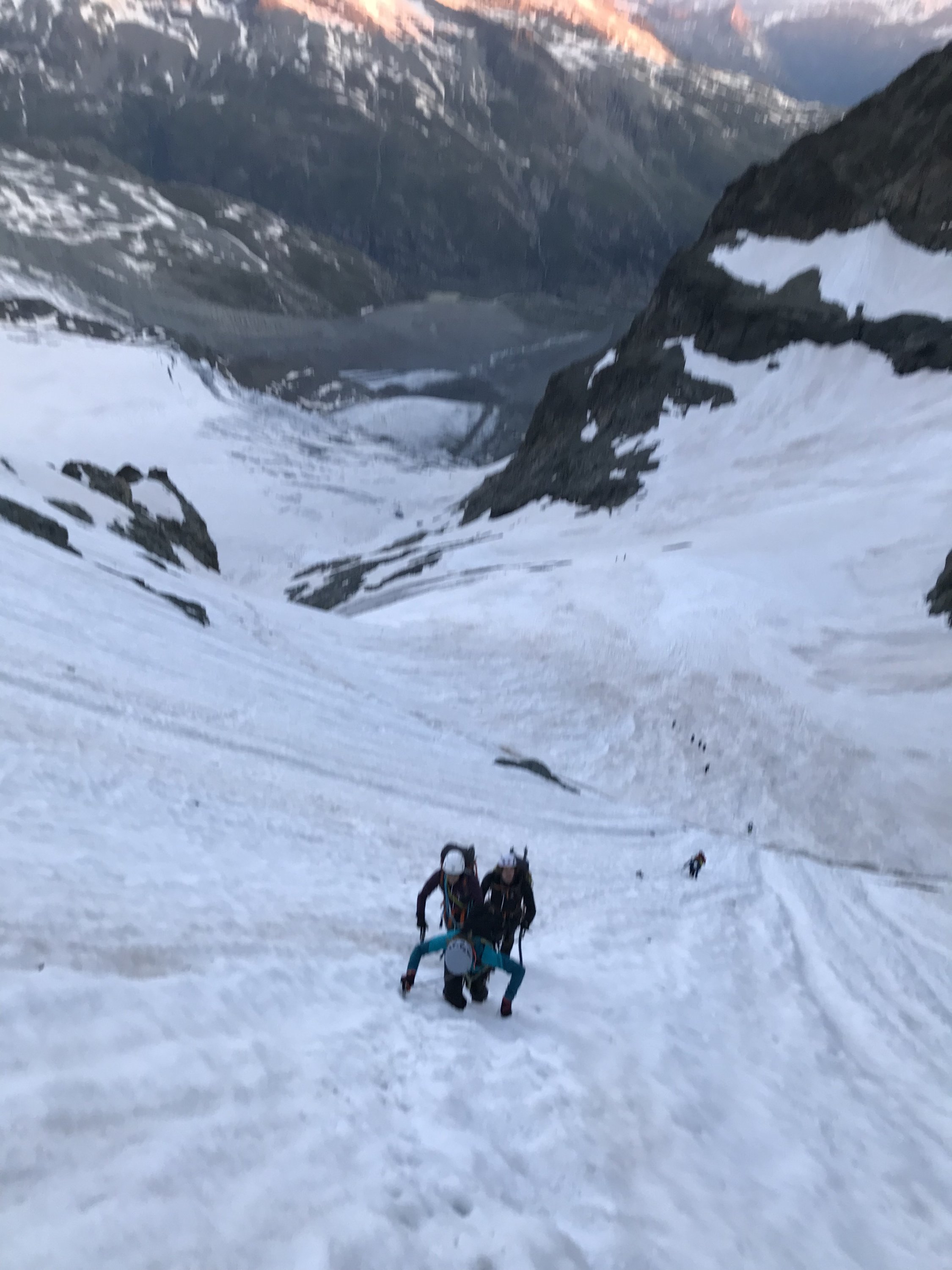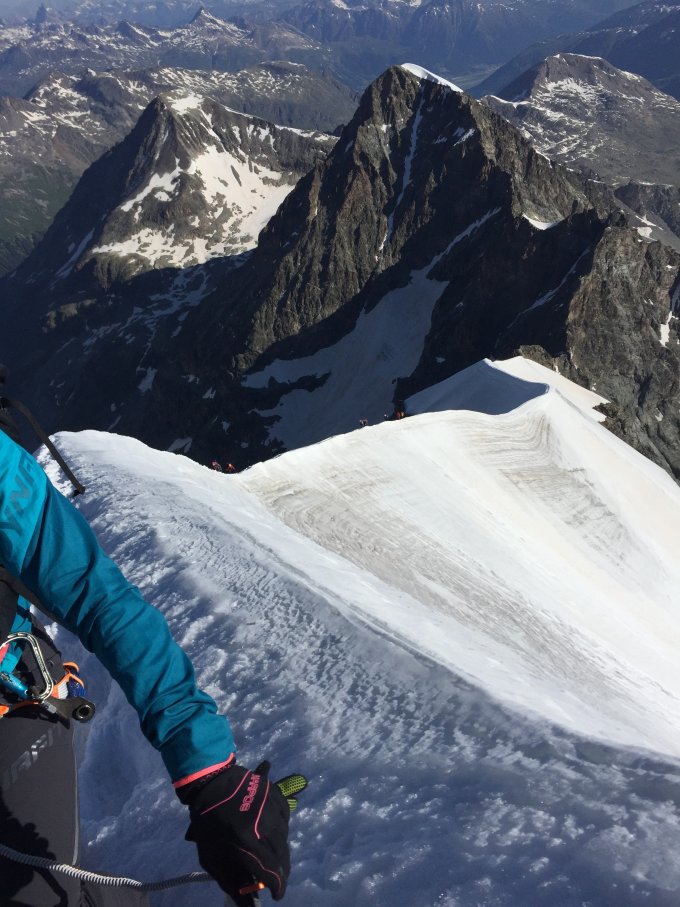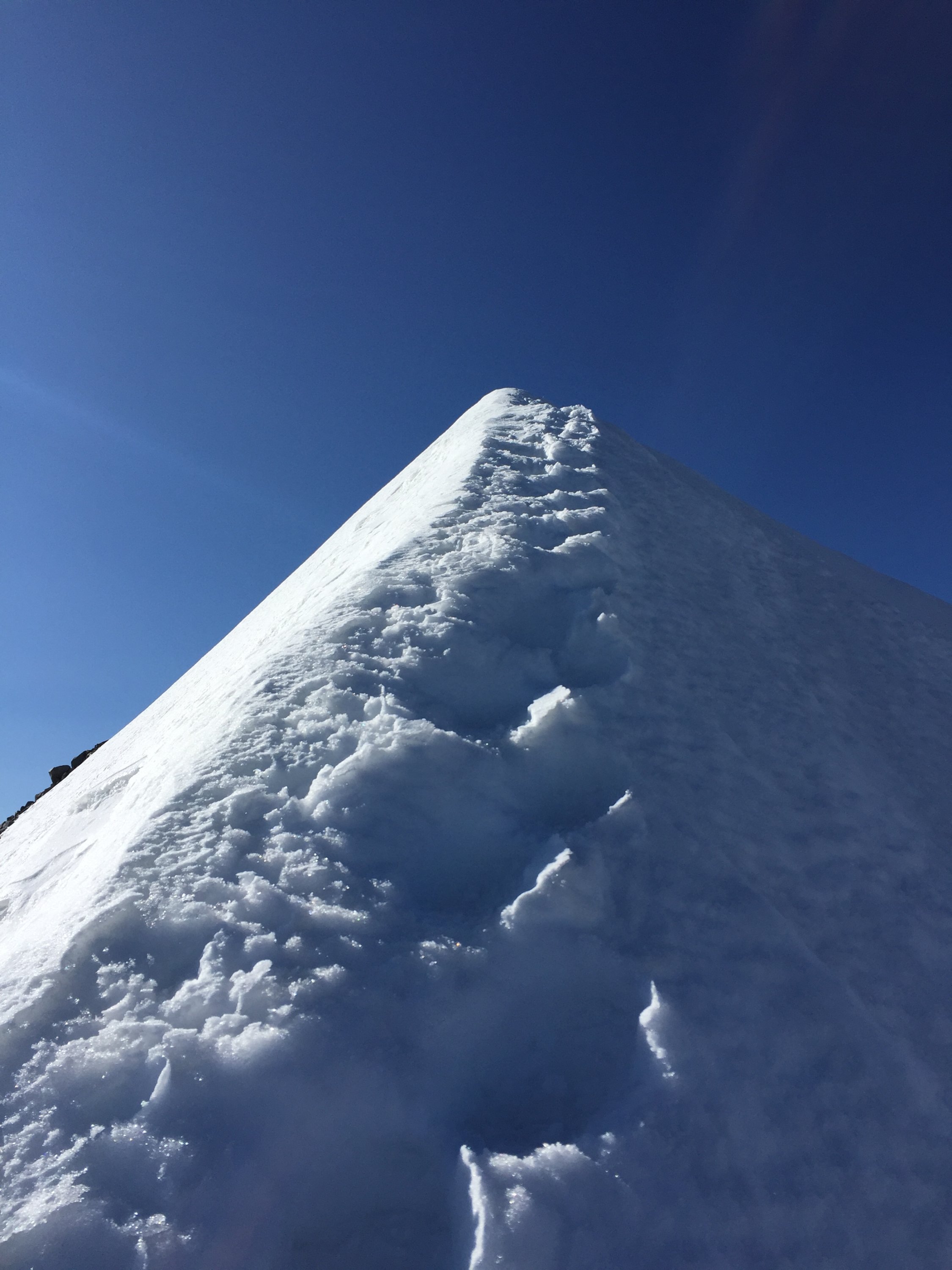 Bei der Steilstufe am Biancograt und der Haifischflosse kommt langsam das Blankeis durch. Die Haifischlosse konnte aber noch ohne Probleme im Schnee umgangen werden. Der Verbindungsgrat vom Piz Piz Alv zum Piz Bernina, sowie der Spallagrat sind schneefrei und gut zu gehen. Vom Rifugio Marco e Rosa auf guter Spur über die Bellavistaterasse zur Fortezza. Abstieg Fortezzagrat ist auch schneefrei und gut zum abseilen eingerichtet.