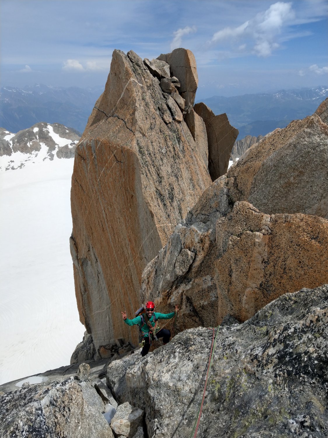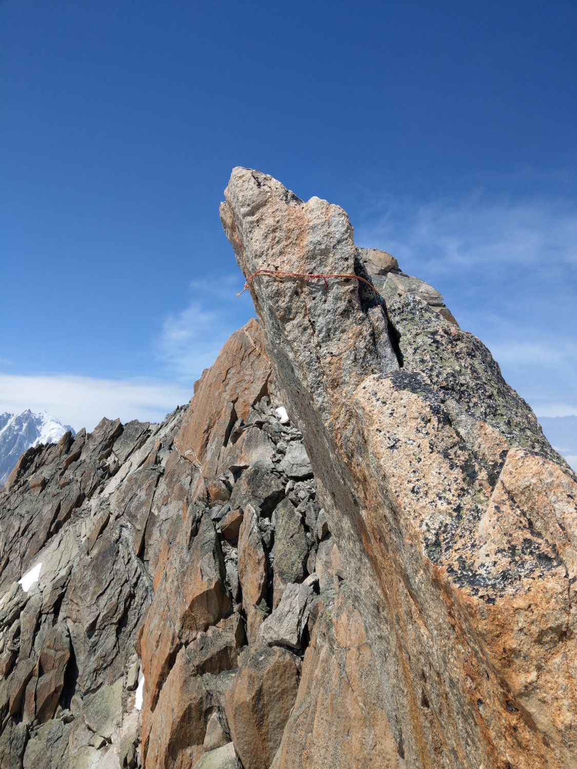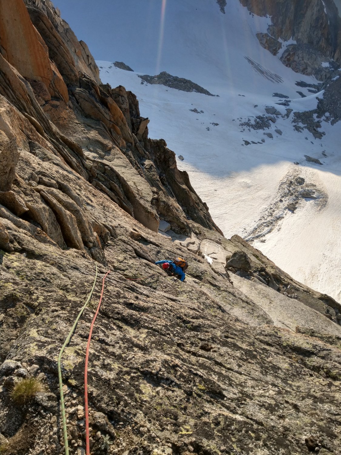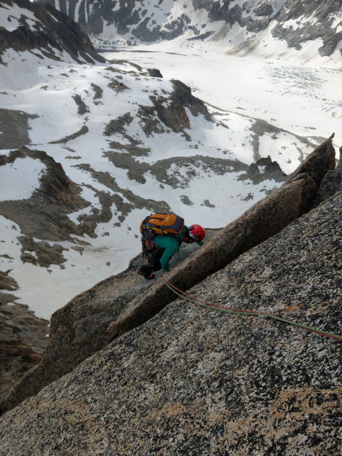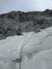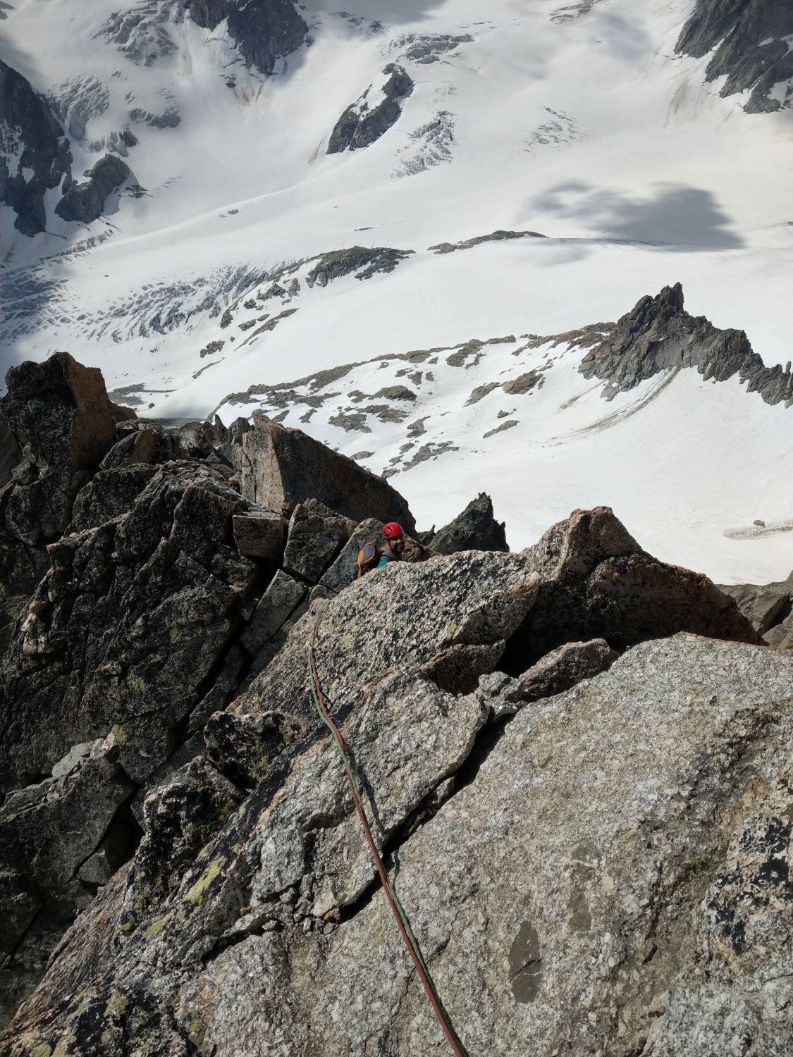 Der Einstieg unterhalb der Brèche Crettez ist sportlich und perfekt abgesichert. Aig. Javelle und Trident liessen wir aus und zogen auf der Südseite in bestem und plattigem Fels diagonal Richtung Col Copt hoch. Die ersten zwei oder drei Züge der Copt-Verschneidung sind tatsächlich so schwer wie überall geschrieben steht. Fühlt sich mit Bergschuhen und Rucksack an wie eine Fb 6c. Im Riss klemmen verschiedene Schlingen und auf der Platte nach dem Ausstieg aus der Verschneidung steckt der erste BH. Ein Satz Cams und Keile ist in der Copt-Verschneidung Pflicht und an einigen anderen Stellen Balsam für flatternde Nerven. Umgehung der Aiguilles sans Nom nordseitig in sehr zweifelhaftem Gelände. Alle Schneefelder können umgangen werden. Der Fels hat hier aber nicht die gewohnte Chamonix-Qualität, sondern erinnert (auch farblich) eher an besten Bietschhornbruch. Alles will zuerst abgeklopft sein und man ist irgendwann nicht mehr überrascht, wenn selbst Blöcke im Kühlschrankformat zu wackeln beginnen. Aiguilles Penchées und Aiguille de la Varappe dann wieder bester Fels (wie eigentlich immer auf dem Grat, nordseitig nahe dem Grat oder südseitig). Zwischen Tête Fynn und Aiguille de la Varappe sind wir insgesamt etwa vier Mal kurze Stellen abgeseilt. 12.45 standen wir auf dem W-Gipfel der Aig. Varappe und damit der letzten Erhebung dieser Überschreitung. Rund 50m westlich des W-Gipfels der Aig. Varappe, wo der Grat ins Leere abbricht, beginnt eine neue Abseilpiste an Inox-Ständen (2 x 50m Seil empfohlen, Zwischenstände nach 25m an Schlingen), welche direkt dem Grat folgt. In der Hütte liegt ein Topo inkl. Beschreibung dieser Piste auf. Wir verpassten aber den dritten Stand und seilten anschliessend an historischen Schlingenständen über die brüchige Flanke mehr oder weniger in Falllinie ab. Dies hatte den Vorteil, dass wir am linken Rand über den Bergschrund abseilen konnten, wo er noch kaum geöffnet ist.