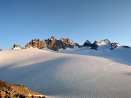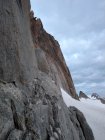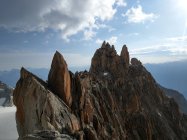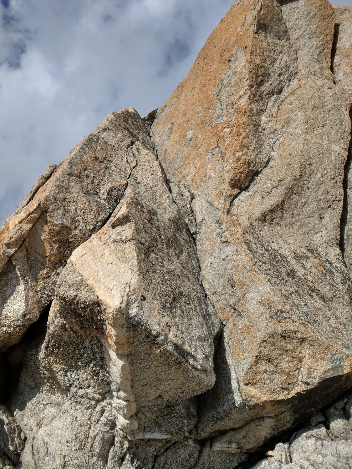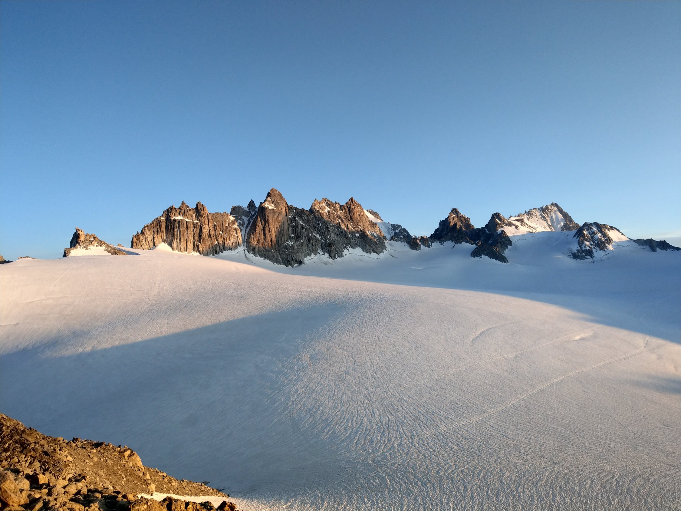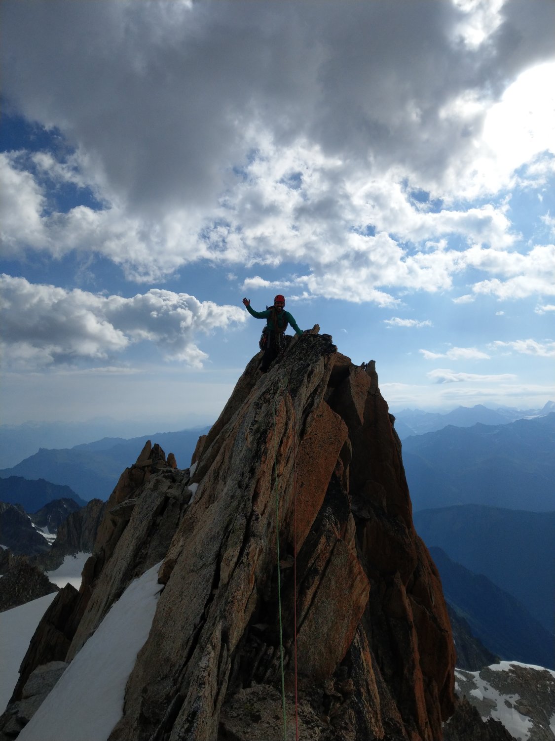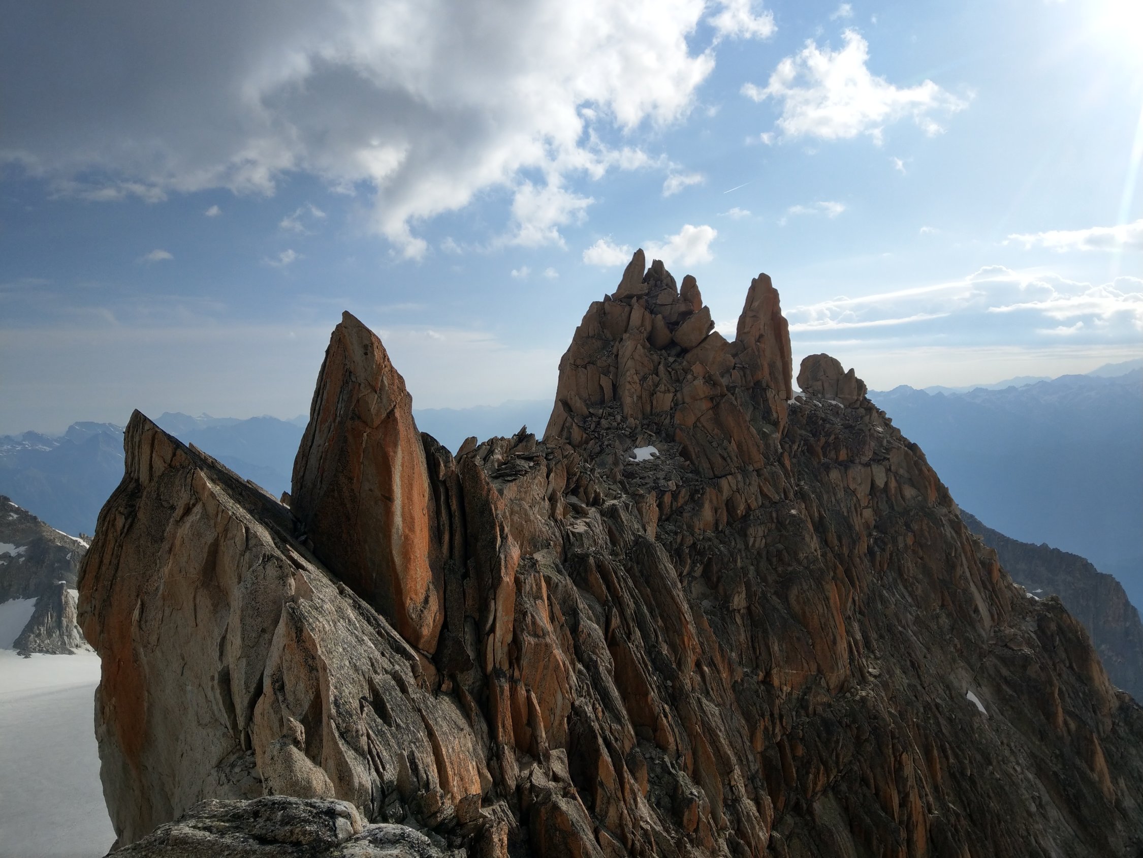 Der Einstieg unterhalb der Brèche Crettez ist sportlich und perfekt abgesichert. Aig. Javelle und Trident liessen wir aus und zogen auf der Südseite in bestem und plattigem Fels diagonal Richtung Col Copt hoch. Die ersten zwei oder drei Züge der Copt-Verschneidung sind tatsächlich so schwer wie überall geschrieben steht. Fühlt sich mit Bergschuhen und Rucksack an wie eine Fb 6c. Im Riss klemmen verschiedene Schlingen und auf der Platte nach dem Ausstieg aus der Verschneidung steckt der erste BH. Ein Satz Cams und Keile ist in der Copt-Verschneidung Pflicht und an einigen anderen Stellen Balsam für flatternde Nerven. Umgehung der Aiguilles sans Nom nordseitig in sehr zweifelhaftem Gelände. Alle Schneefelder können umgangen werden. Der Fels hat hier aber nicht die gewohnte Chamonix-Qualität, sondern erinnert (auch farblich) eher an besten Bietschhornbruch. Alles will zuerst abgeklopft sein und man ist irgendwann nicht mehr überrascht, wenn selbst Blöcke im Kühlschrankformat zu wackeln beginnen. Aiguilles Penchées und Aiguille de la Varappe dann wieder bester Fels (wie eigentlich immer auf dem Grat, nordseitig nahe dem Grat oder südseitig). Zwischen Tête Fynn und Aiguille de la Varappe sind wir insgesamt etwa vier Mal kurze Stellen abgeseilt. 12.45 standen wir auf dem W-Gipfel der Aig. Varappe und damit der letzten Erhebung dieser Überschreitung. Rund 50m westlich des W-Gipfels der Aig. Varappe, wo der Grat ins Leere abbricht, beginnt eine neue Abseilpiste an Inox-Ständen (2 x 50m Seil empfohlen, Zwischenstände nach 25m an Schlingen), welche direkt dem Grat folgt. In der Hütte liegt ein Topo inkl. Beschreibung dieser Piste auf. Wir verpassten aber den dritten Stand und seilten anschliessend an historischen Schlingenständen über die brüchige Flanke mehr oder weniger in Falllinie ab. Dies hatte den Vorteil, dass wir am linken Rand über den Bergschrund abseilen konnten, wo er noch kaum geöffnet ist.