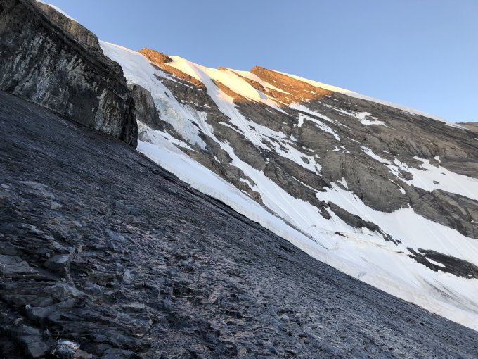 Die Tour war gut machbar. Abgesehen von ein paar wenigen, kurzen Blankeisstellen war der Firn durchgehend griffig und angenehm. Eine Schlüsselstelle war die erste plattige Steilstufe. Wir haben die dünn vereisten Platten etwa 25m unter der oberen Begrenzung auf einem schwach ausgeprägten, horizontalen Band gequert (zweitletztes Foto). Alternativ könnten die Platten deutlich tiefer westlich umgangen werden (letztes Foto). Ansonsten möglichst auf dem Grat bleiben, dort liegt weniger Schutt als in der Flanke und zwischendurch kann man sogar ein paar Züge klettern. Der Firn im Abstieg war ebenfalls noch gut.