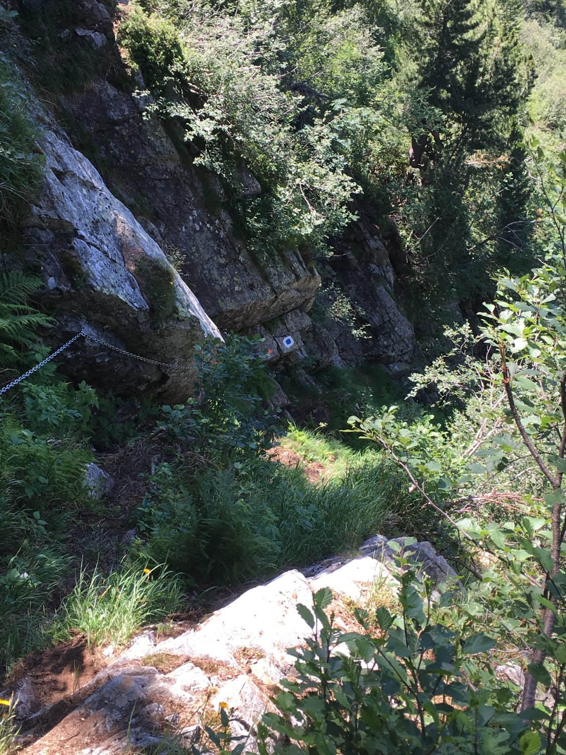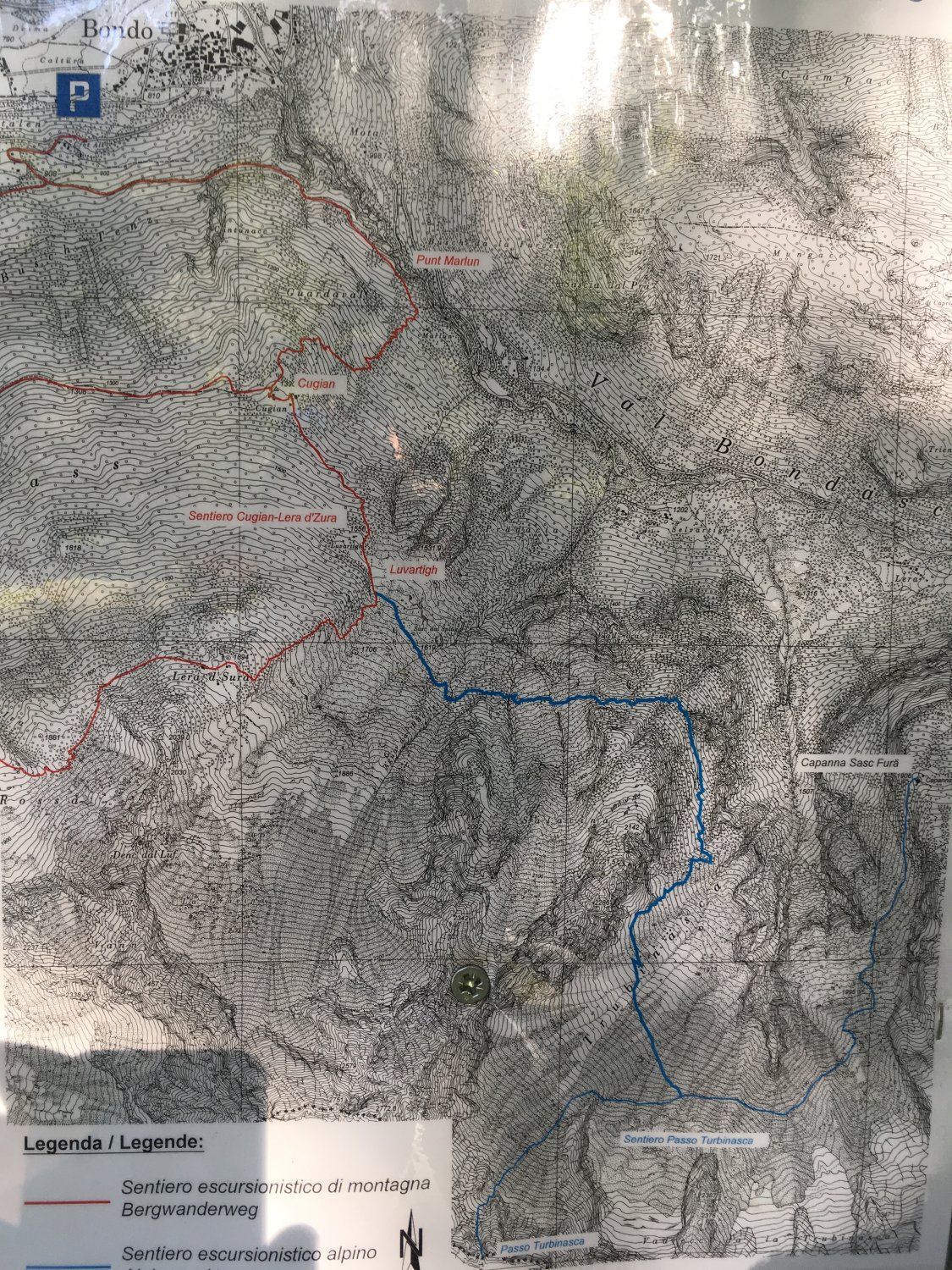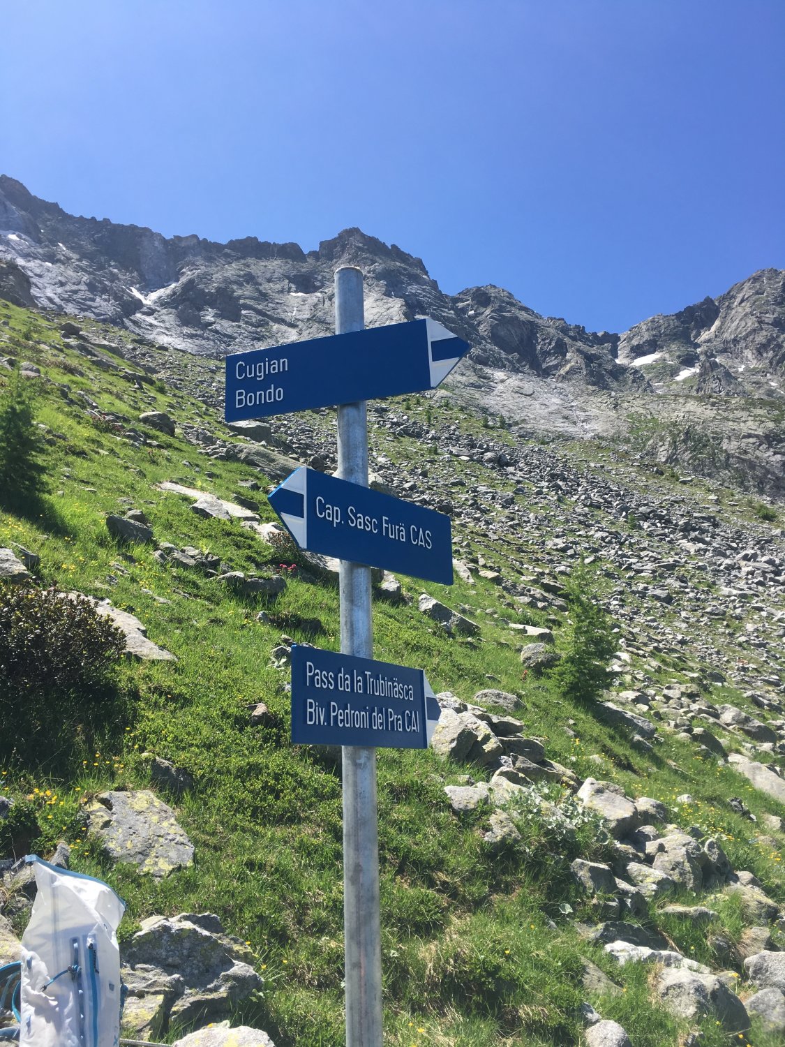 Start um 8 Uhr neuer Parkplatz überhalb Bondo. 12 Grad, windstill. Ich bin den rotweiss markierten Wanderweg zuerst auf alter Bondasca Strasse und kurz vor kaputter Brücke steil bis Luvartigh 1553 m und noch etwas weiter auf dem Wanderweg. Ab Höhe 1600 m fängt der neue Hüttenweg an, der sich in auf und ab Richtung Osten durch unübersichtliches Schroffengelände unterhalb Salecina auf etwa 1750 m befindet. Mit Ketten und Eisenstangen ist der Weg bestens abgesichert, man hat kein Problem mit der Orientierung. Ab Höhe 1800 m erreichte ich das wunderschöne Trubinasca Gelände westlich der Schlucht. Nun geht es über Blöcke bis auf Höhe 2180 m zum Trubinasca Weg und wieder hinunter zur Sasc Furä Hütte. Aus zeitlichen Gründen machte ich beim Trubinasca Weg auf Höhe 2180 m kehrt.