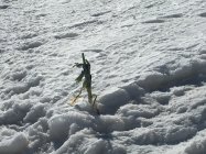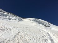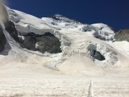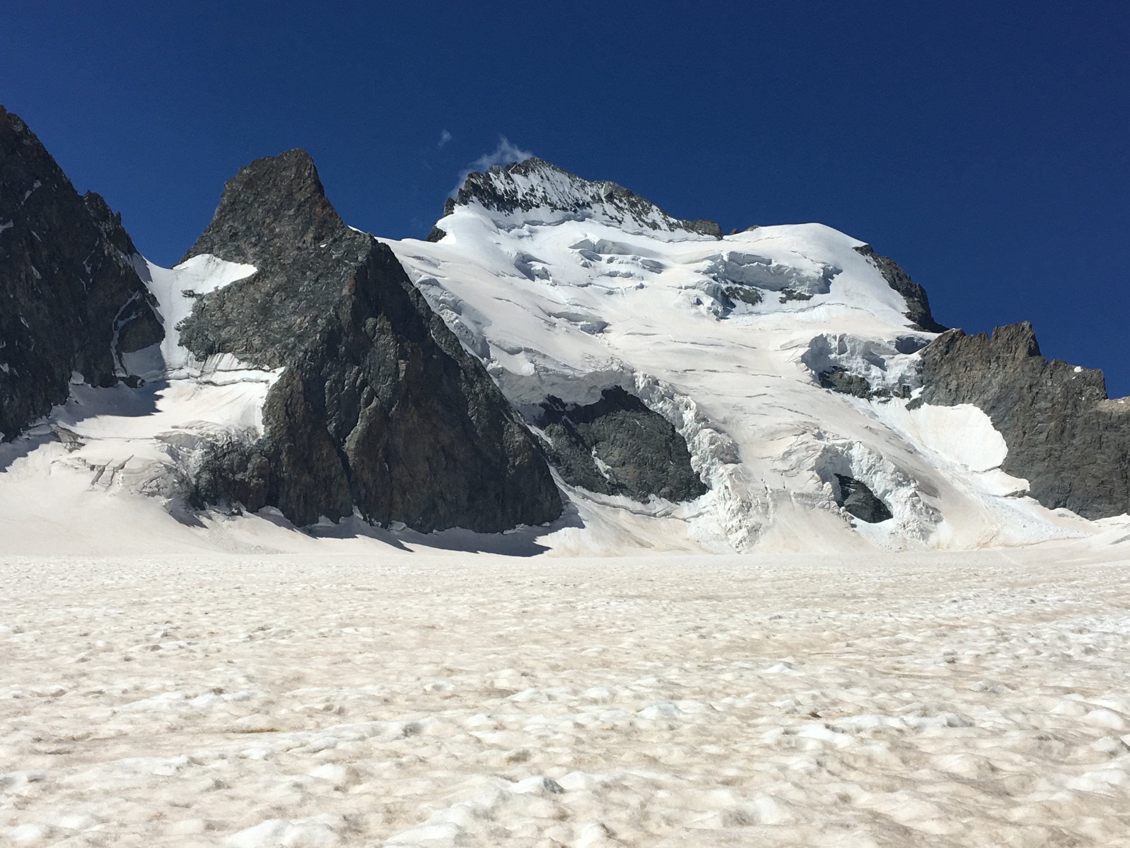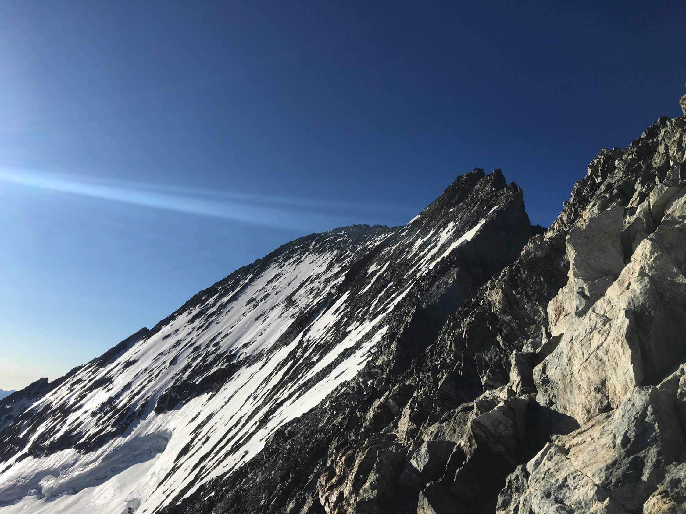 Nach sternklarer Nacht alles pickelhart gefroren. Dank (noch) stabiler (Hart-)Schneeauflage auf guter Spur direkt zwischen den beiden Felsinseln hoch und gegen 3600 m in die Normalroute eingeschnitten. Z.T. erchreckend grosse Spalten, die Brücken sind aber noch stabil. Breche Loiry mit beginnender Ausaperung (bereits wenig Blankeis). Westgrat aper. Wolkenlos, wie gemeldet, in den frühen Morgenstunden ging jedoch ein zügiges Lüftchen.