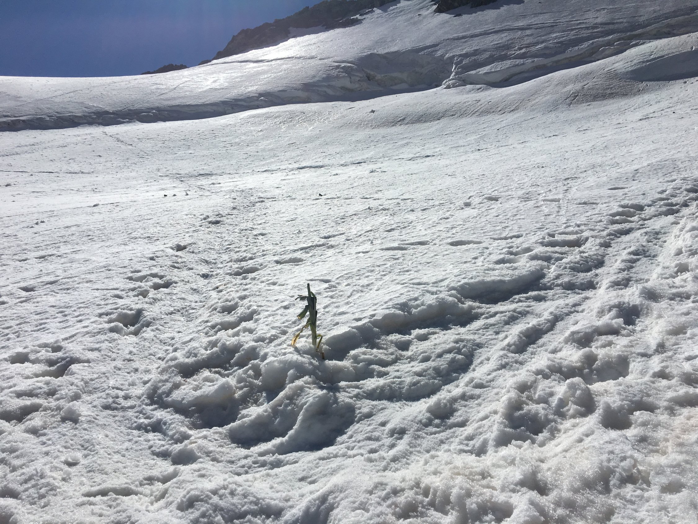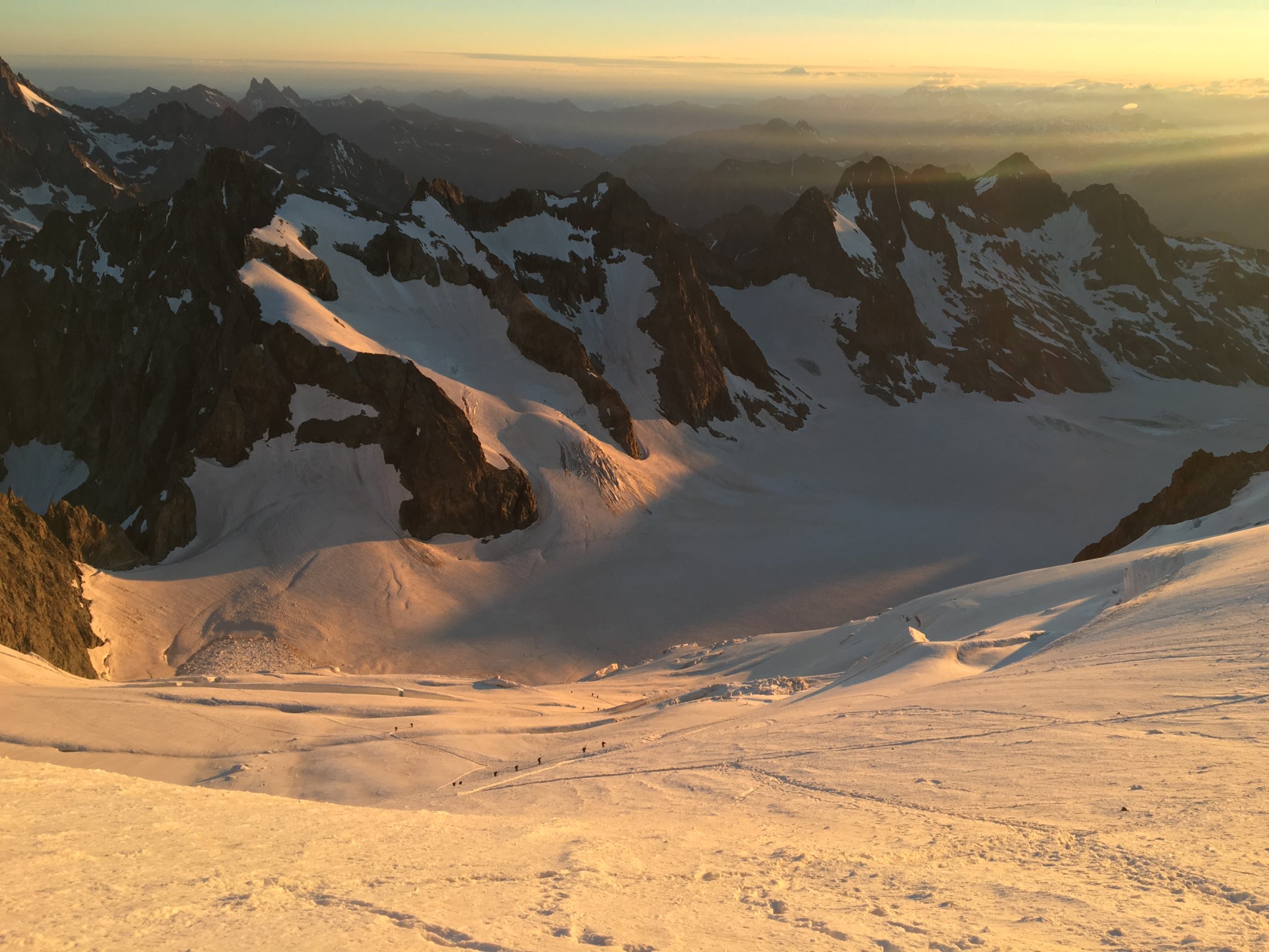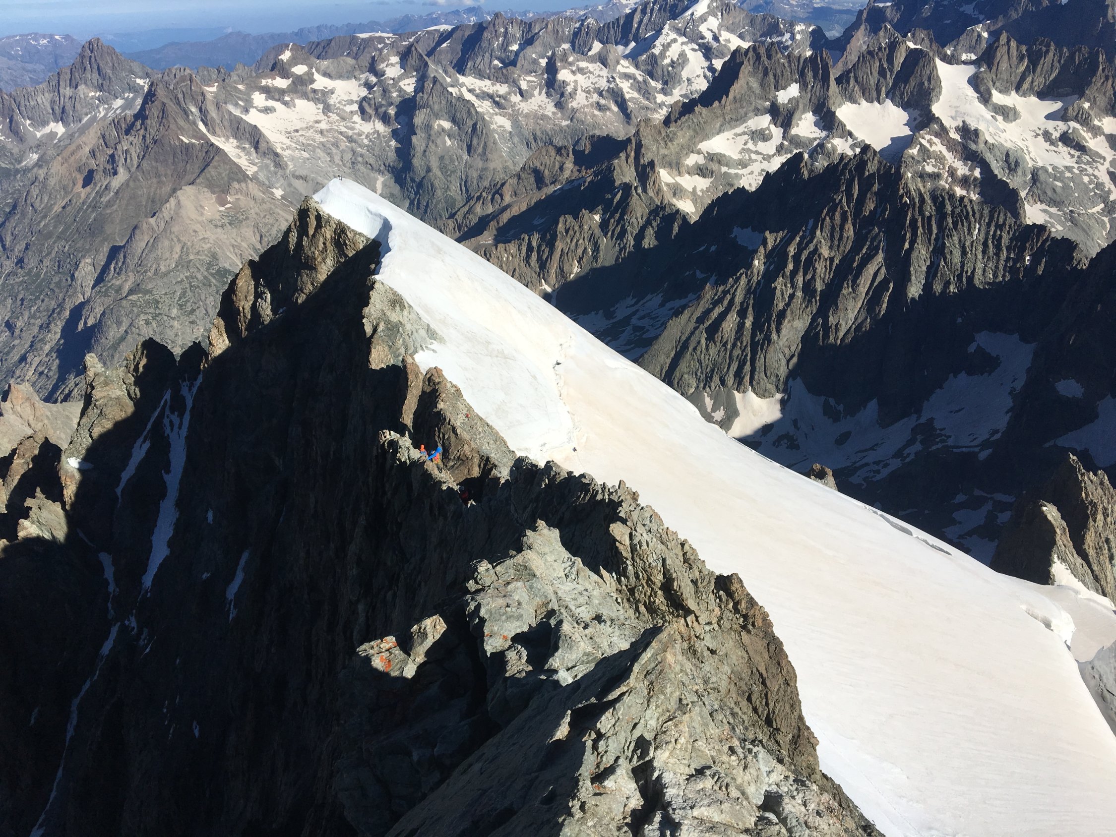 Die nicht recht passenden Wetterprognosen für den gesamten Alpenhauptkamm am Freitag nahmen wir zum Anlass, denn südlichsten Alpenviertausender zu besuchen. Für eine PD+ Bewertung fanden wir den Einstieg in den Grat von der Breche Loiry recht sportlich. Dies mag wohl daran liegen, dass der Eberlein Dauphiné Führer 1988 den Einstieg etwa 30 m weiter östlich der Breche Loiry verzeichnet - bedingt durch den Gletscherschwund ist dieser nun aber direkt in der Breche, was die Schwierigkeiten deutlich erhöht (eher ZS/III für die Einzelstelle). Die Stelle von unterhalb des Bergschrunds anzugehen unterlässt man besser, von oben (vom Dome de neige) kommend, ist es deutlich besser (es sei denn, man möchte über 10 m 45 min investieren, um einmal das gesamte Materialsortiment einzusetzen wie wir es (un)sinnigerweise taten). Oberhalb der Breche riss dann beim nachsteiger noch das kurze Fixseil, zum Glück passierte ausser ein paar Schrammen und Bekanntschaft mit dem bergschrund nichts.