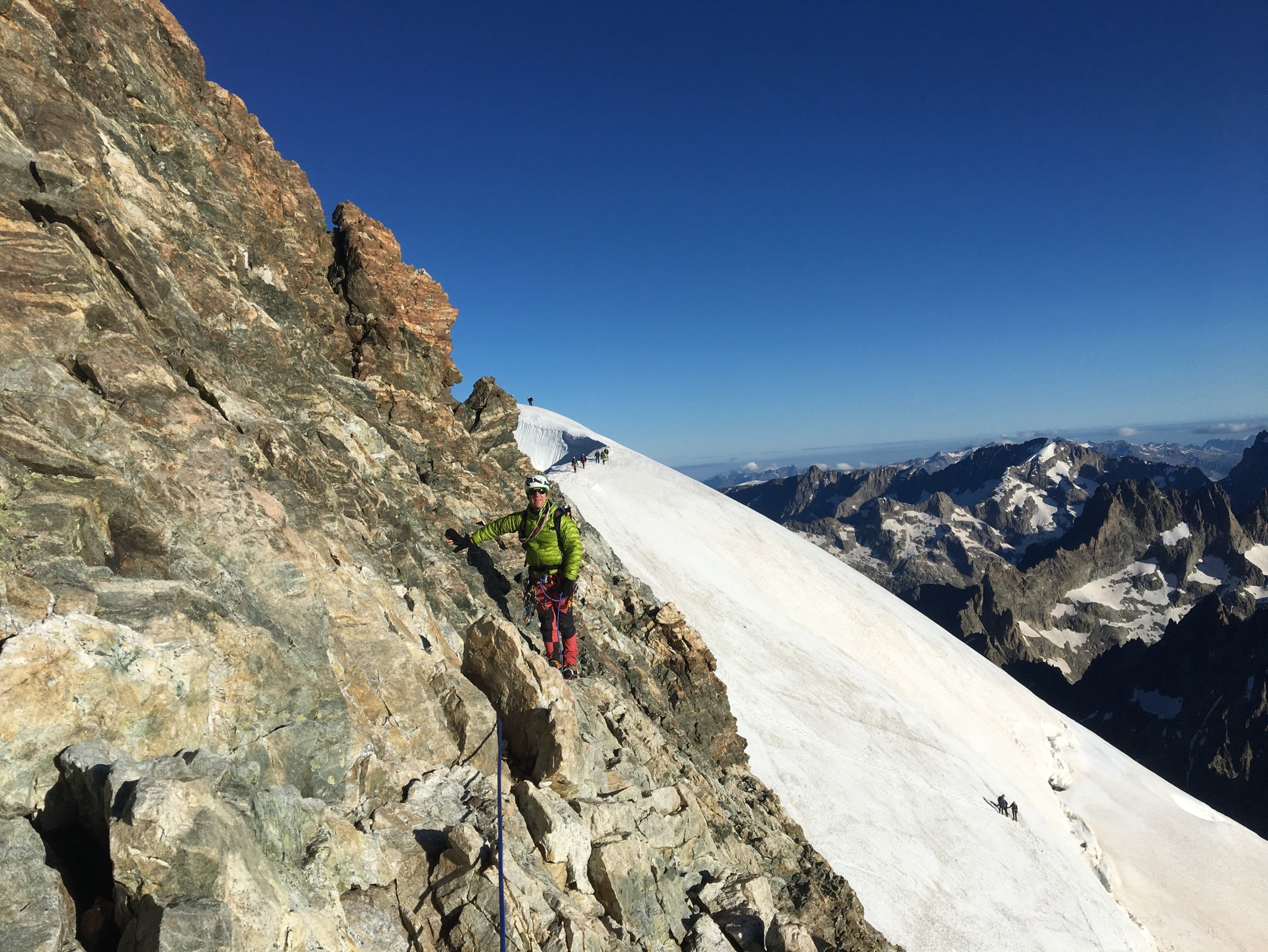 Ecrins Hütte gut besucht, am Morgen etwa 30 Personen mit Ziel Barre des Écrins. Einige Seilschaften wählten die Variante über das kleine Nordwändchen/NO -Grat, einige hatten nur den Dome de Neige zum Ziel. Dadurch kein Stau am Westgrat.