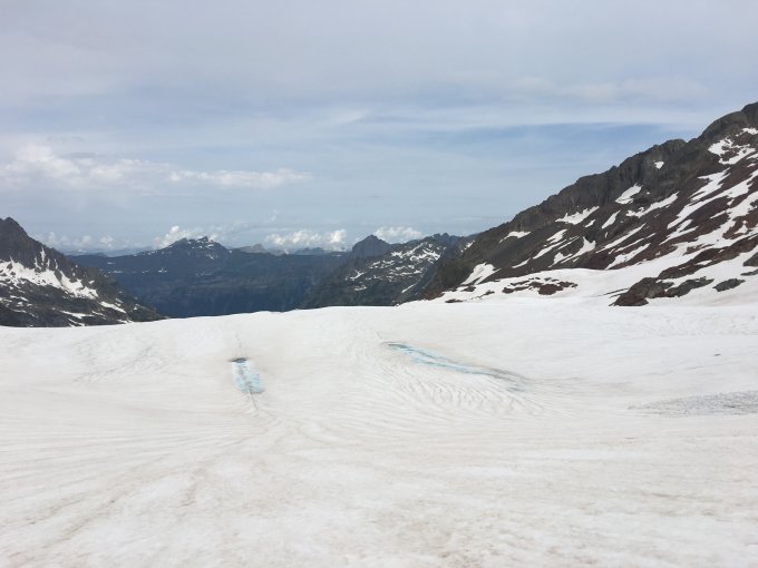 Gletscher komplett schneebedeckt. Gipfelaufbau schneefrei. Ideale Bedingungen.