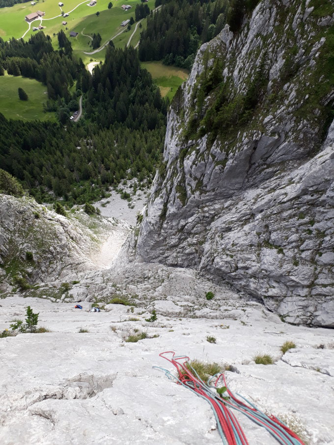 Abstieg: Vom Gipfel nach Osten abseilen (1x40 m oder 2x20 [laut Plaisir, ich habe den Zwischenstand nicht gesehen]). Dann um den nächsten Gipfel auf der Nordseite herum und erneut 20 m abseilen in einer Rinne (grosser Abseilhaken an der Wand). Nun Aufstieg und Traverse der nächsten Gruppe, bis man eine Art Sattel erreicht, bei dem östlich sehr viele einzelne Steine liegen. Wir sind an der Gipfelgruppe vorher schon ins Kar abgestiegen, was falsch war und in sehr steilem Gelände endet. Abstieg in gut sichtbarem Weg (nicht nur Wegspuren), südlich von P. 1935 bis zum Wanderweg auf Weide und dann zurück zum Parkplatz.