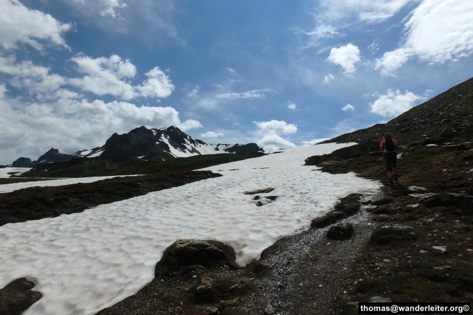 Zwischen dem Pass Lunghin und dem Lägh dal Lunghin ist ein fast durchgehendes Schneefeld.