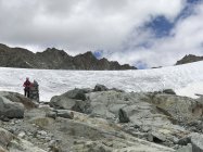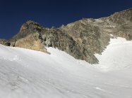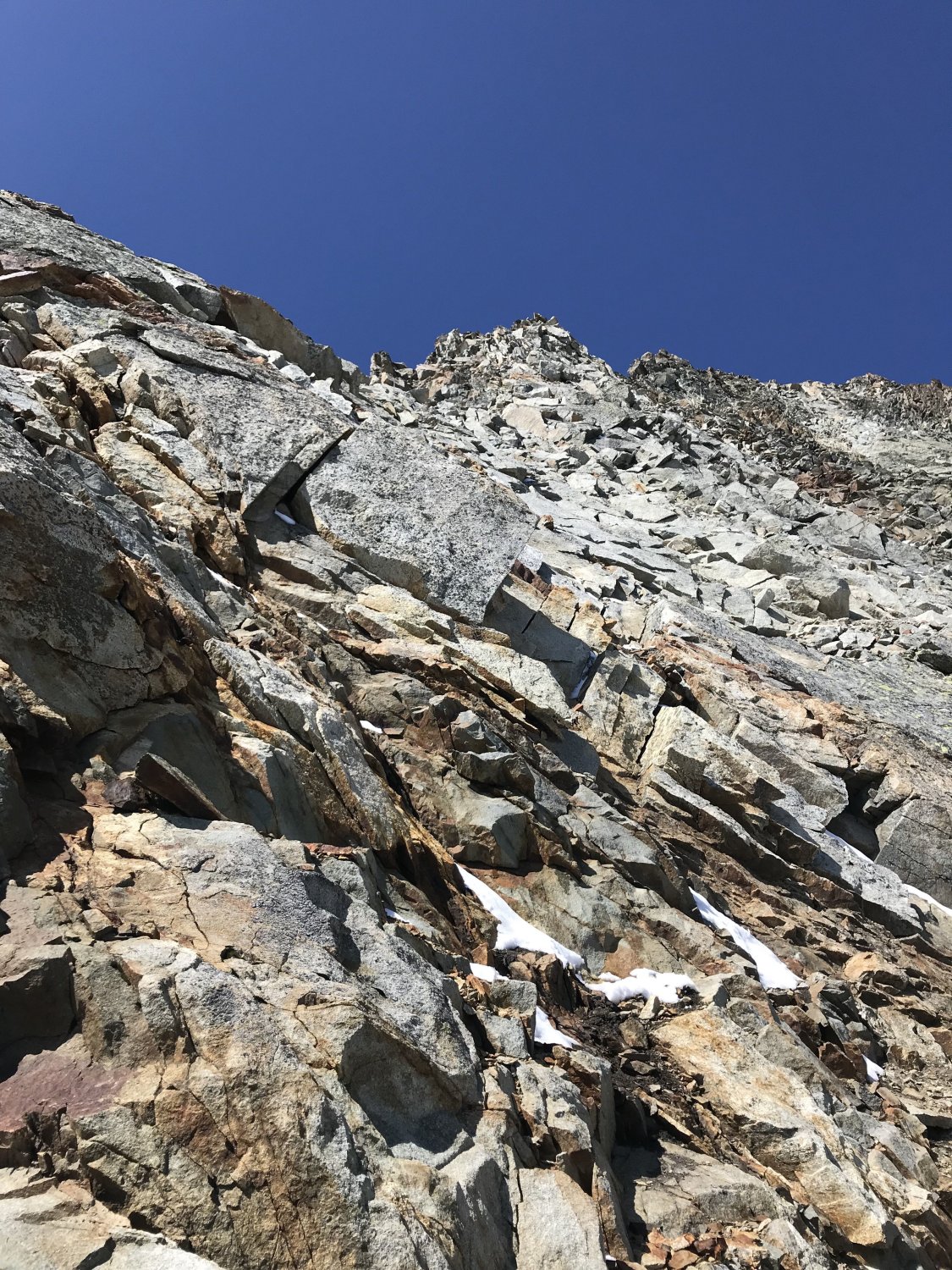 Fels weitgehend trocken, abgesehen der lästigen nasse Platte im unteren Teil. Ab der Scharte vermehrt Schneespuren, die absolut nicht störten, sondern eher den Weg der vorangehenden Seilschaften zeigten.