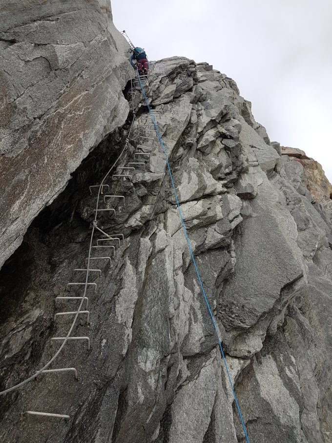 Glecier without cravasses. Crampons perhaps useful for the last 30 m but with good track not required. Access to the via ferrata already requires some pull-ups because snow level is a bit low and wall pretty wett. Rest of the route is fine.