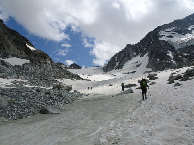 Der Gewitterschnee auf dem obersten Gletscherarm hilft sicherlich ein bisschen, aber die anhaltend hohen Temperaturen helfen nicht, die Tour einfacher und sichere zu machen.