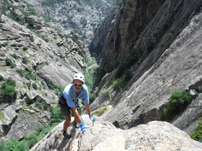 Einst ein kostenpflichtiger Klettersteig, ist dieser nun offengelassen. Aufgrund spärlicher Einträge im Internet hierüber (Führerliteratur gibt es bisher nicht über Klettersteige in Korsika) nahm ich zuvor Kontakt auf zum damaligen Outdoor-Betreiber des KS: Rêves de Cimes in Mezzavia. Dort wurde mir bestätigt, dass man diesen KS inzwischen frei begehen kann. Aufgrund geänderter französischer Gesetzgebung hinsichtlich des Haftungsrechts, hat man sich als ehem. Betreiber von dieser Steiganlage zurückgezogen. Ob dies fatalistisches Ende für die Route bedeutet, halte ich für nicht besiegelt. Denn mir machte der Steig auffälligerweise nach wie vor einen (fast) gepflegten Eindruck. Die VA-Seile sind nicht verrostet, bzw. wurden erneuert. Die Trittspuren sind frisch. Lediglich die Fixpunktschrauben rosten.