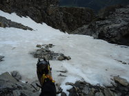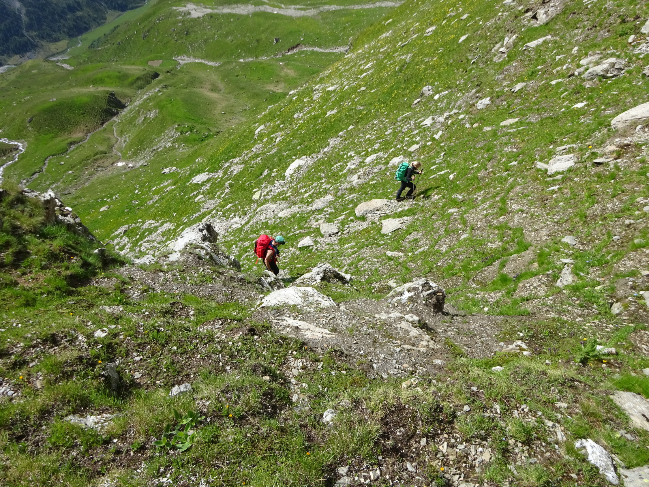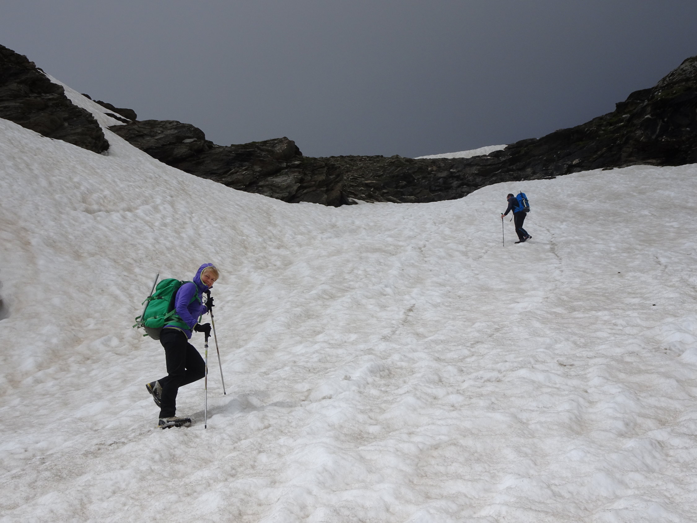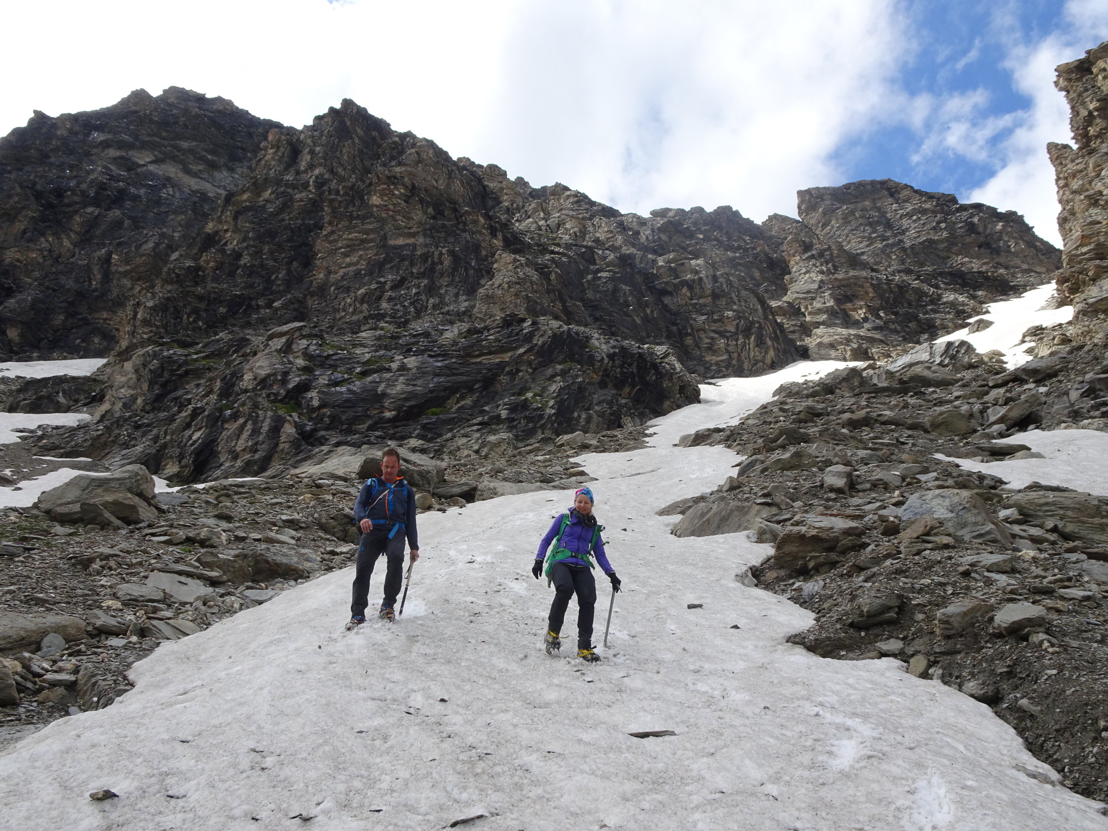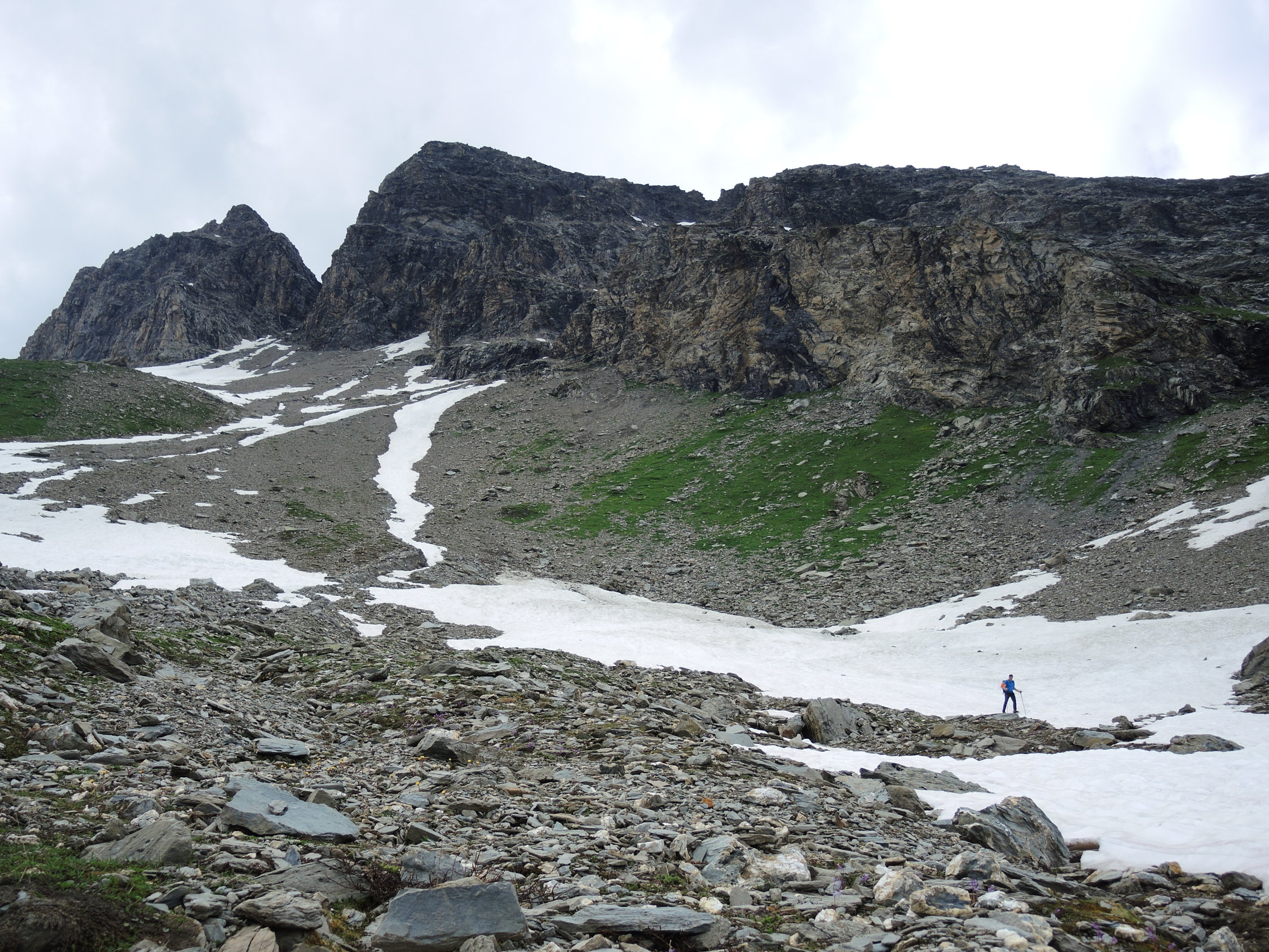 oberhalb des Seeleins befand sich noch ein grösseres, gut zu begehendes Schneefeld (angenehmer als Geröll!), das bis zu dem kleinen Sattel südlich von P. 3119 reichte. Von dort bis zum Grat war der Schutt durchfeuchtet und die Felsen immer wieder nass.