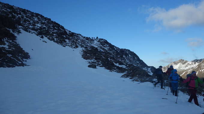 Ab 2900m einiges an Neuschnee und der Gletscher auch komplett schneebedeckt. Somit das Matscher Wandl kein Problem, einfach raufstapfen.