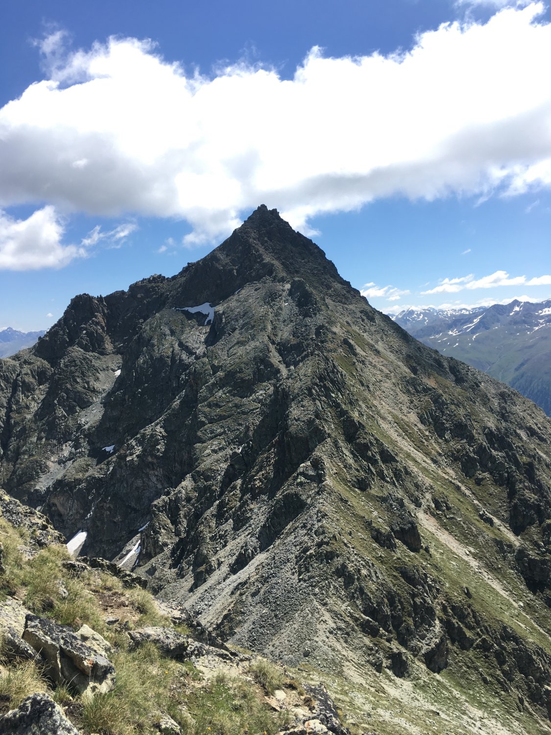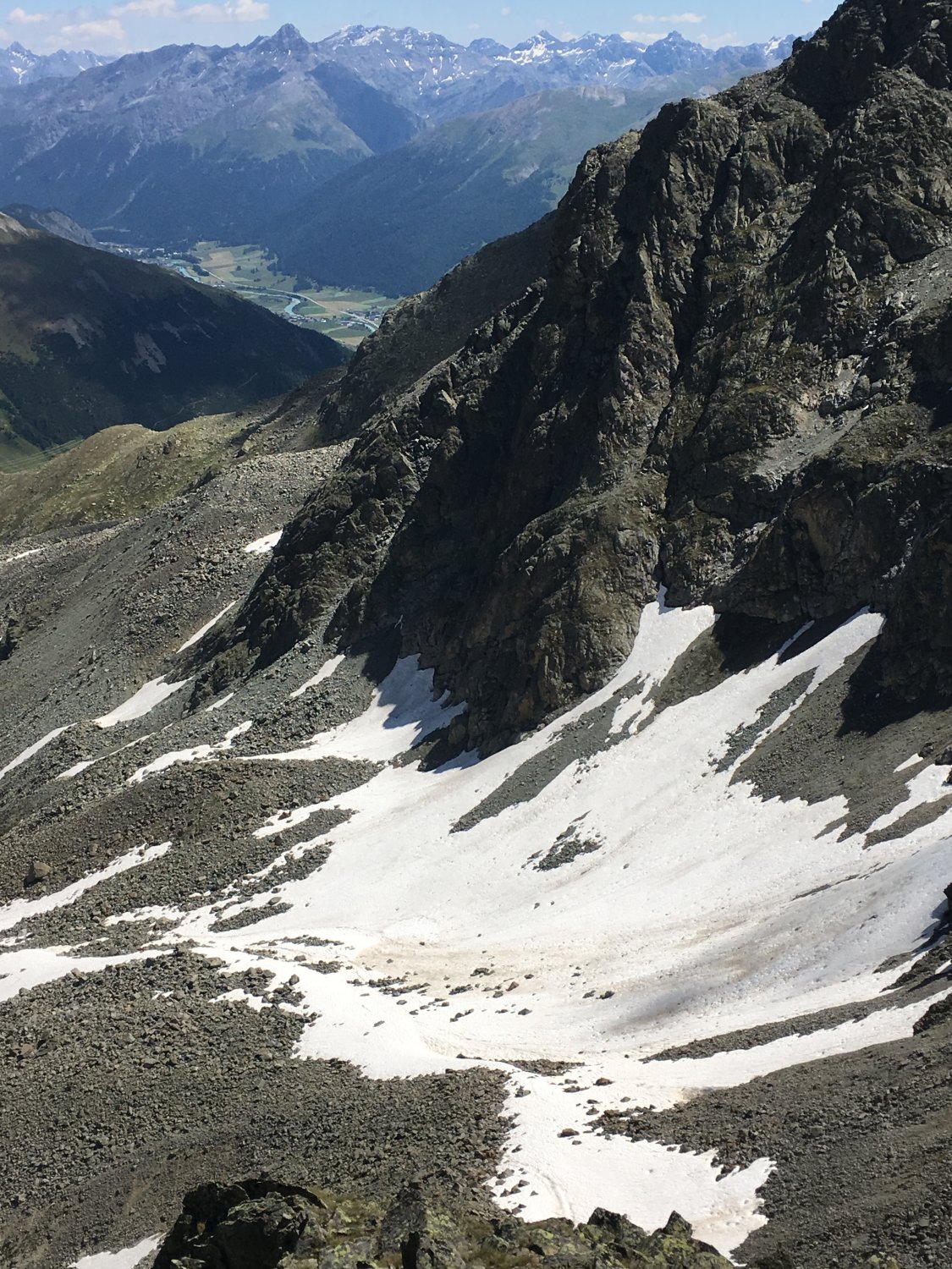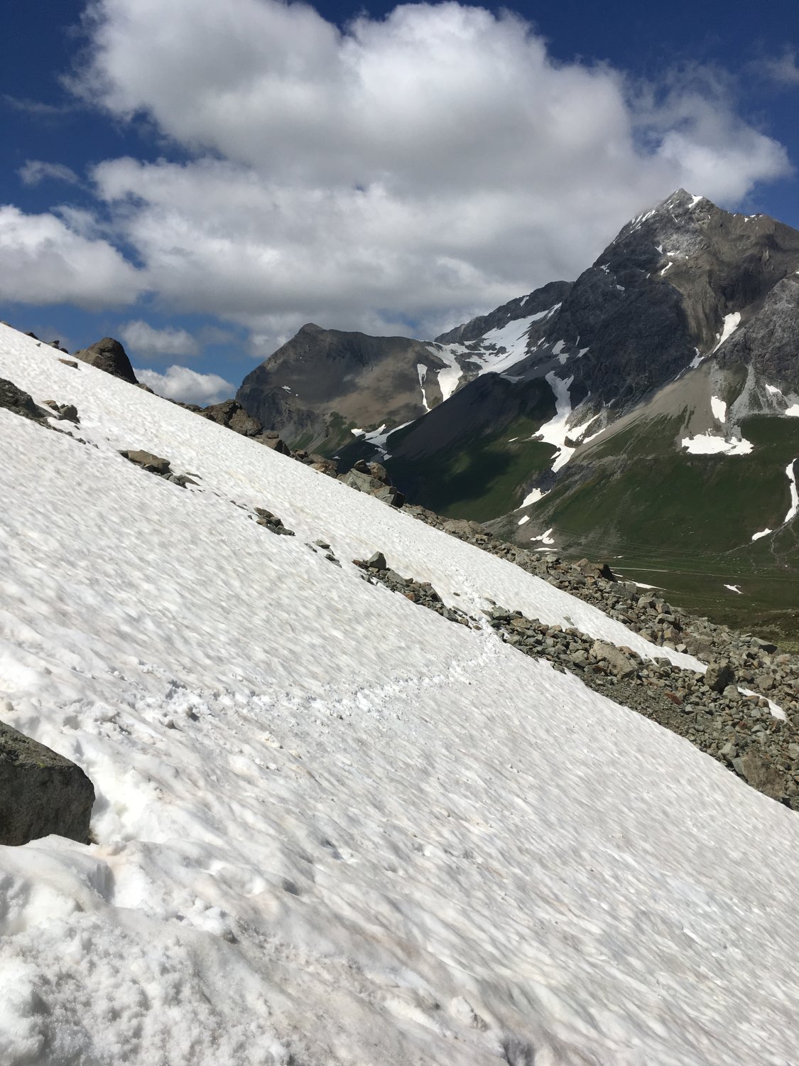Start Parkplatz Chamanna d´Es-Cha Punta Granda 2255 m, 8 Grad, Nordwind. Bin über Kuhweiden Val Bella bis zum schönen Seelein unterhalb P. 2442 gelaufen. Nun über Blöcke bis zum ersten Schneefeld, die Felsen waren unangenehm rutschig, viele Flechten waren noch nass. Ab Höhe 2550 m über Schneefelder bis unterhalb Fuorcla Taverna 2737, mit kurzen Unterbrechungen, Nun Wegspuren bis Fuorcla Taverna. Wunderschöne Aussicht nach Süden. Nun steil die Ostflanke hinauf, grasbewachsen und hie und da Schutt und Felsen, am besten nahe am Grat bleiben. Abstieg wie Aufstieg, die zahlreichen Schneefelder erleichtern den Auf- und Abstieg sehr. Schöne einsame Tour, bin niemandem begegnet. Aufstieg 3.5, Abstieg 2.5 Stunden. T4.