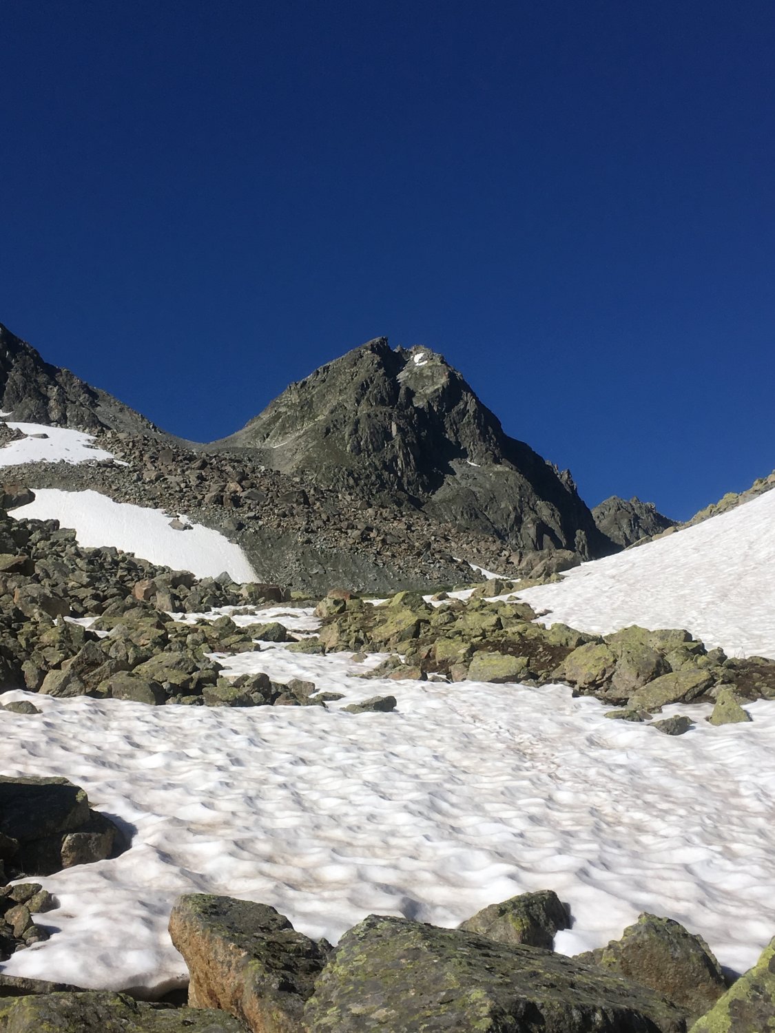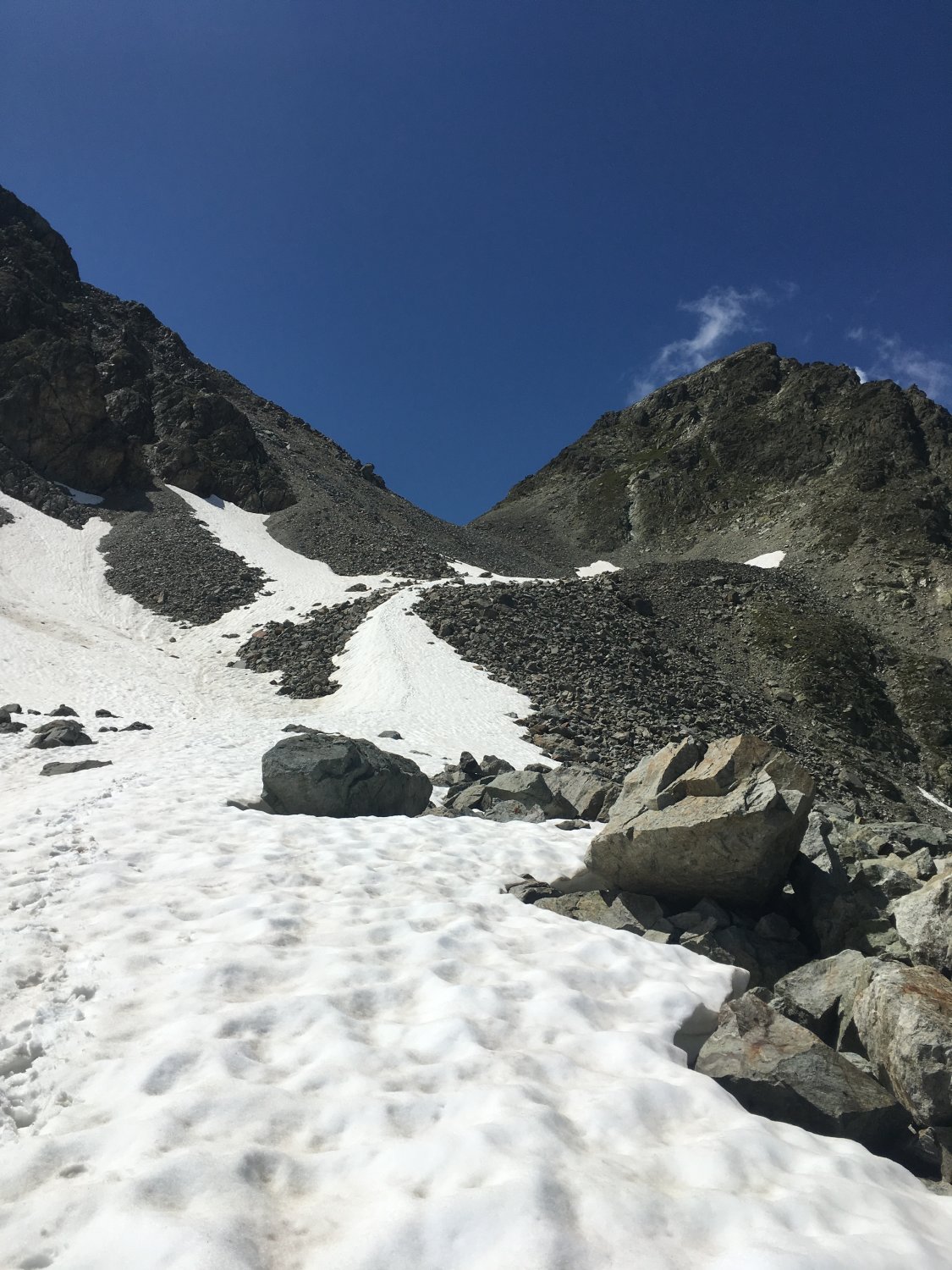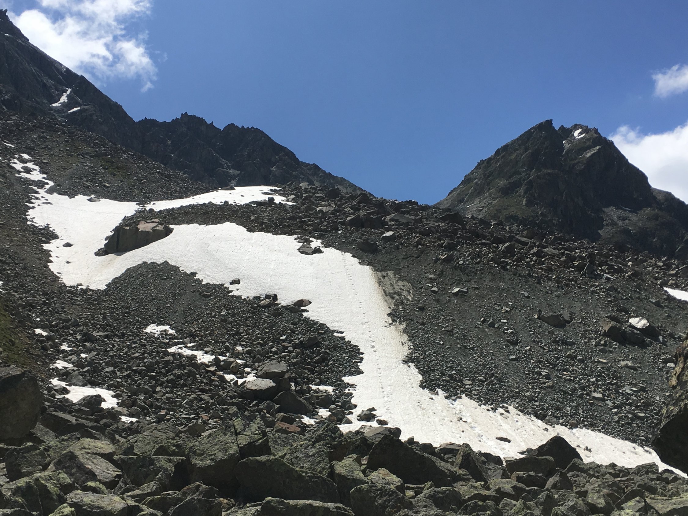 Bleibt in den nächsten Tagen gut. Die Tour nur um Frühsommer unternehmen, wenn noch zahlreiche Schneefelder vorhanden, sonst viele Blöcke und sehr mühsam. Bis fast zuunterst ohne Steigeisen machbar.
