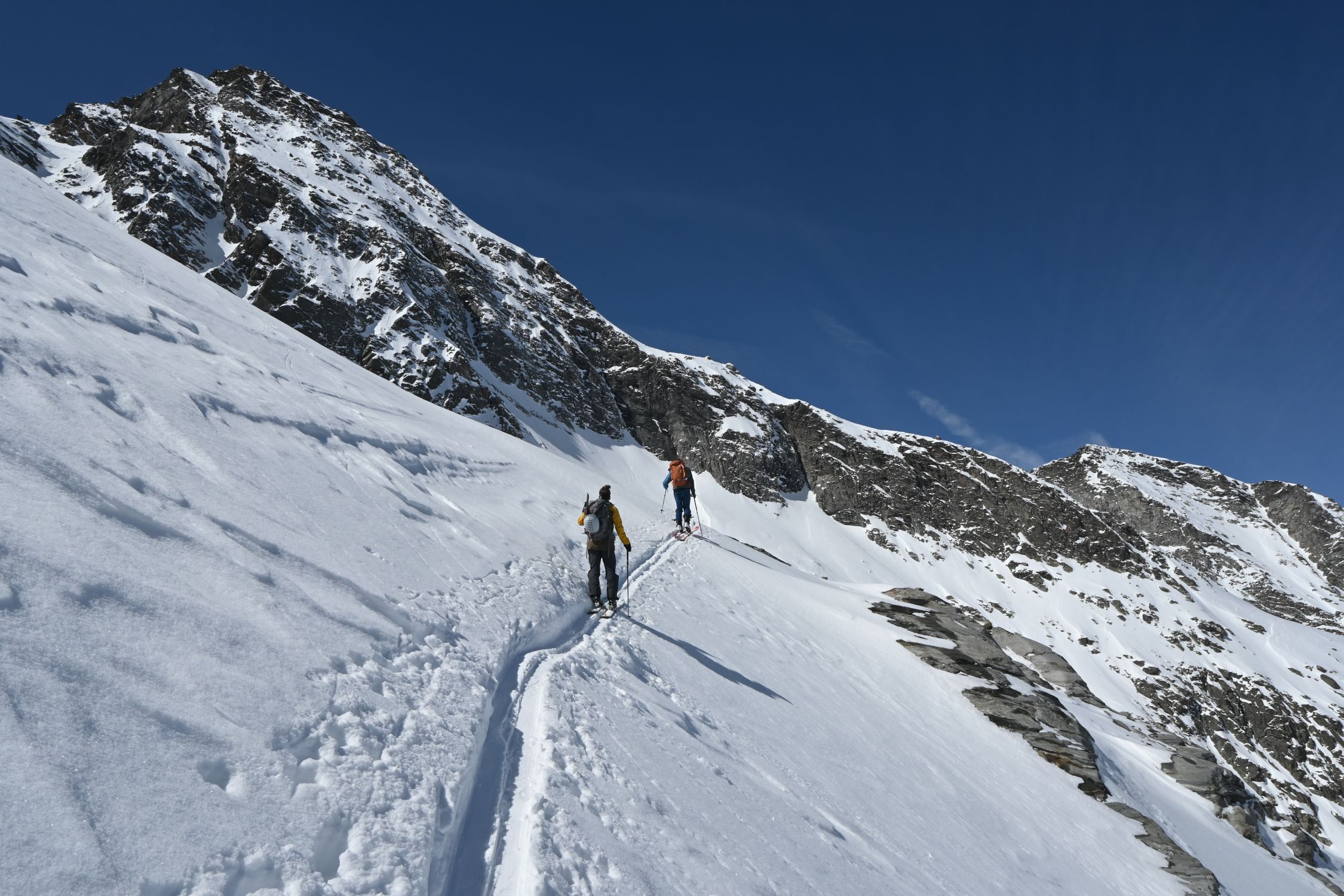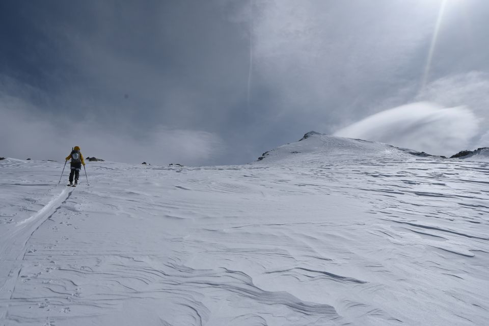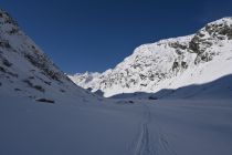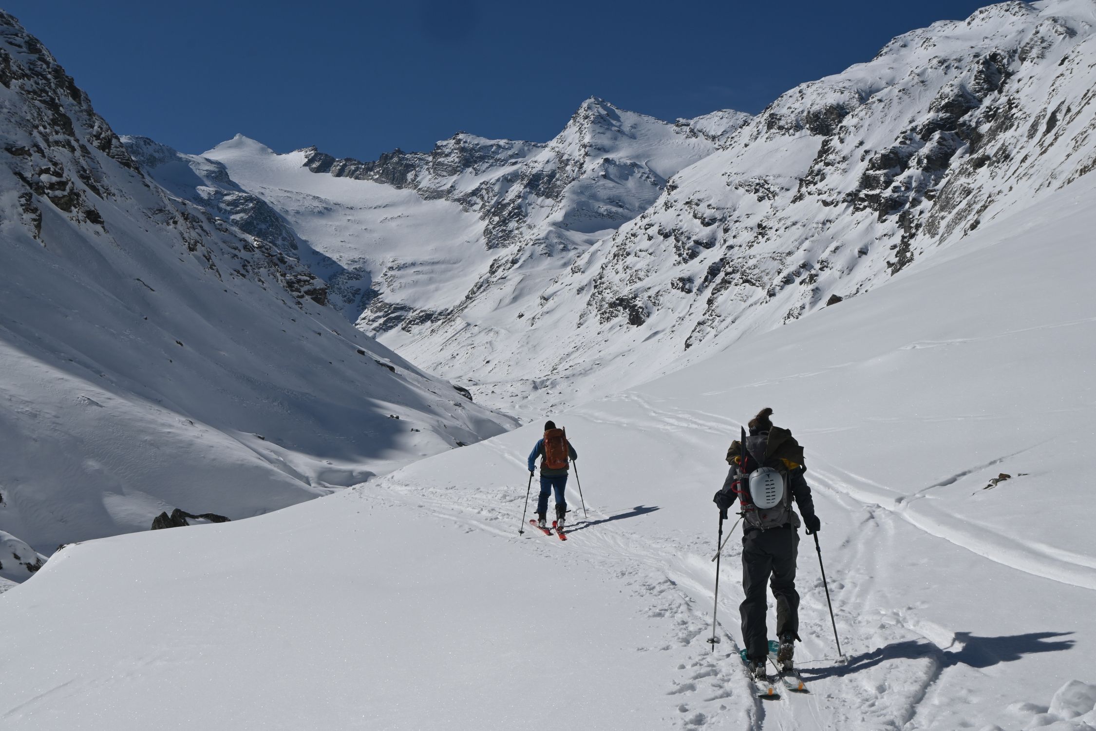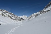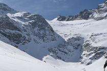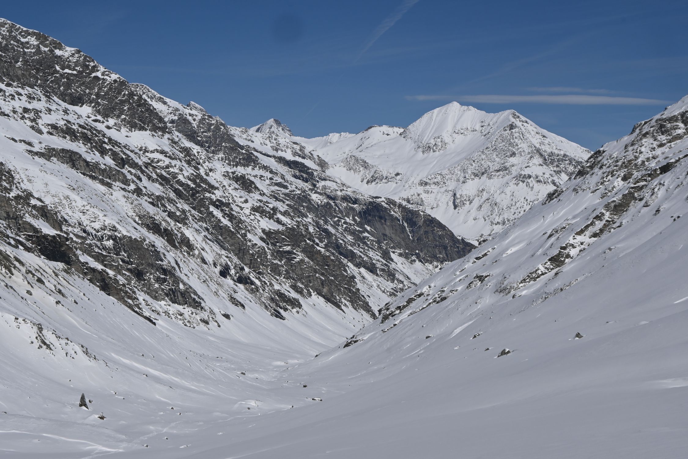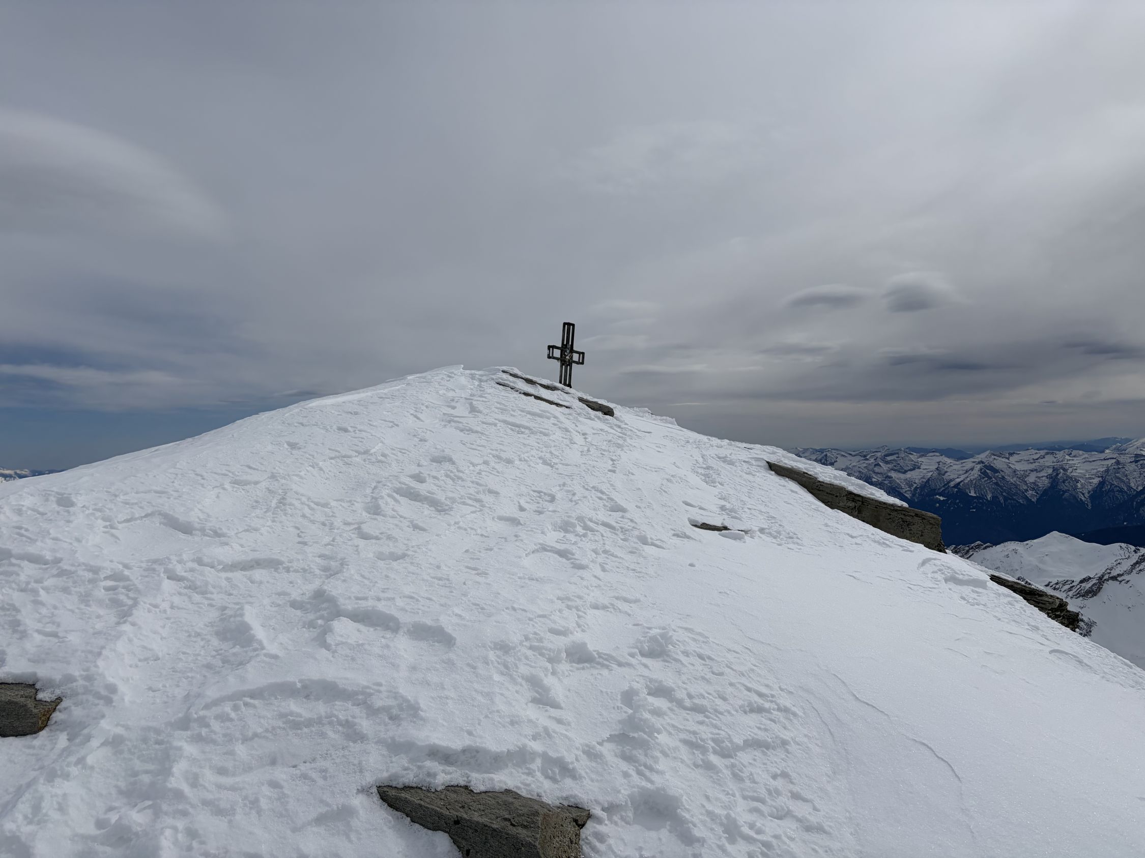 Wenig, aber ausreichend Schnee auf der ganzen Route. Aufstieg sehr gut (Merci für die super angelegte Spur der Gruppe, die zur Zapporthütte gewechselt hat). Gipfelaufstieg ca. 70-80hm zu Fuss mit Steigeisen sehr gut zu gehen, wäre auch ohne gegangen. Im der Abfahrt wechselnde Bedingungen, aber nicht schlecht zu fahren. Auch im Hüttenzustieg ausrechend Schnee.