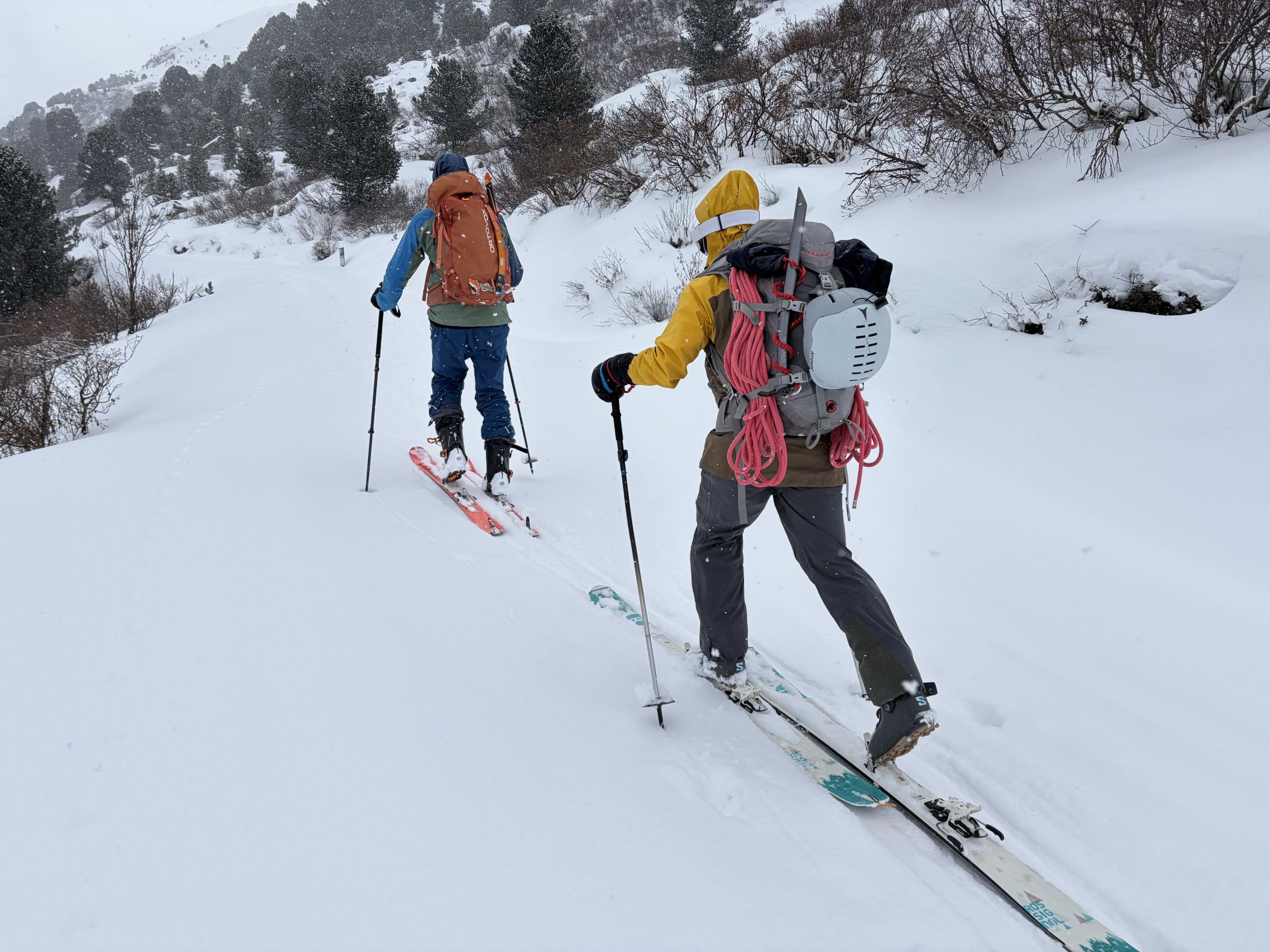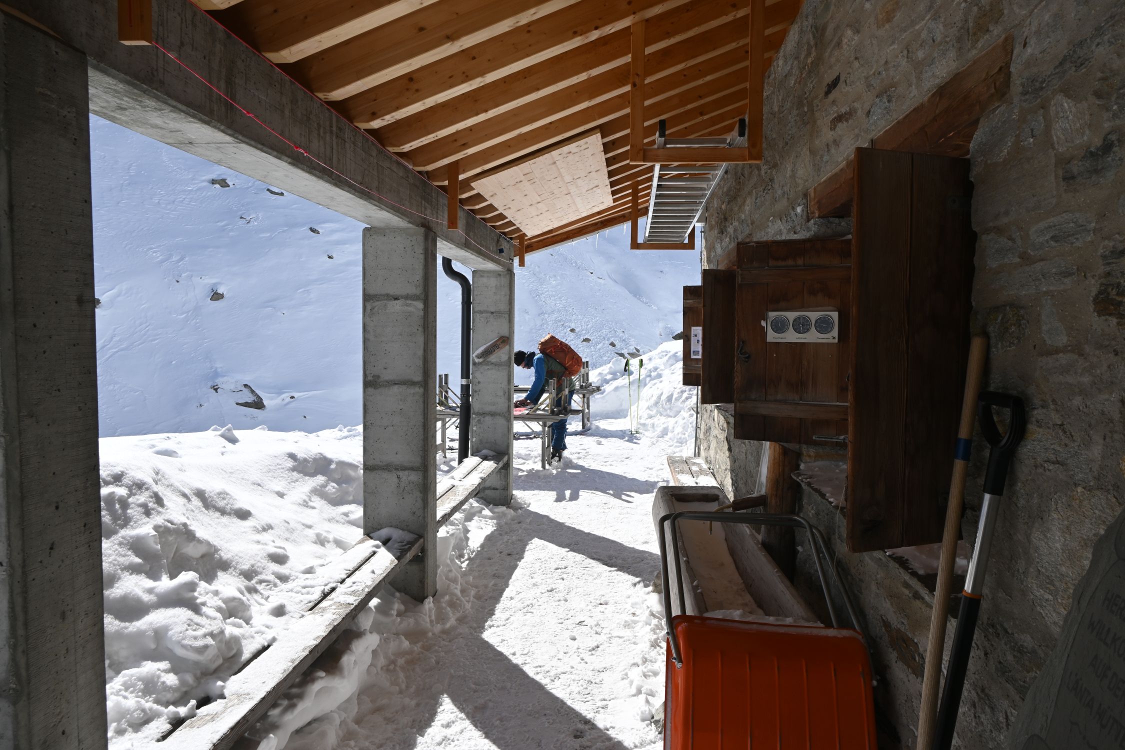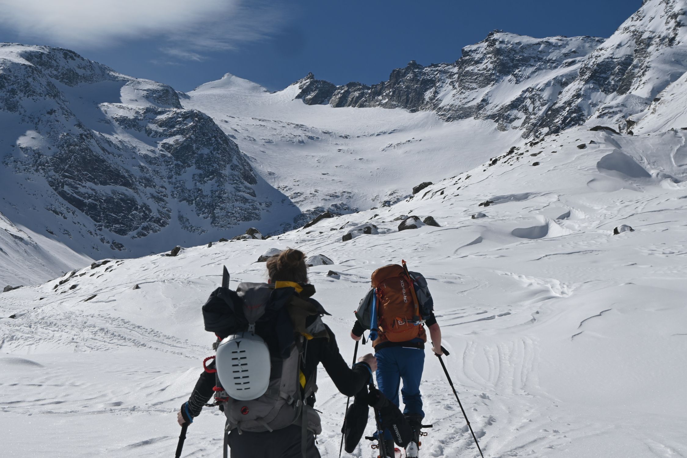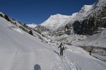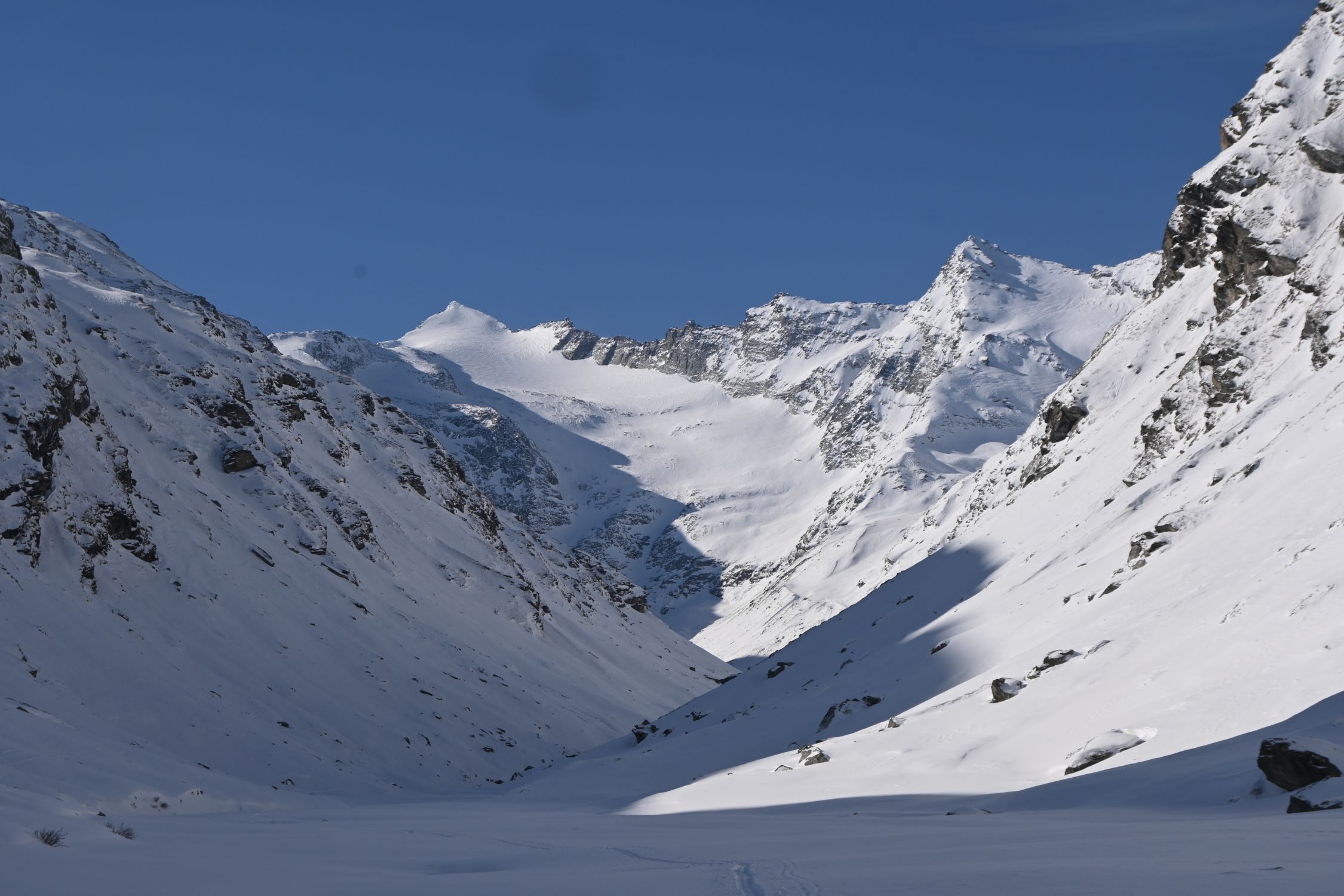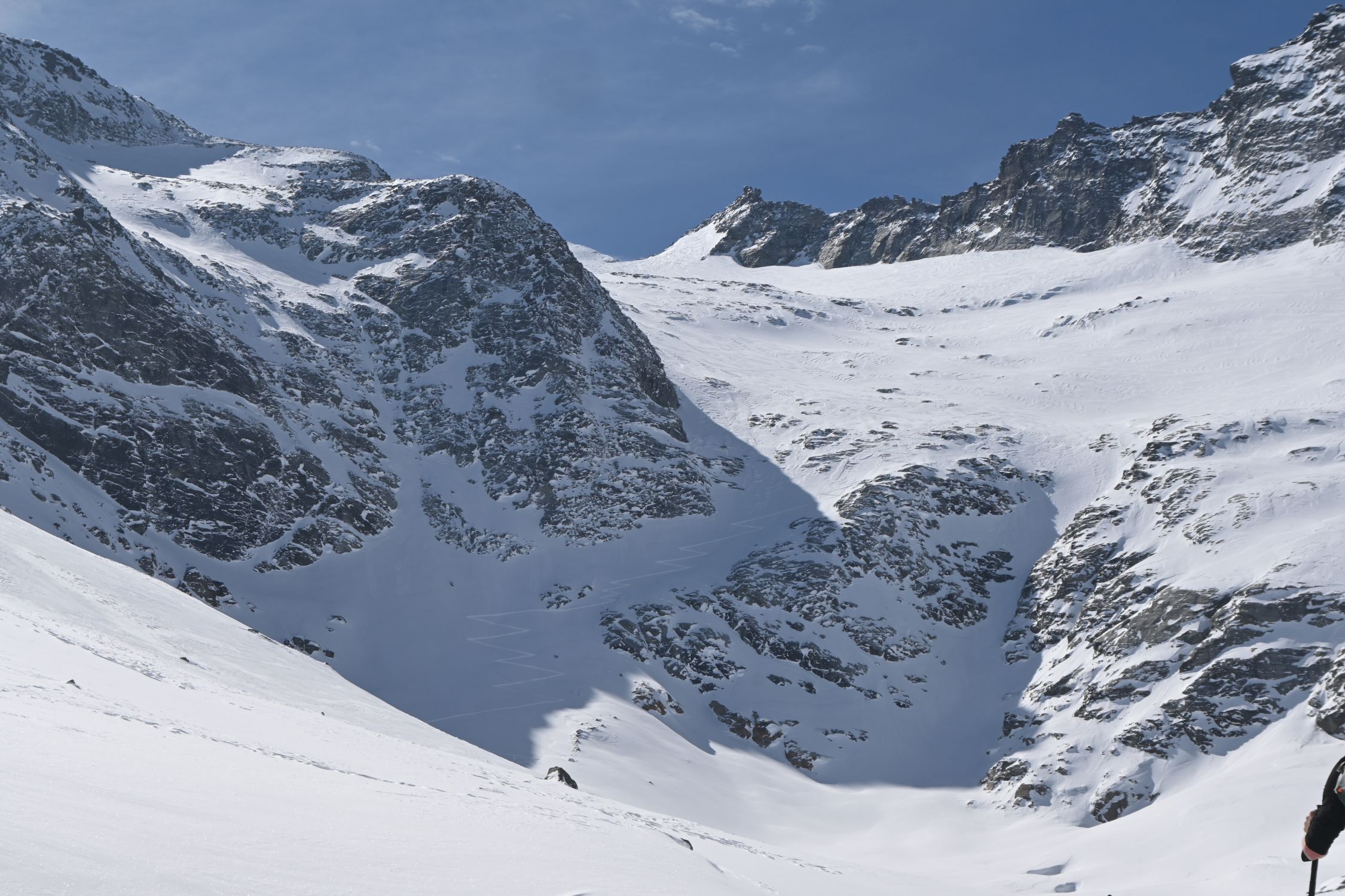 Wenig, aber ausreichend Schnee auf der ganzen Route. Aufstieg sehr gut (Merci für die super angelegte Spur der Gruppe, die zur Zapporthütte gewechselt hat). Gipfelaufstieg ca. 70-80hm zu Fuss mit Steigeisen sehr gut zu gehen, wäre auch ohne gegangen. Im der Abfahrt wechselnde Bedingungen, aber nicht schlecht zu fahren. Auch im Hüttenzustieg ausrechend Schnee.